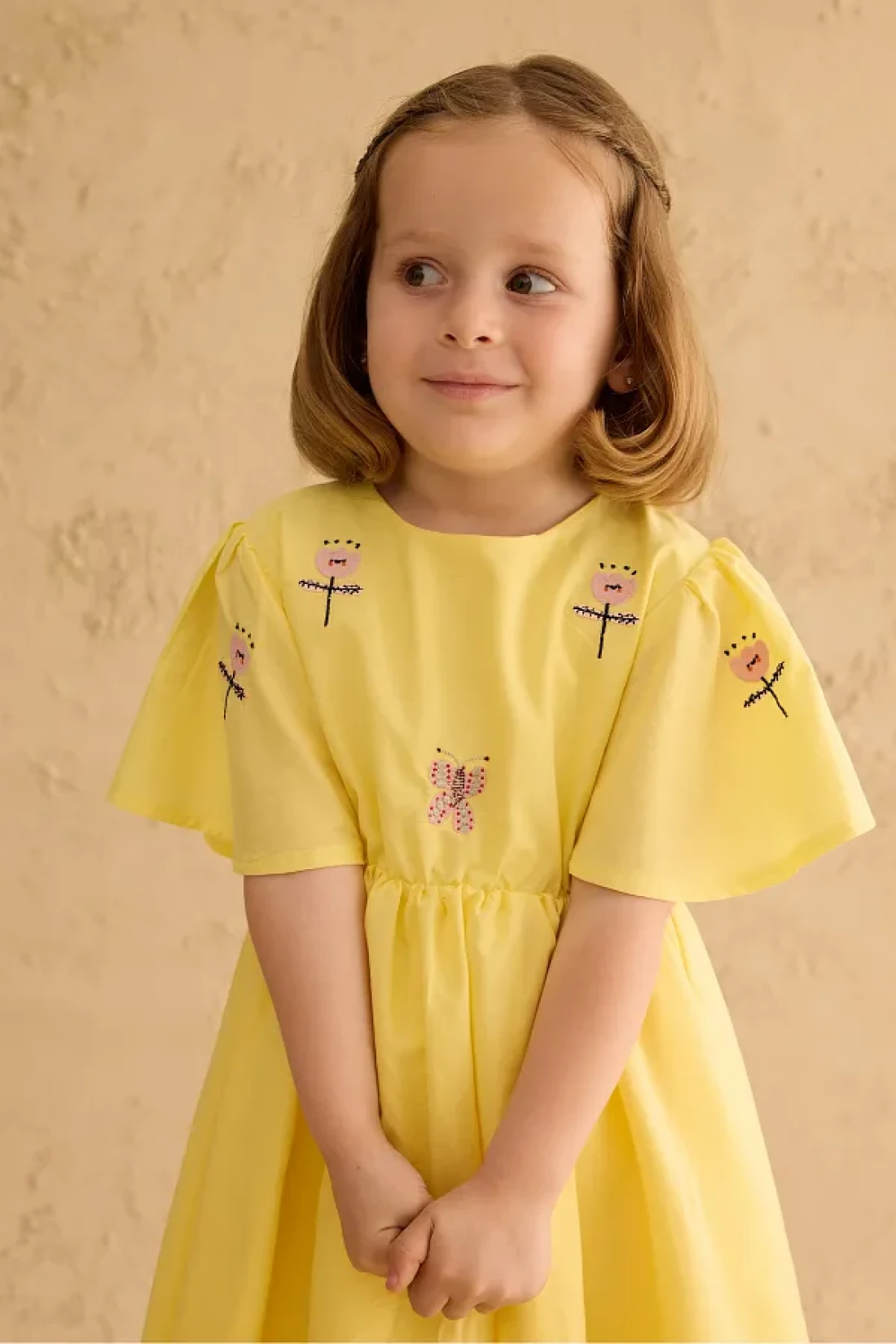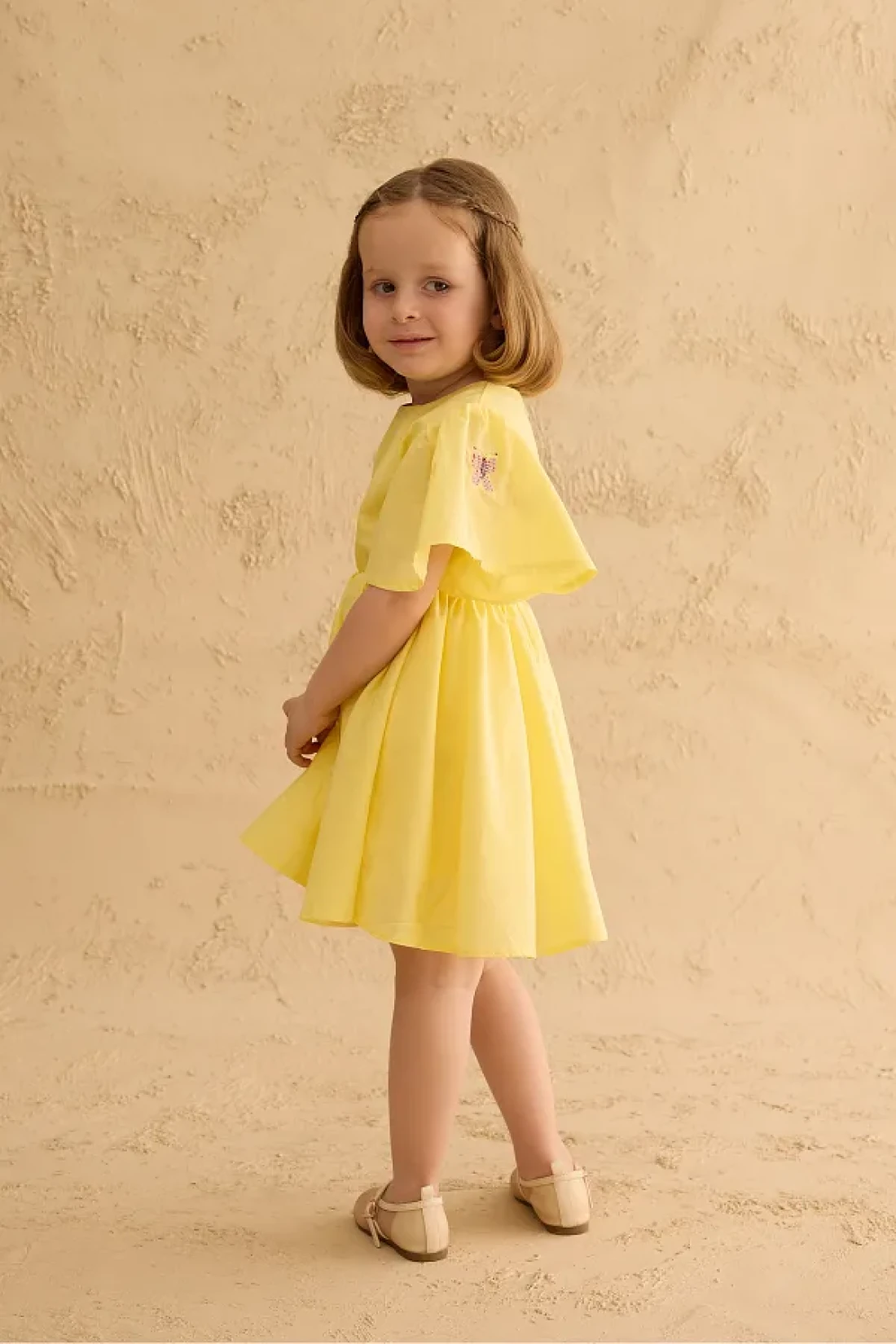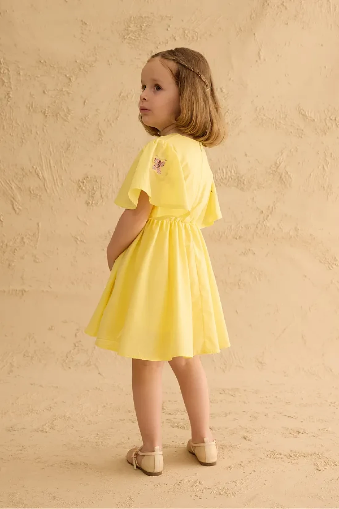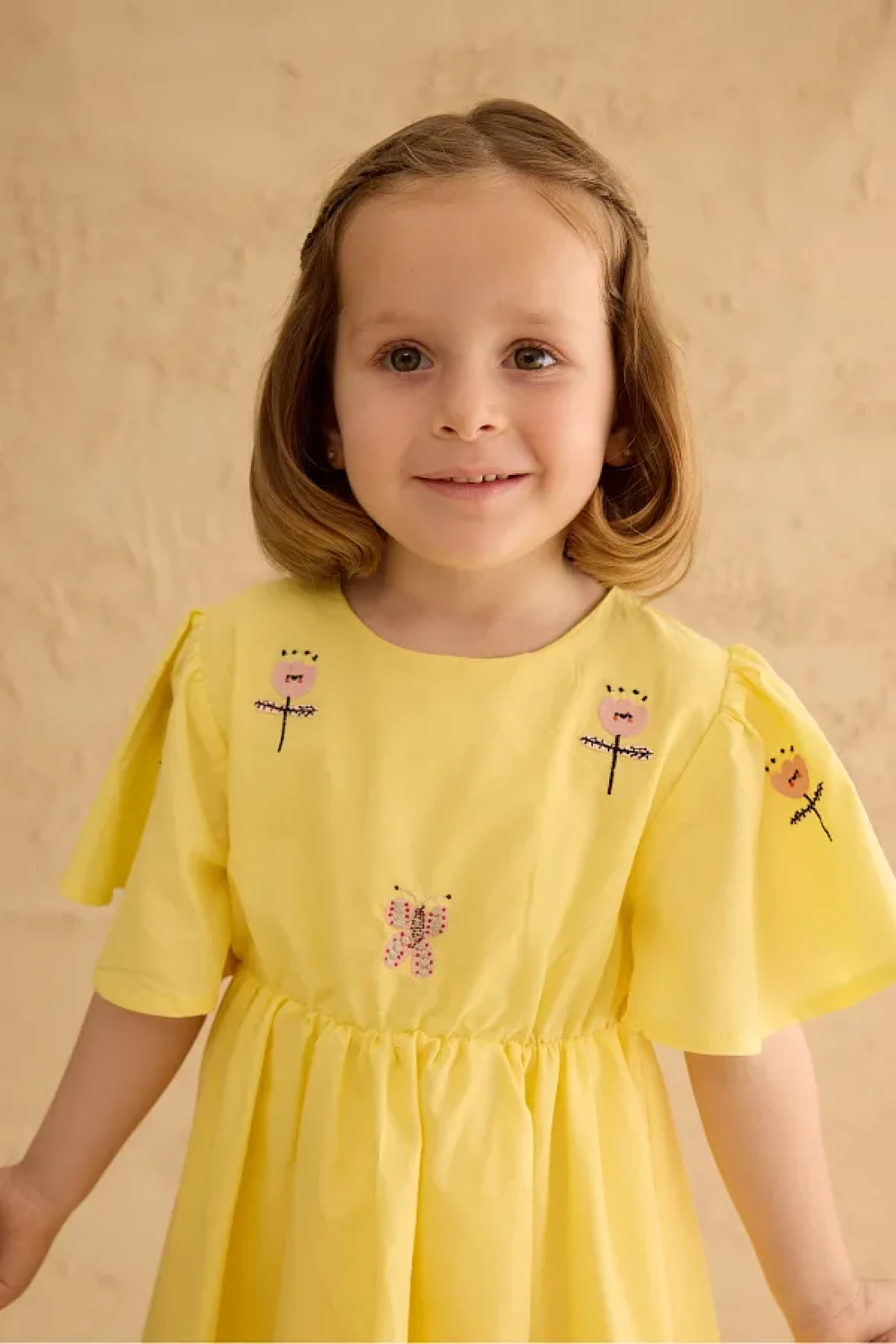فستان مصنوع من قماش الفوال القطني 100%، بأكمام قصيرة مكشكشة، وإغلاق بسحاب في الخلف، وتفاصيل مطرزة، وخصر مرن رفيع.