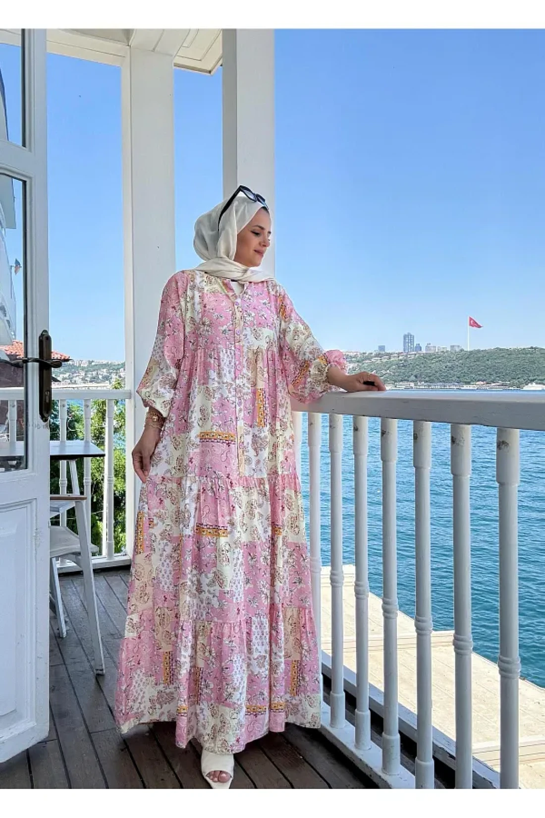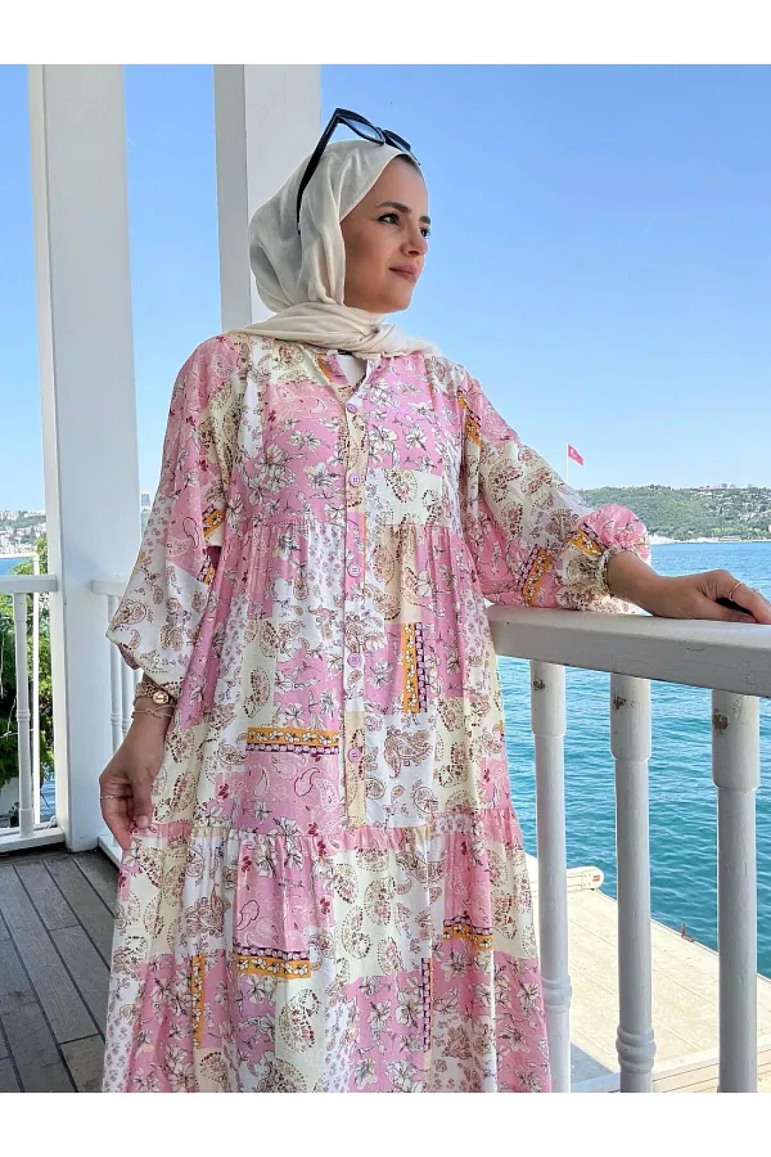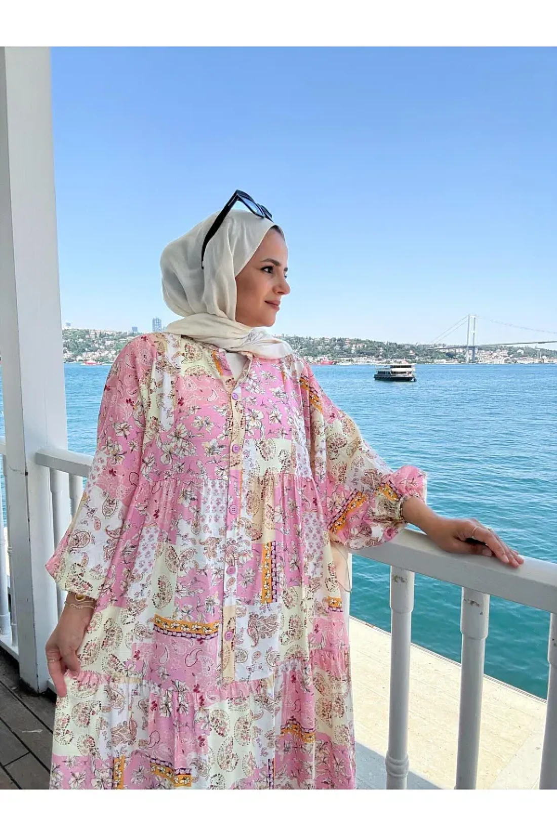 Aselim Hijap Moda فستان صيفي منقوش عرقيًا | زر وقص مريح باللون الوردي
