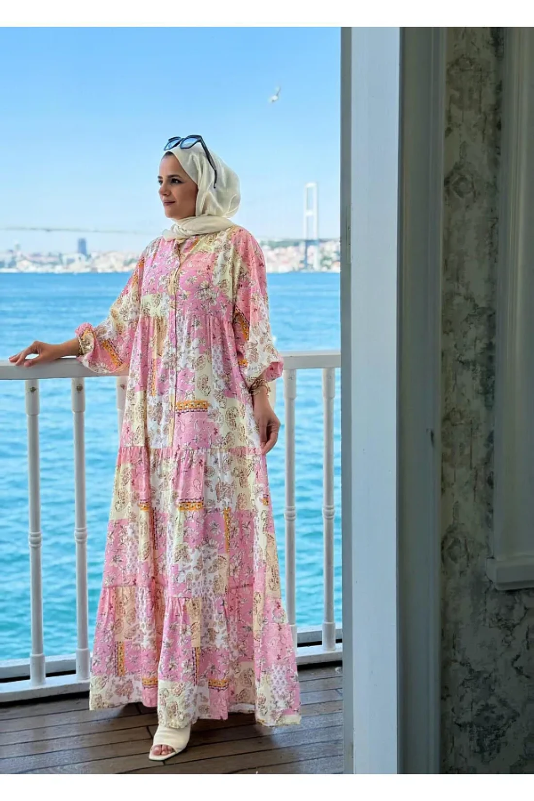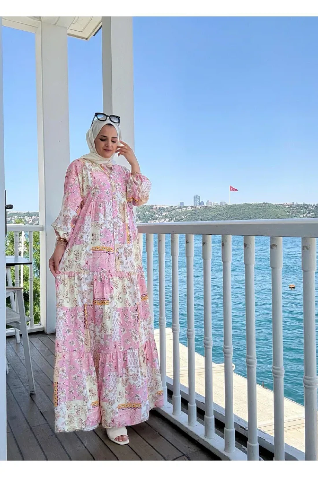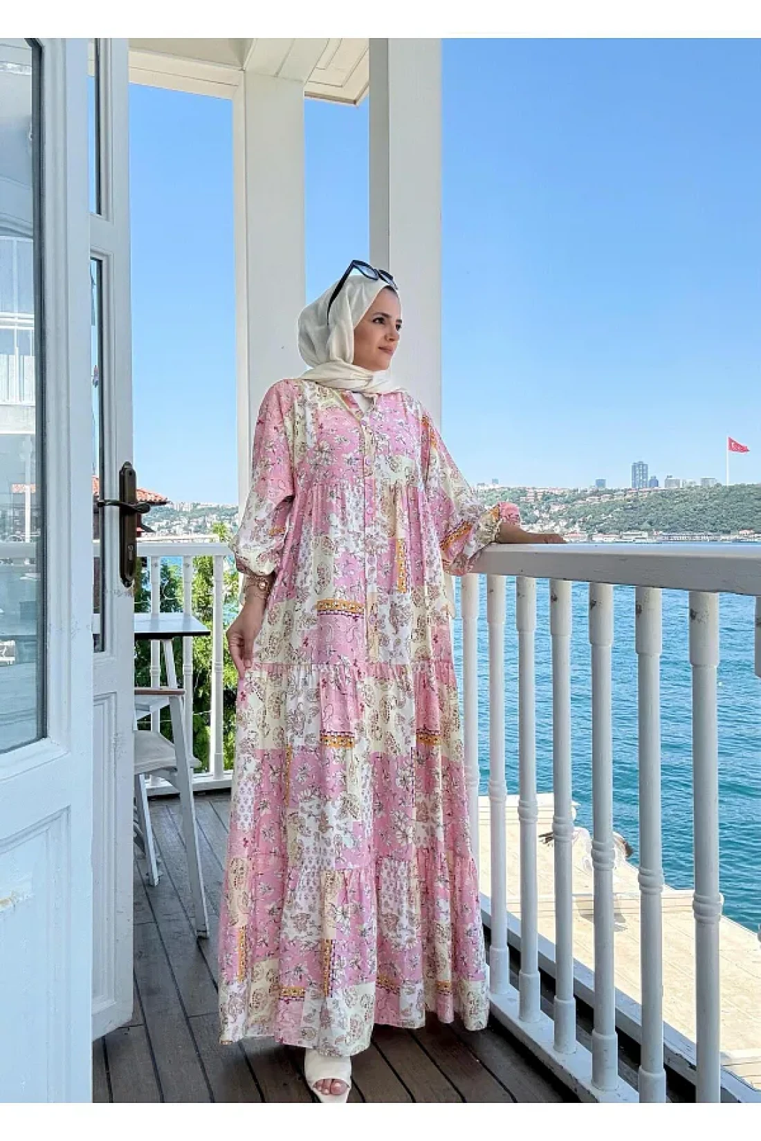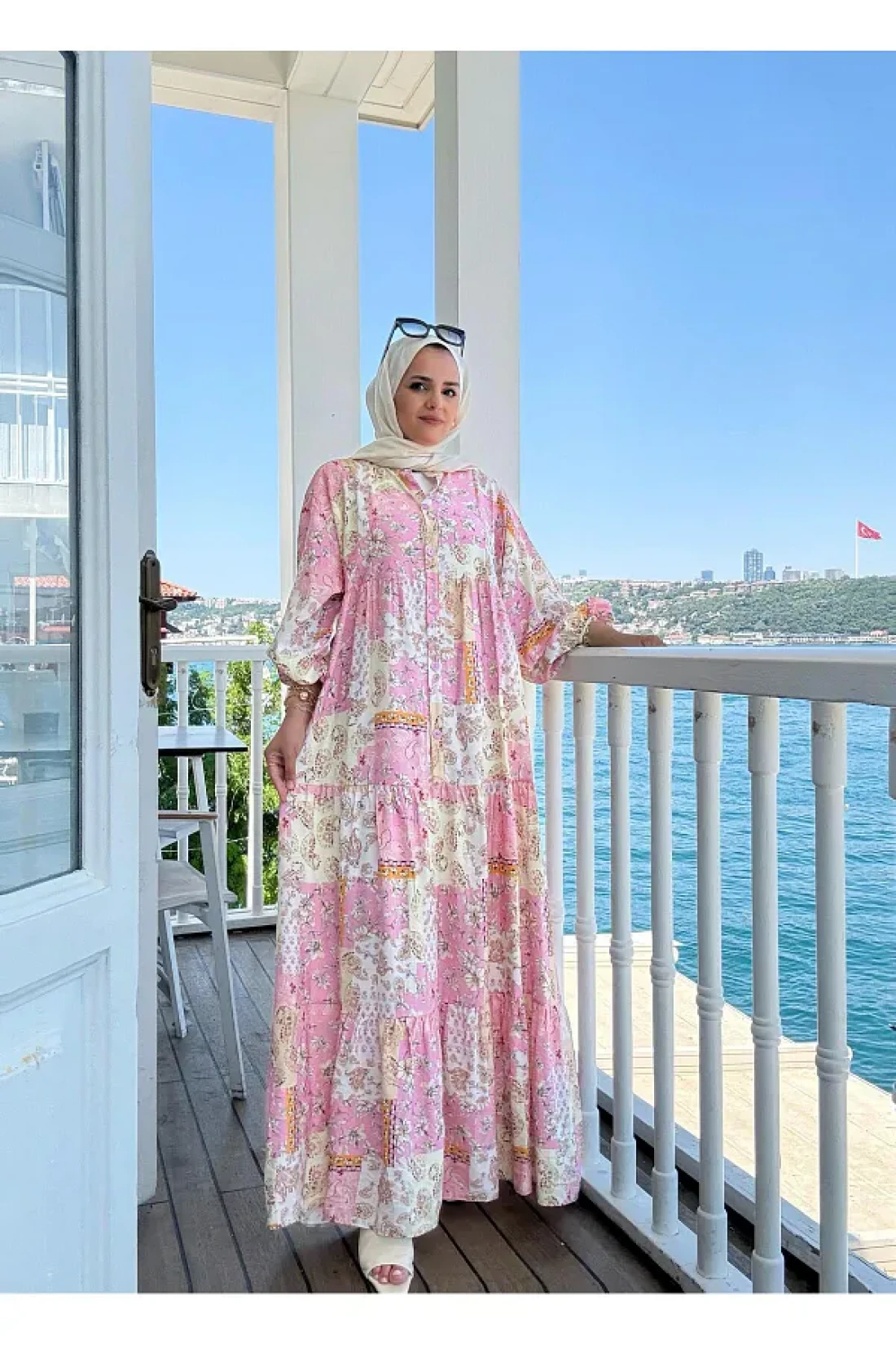 Aselim Hijap Moda فستان صيفي منقوش عرقيًا | زر وقص مريح باللون الوردي