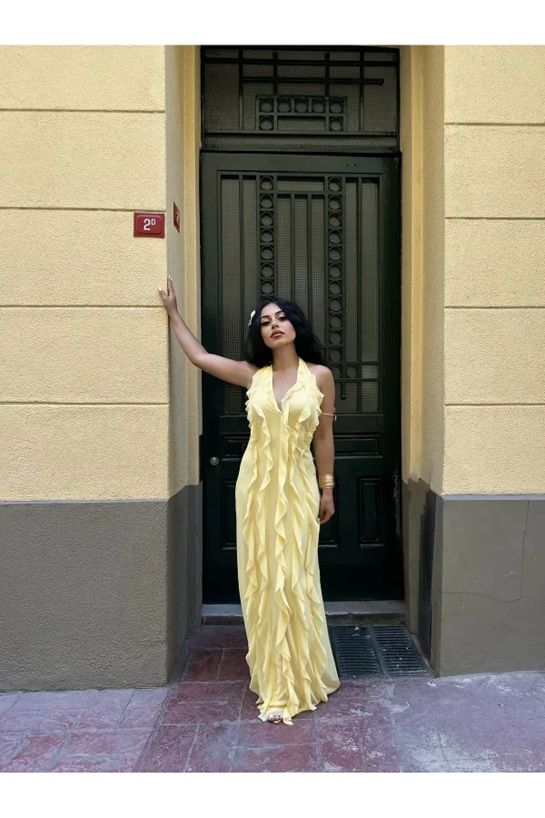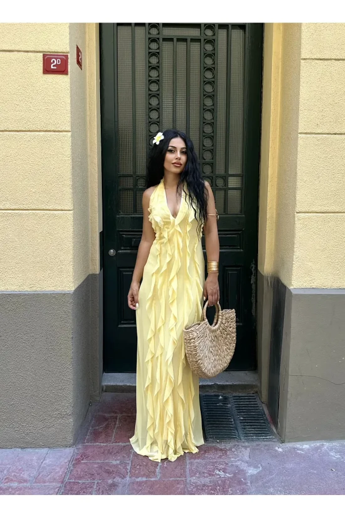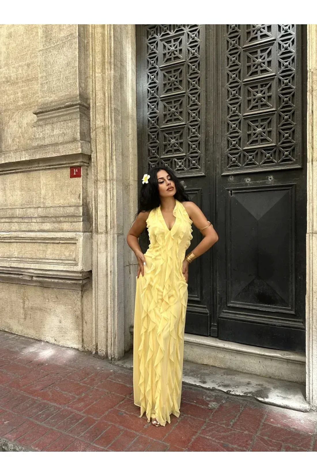 moneta boutique فستان نسائي بتصميم طويل وربطة عنق مكشكشة