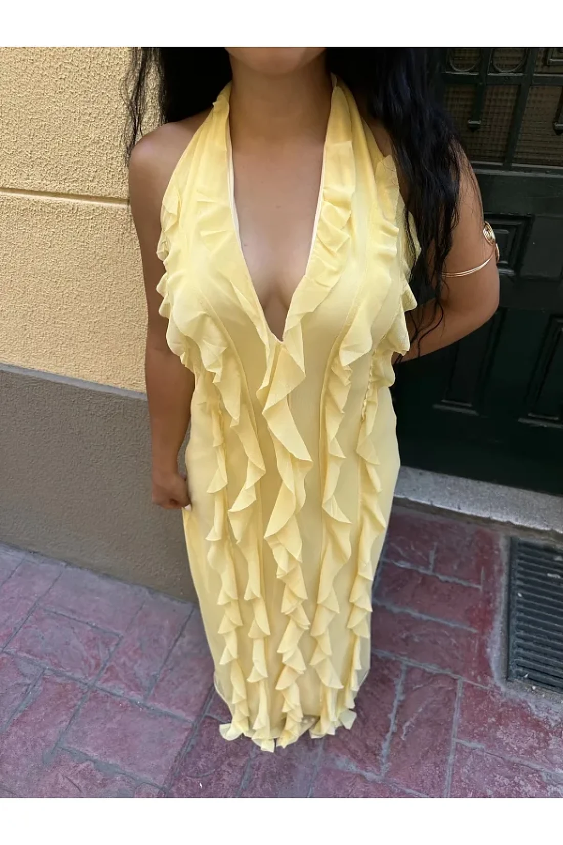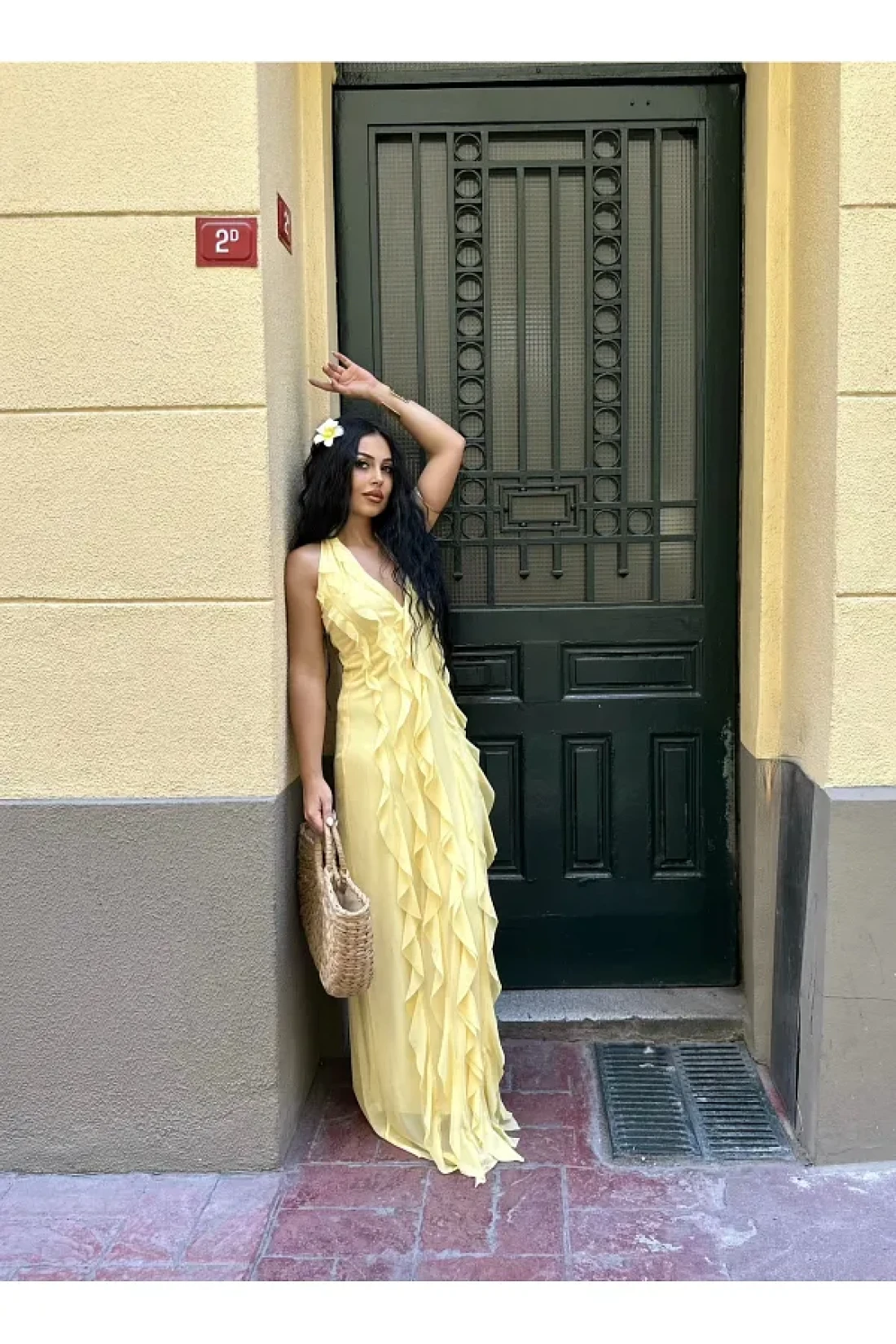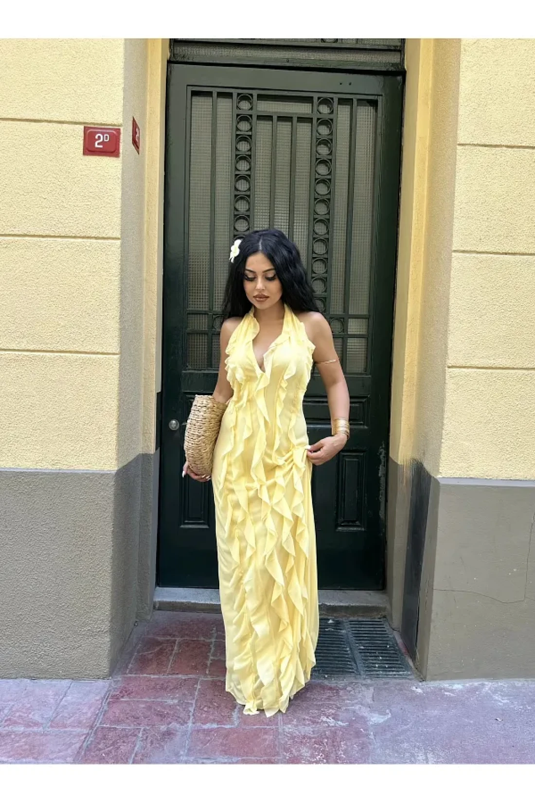 moneta boutique فستان نسائي بتصميم طويل وربطة عنق مكشكشة