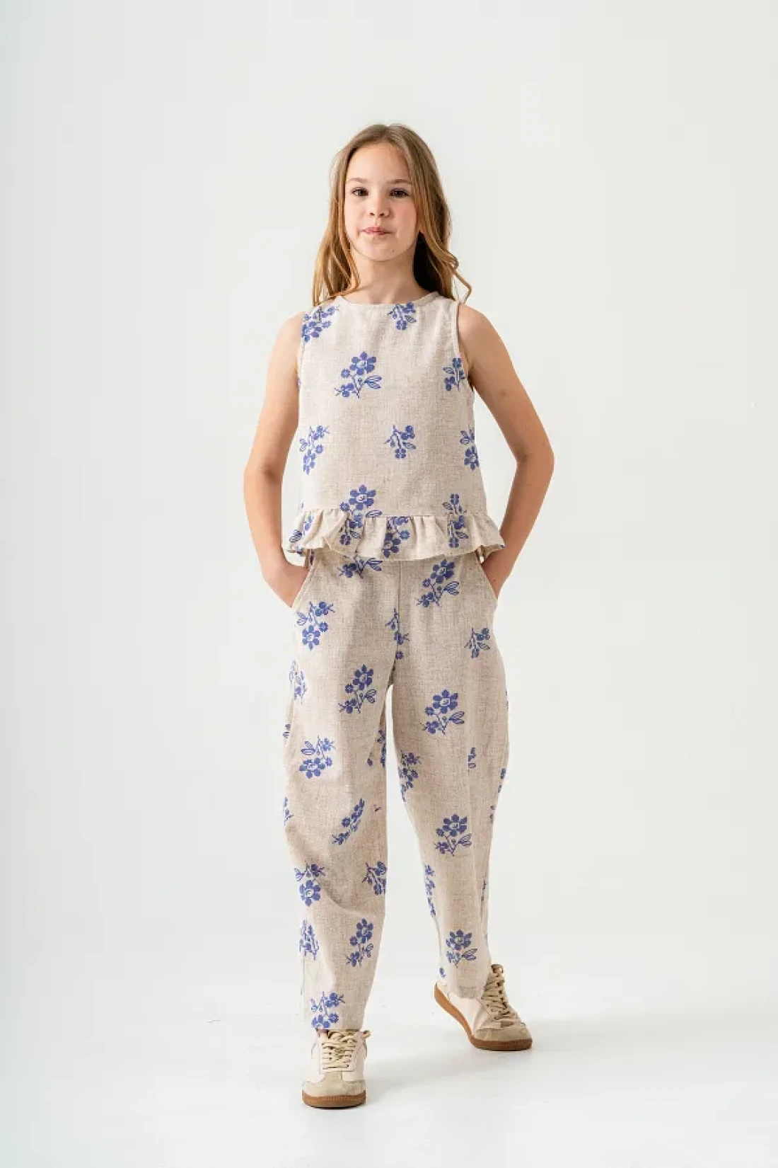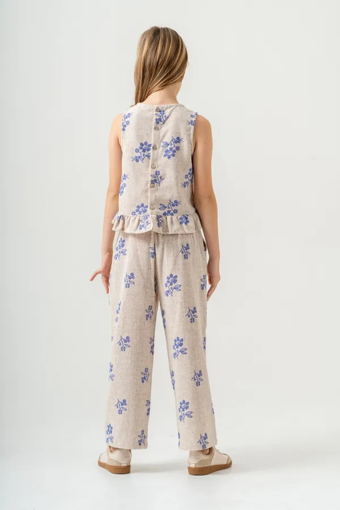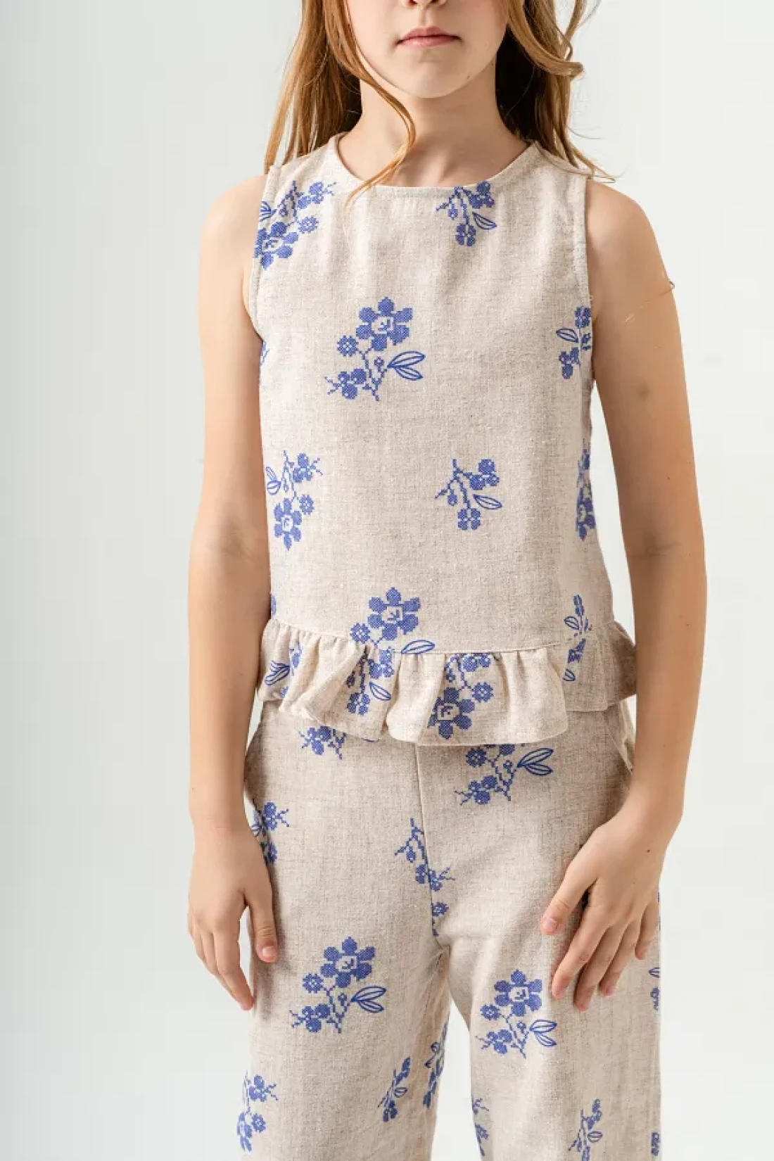 مجموعة الكتان لدينا، المصممة خصيصًا لتجعل فتياتك يشعرن بالأناقة والراحة خلال أشهر الصيف، تتميز ببنيتها الخفيفة. الجزء العلوي بدون أكمام يقدم مظهرًا مبهجًا بطبعاته الملونة.