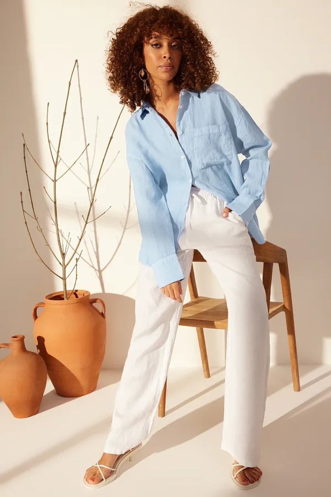 Collection قميص أزرق 100% كتان كبير الحجم TWOSS23GO00443