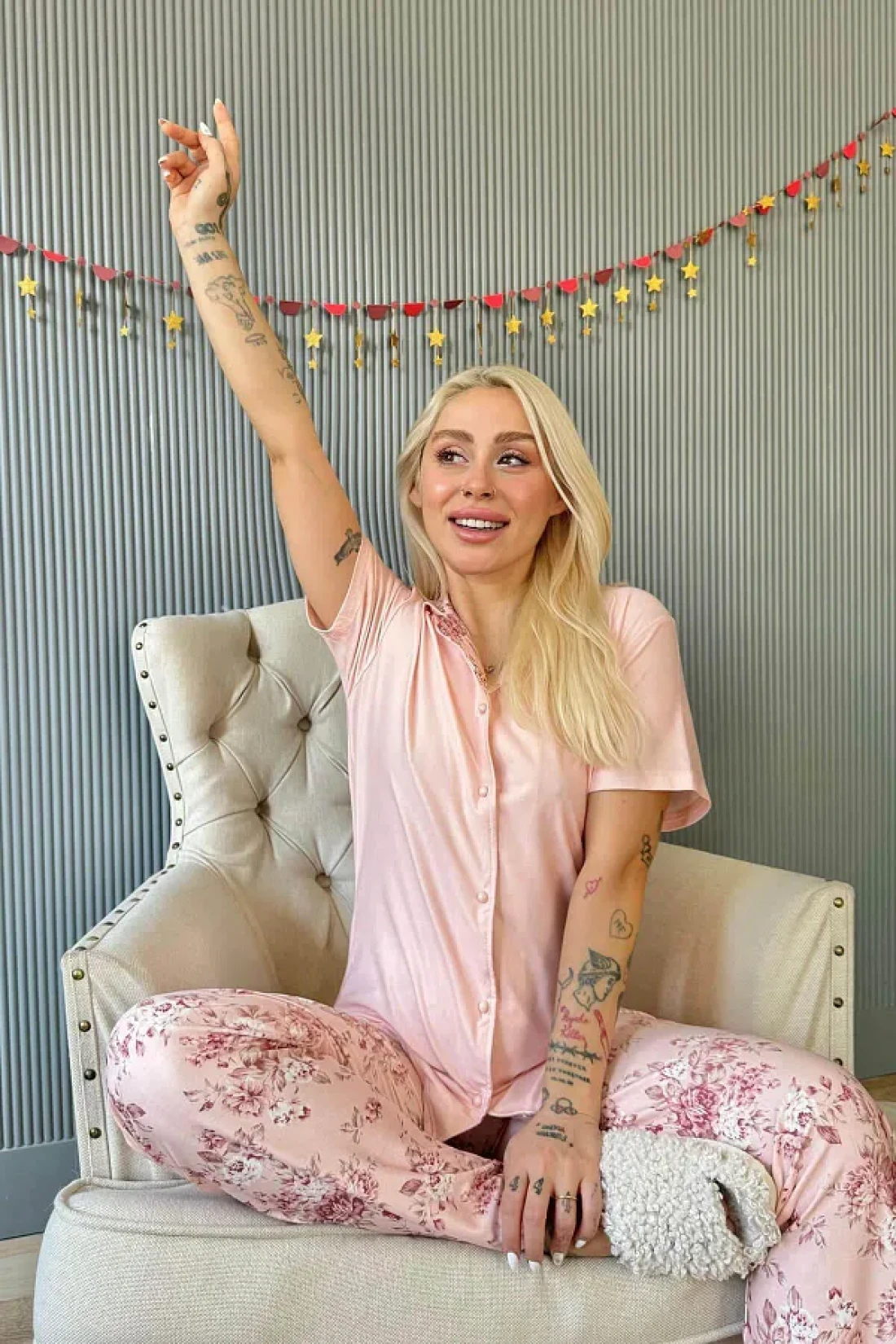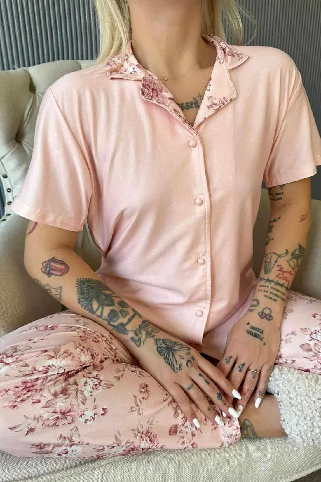 Pijamaevi طقم بيجامة نسائية بأكمام قصيرة وأزرار أمامية حصرية من Mercan Florado