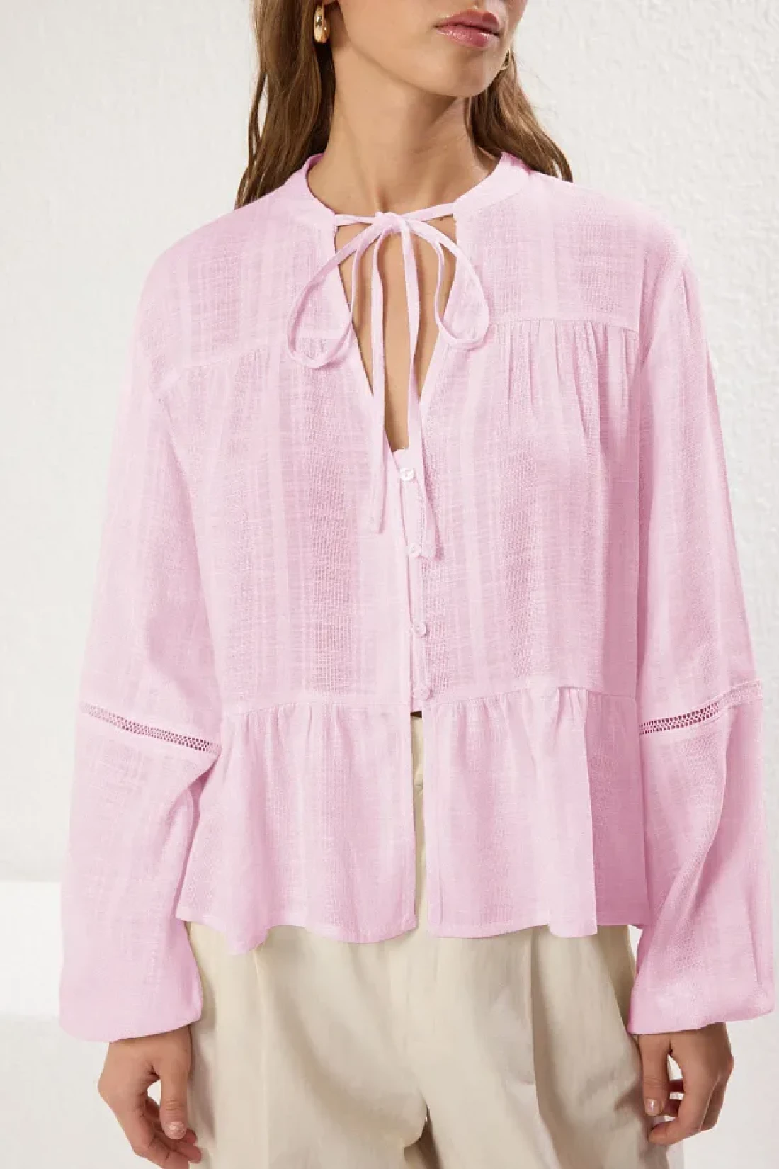 Collection قميص منسوج من القماش القطني باللون الوردي الفاتح مع دانتيل على الأكمام مقاس عادي عادي TWOSS25GO00038