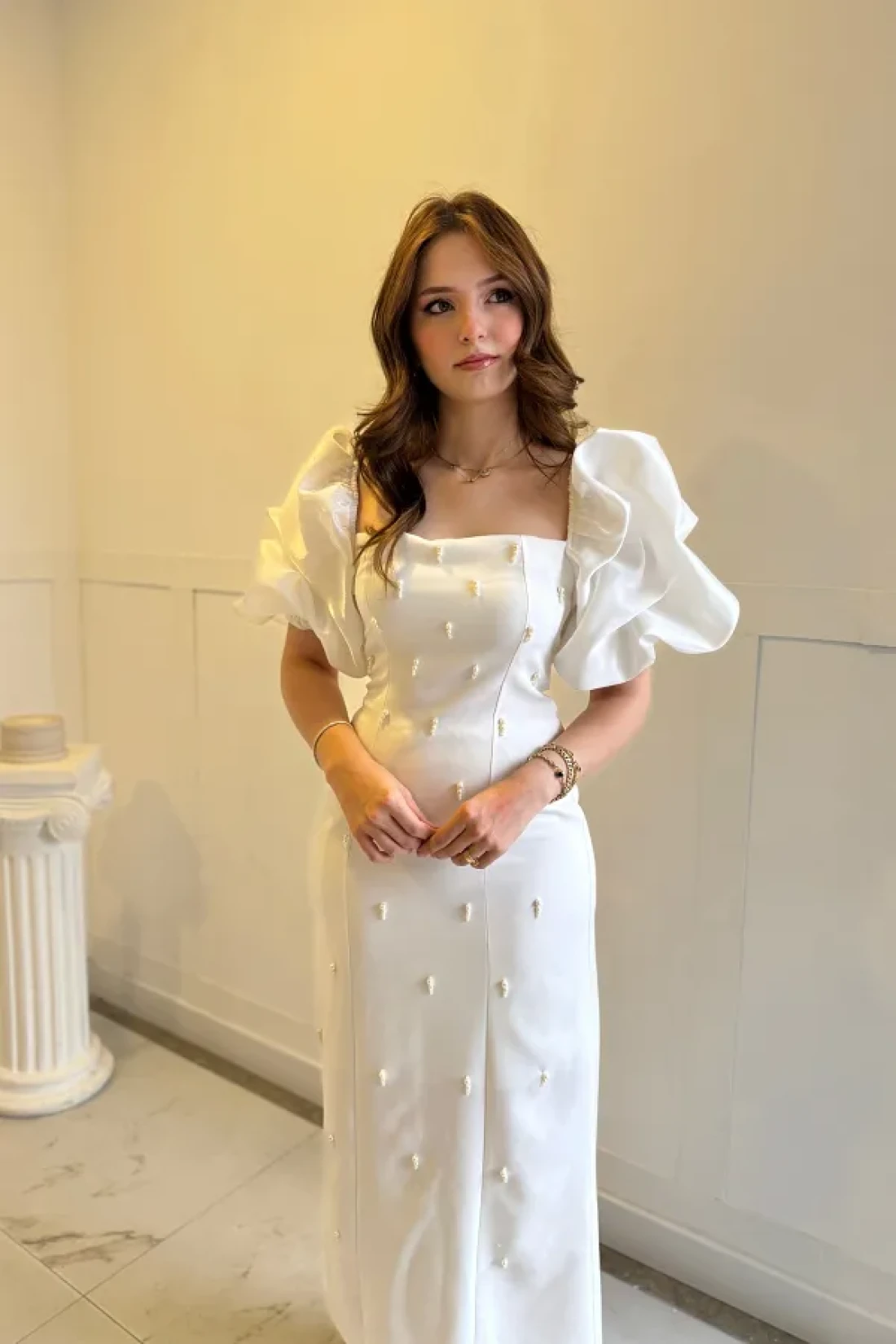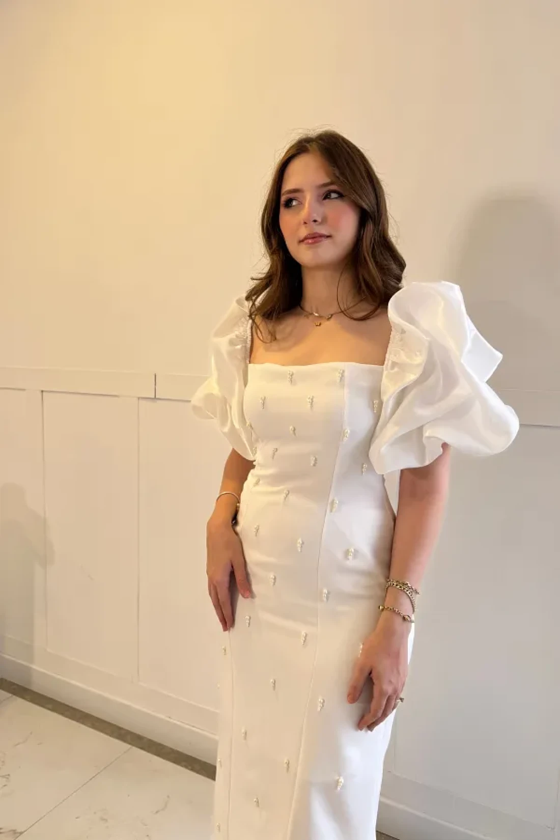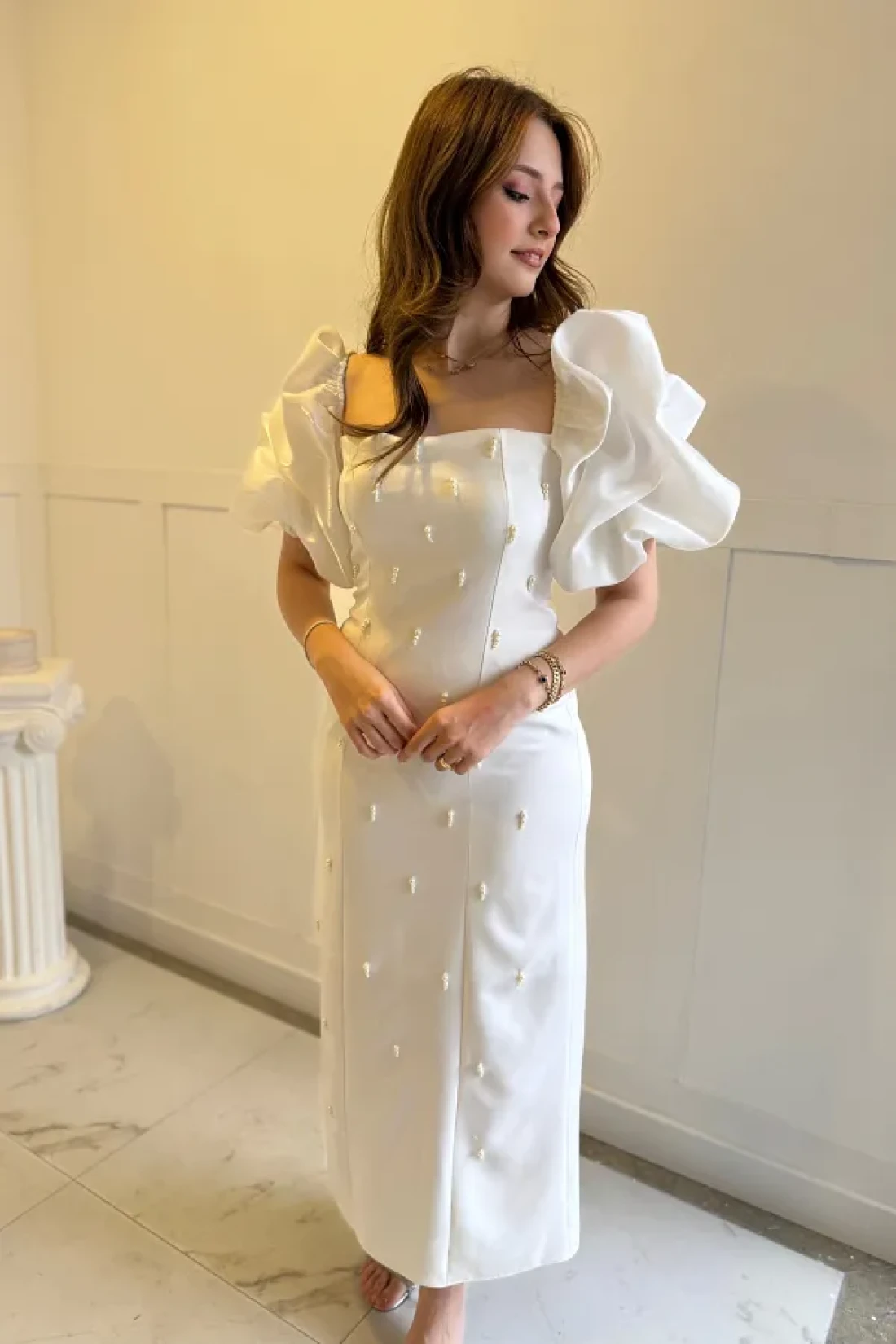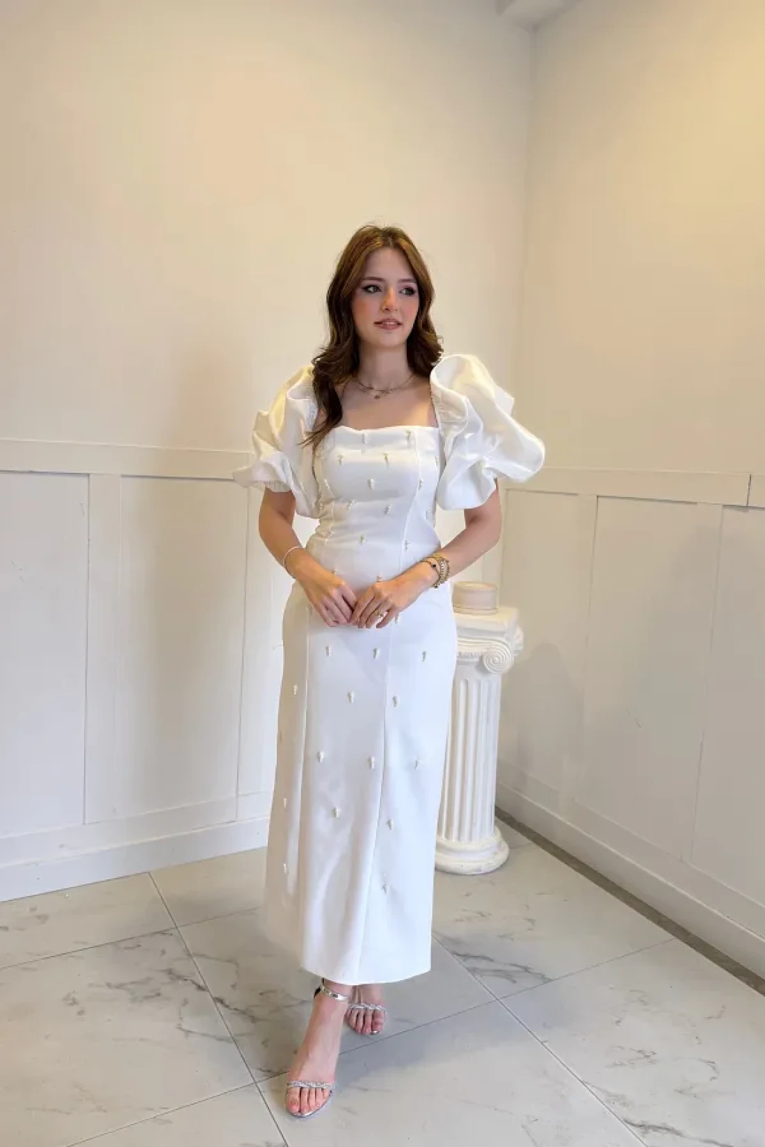 HELİS BUTİK فستان بياقة مربعة وطول كبير مزين بالأحجار - أبيض