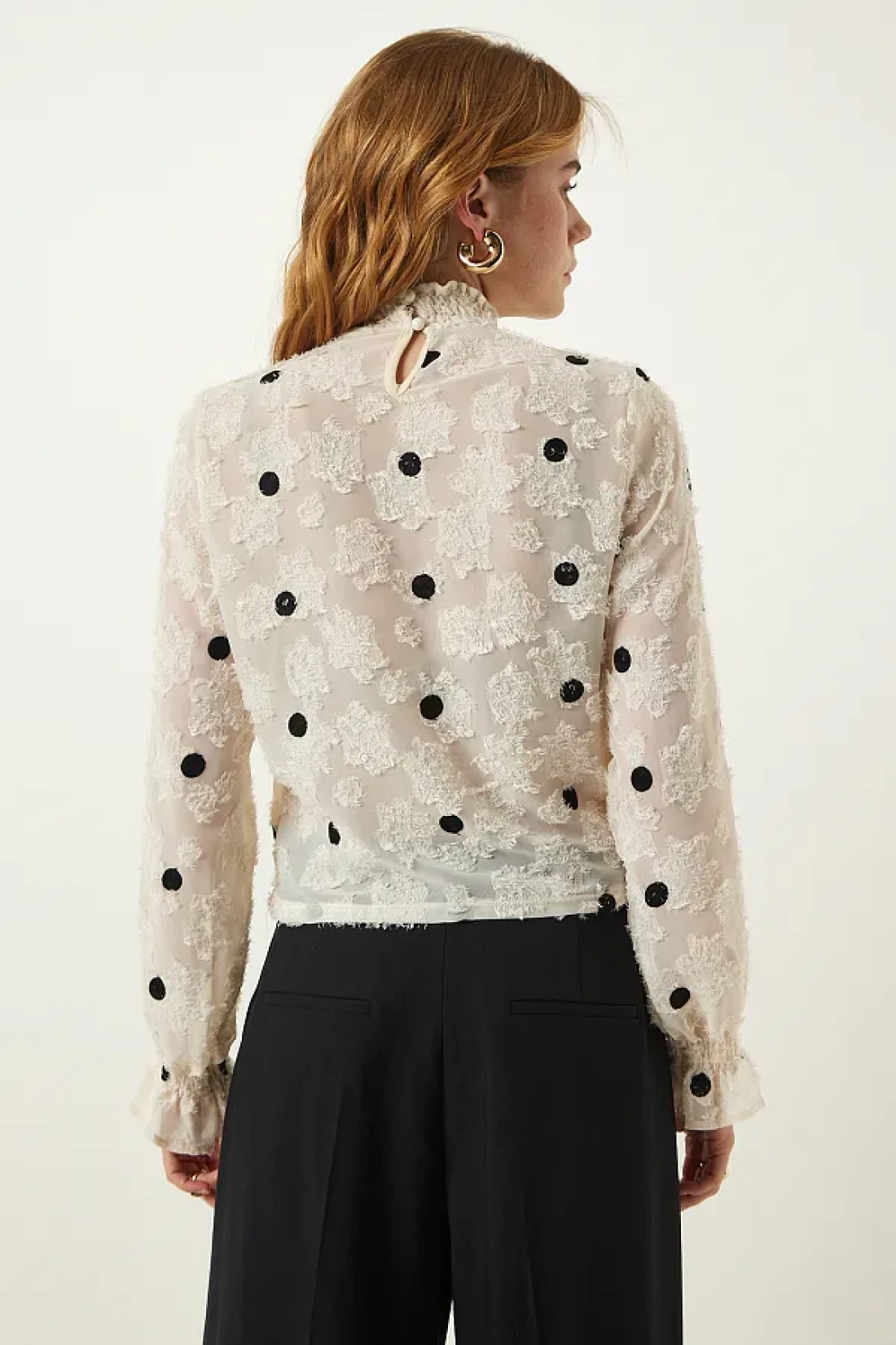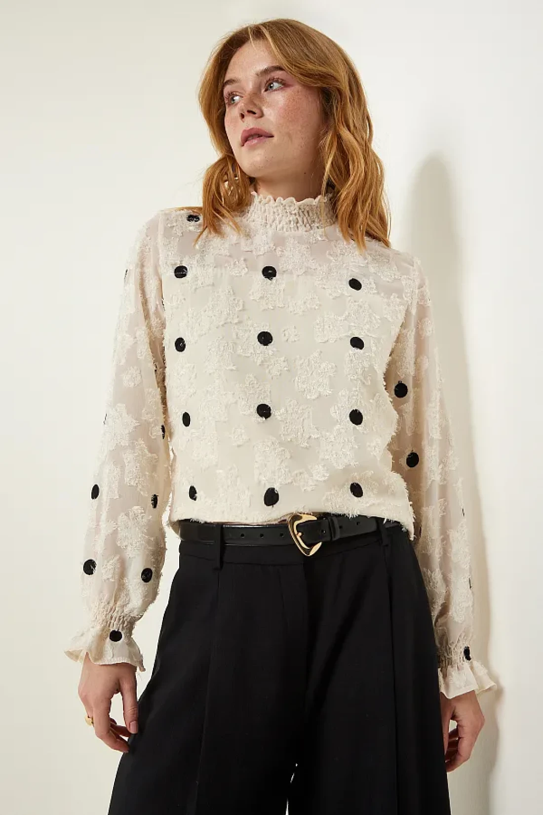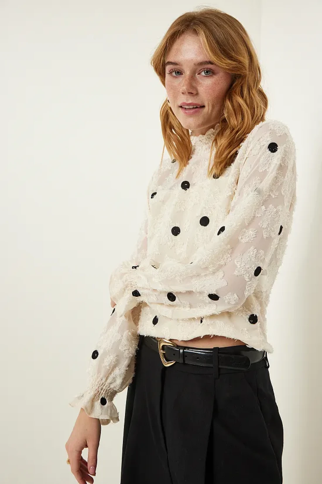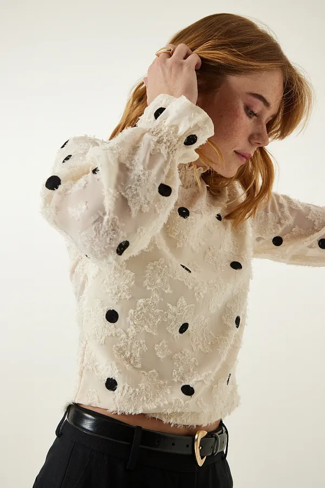 Happiness İstanbul بلوزة منسوجة منقطة باللون الكريمي TP00020