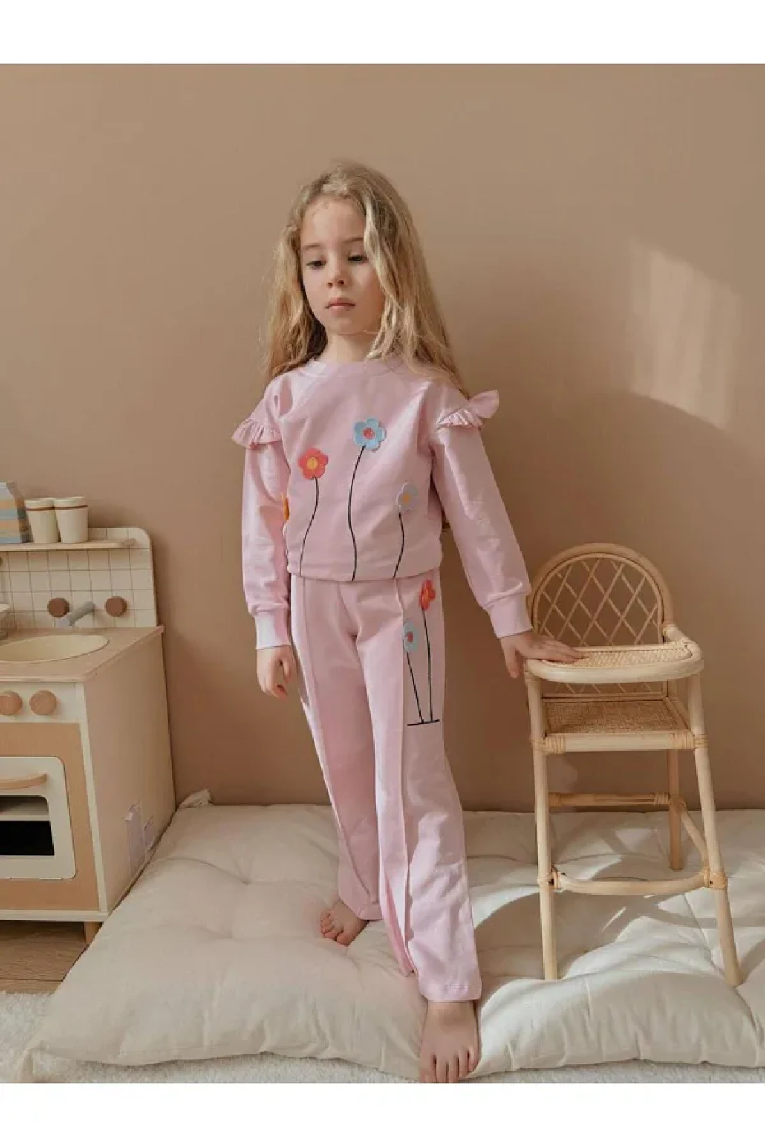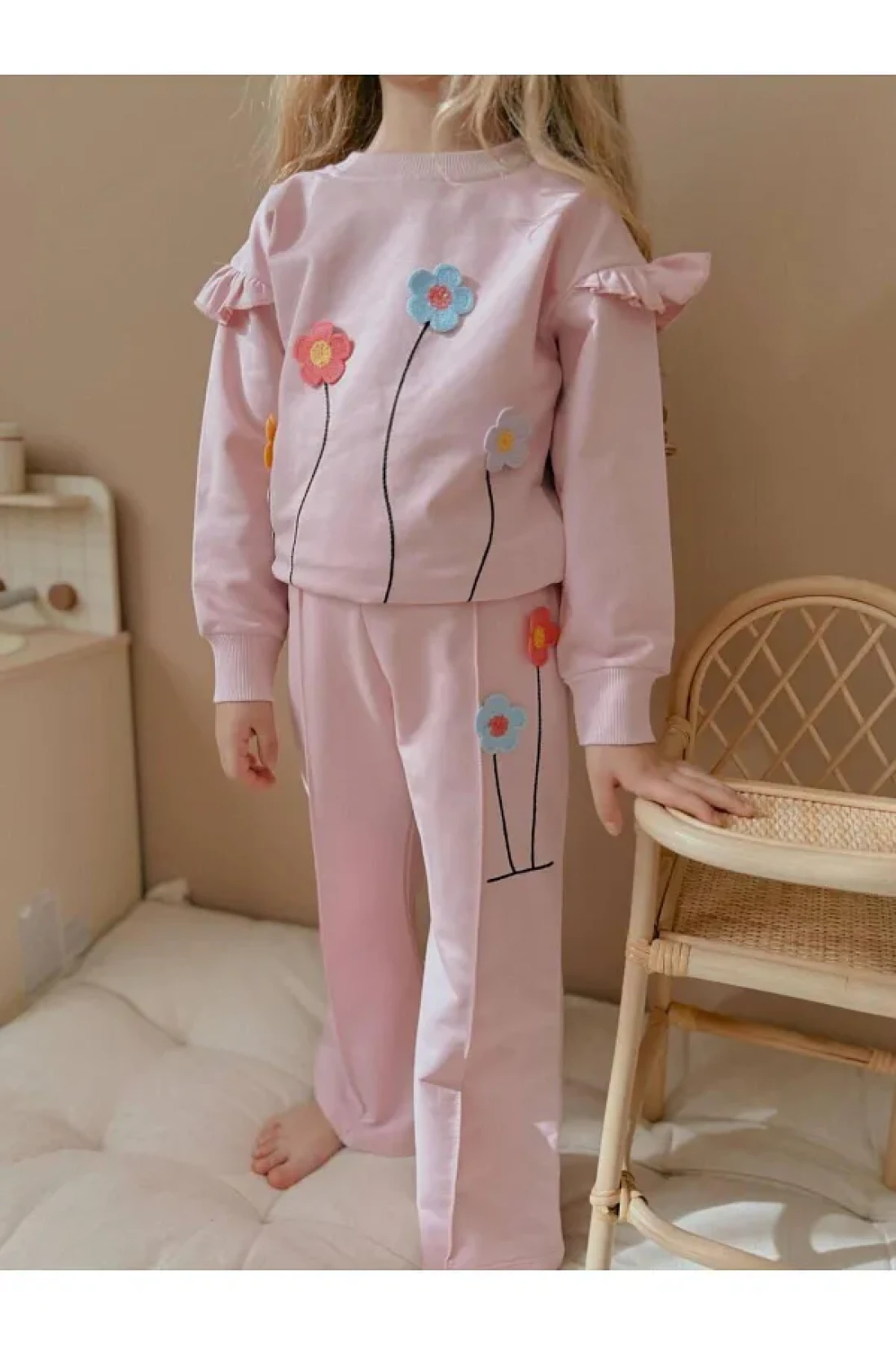 YİGİT BUTİK طقم علوي سفلي للفتيات مزين بكشكشة ومطرز بالزهور