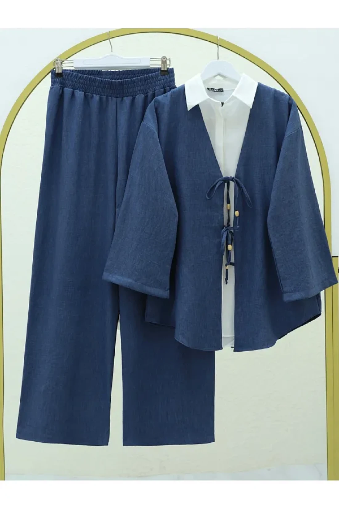 طقم كيمونو وبنطلون منقوش بسيط يروق لجميع الفئات العمرية بتصميمه البسيط والأنيق. هيكل من القماش المنسوج عالي الجودة، مثالي للاستخدام طويل الأمد؛ إنه يوفر تجربة مريحة بمكونات مادة مزيج من البوليستر والقطن بنسبة 50% يوفر سهولة الصيانة والمتانة بفضل مادة البوليستر يعطي مظهرًا عصريًا وأنيقًا بتصميمه على شكل حرف V يوفر حرية الحركة بسهولة بفضل قصته القصيرة. إنه يخلق أسلوبًا كلاسيكيًا وخالدًا مع تفاصيل أكمام ريجلان. تصميم بنطال بأرجل أنبوبية يرسم صورة ظلية أنيقة وعصرية؛ بفضل قصته العالية الخصر، فإنه يحتضن خطوط جسمك بلطف ويوفر وقفة أنيقة. يوفر الراحة والأناقة مع ملاءمة عادية
