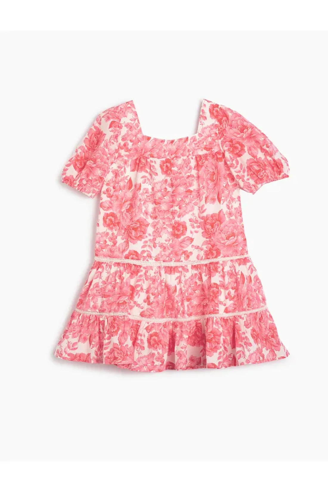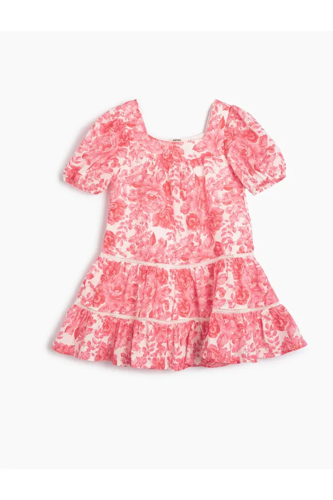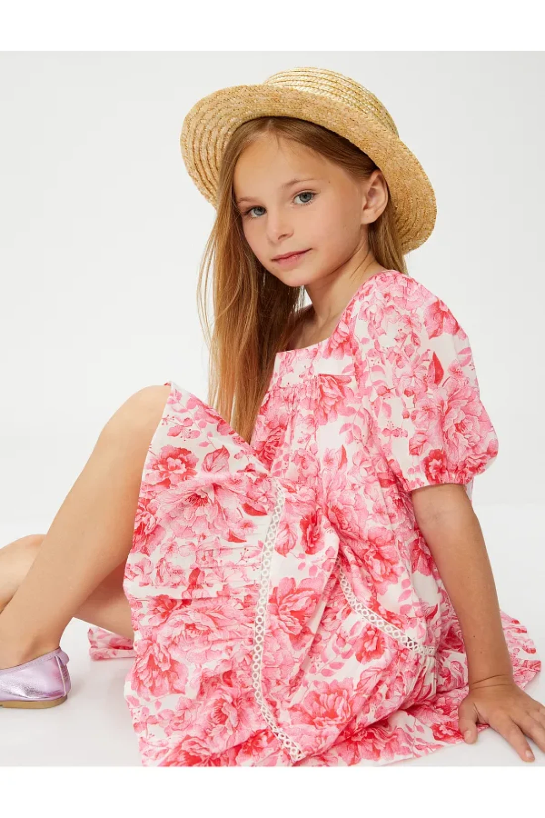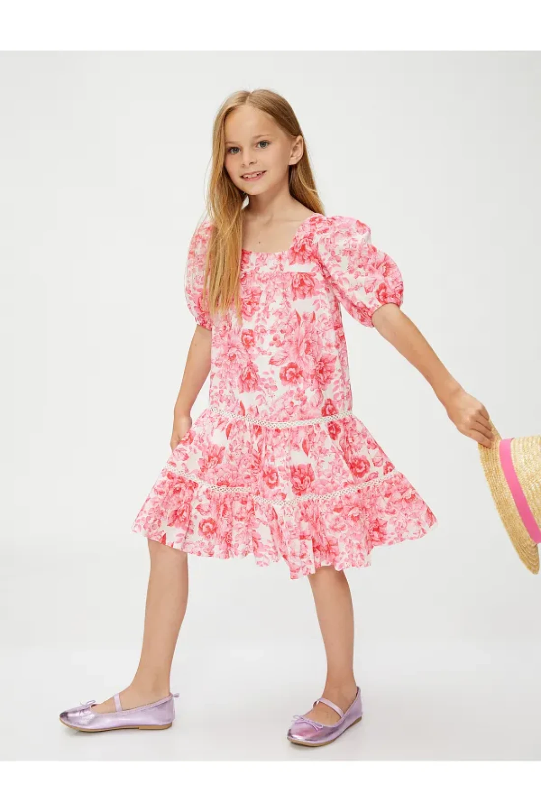 Koton فستان قصير مزين بالزهور وأكمام بالونية قصيرة وياقة مربعة مبطن