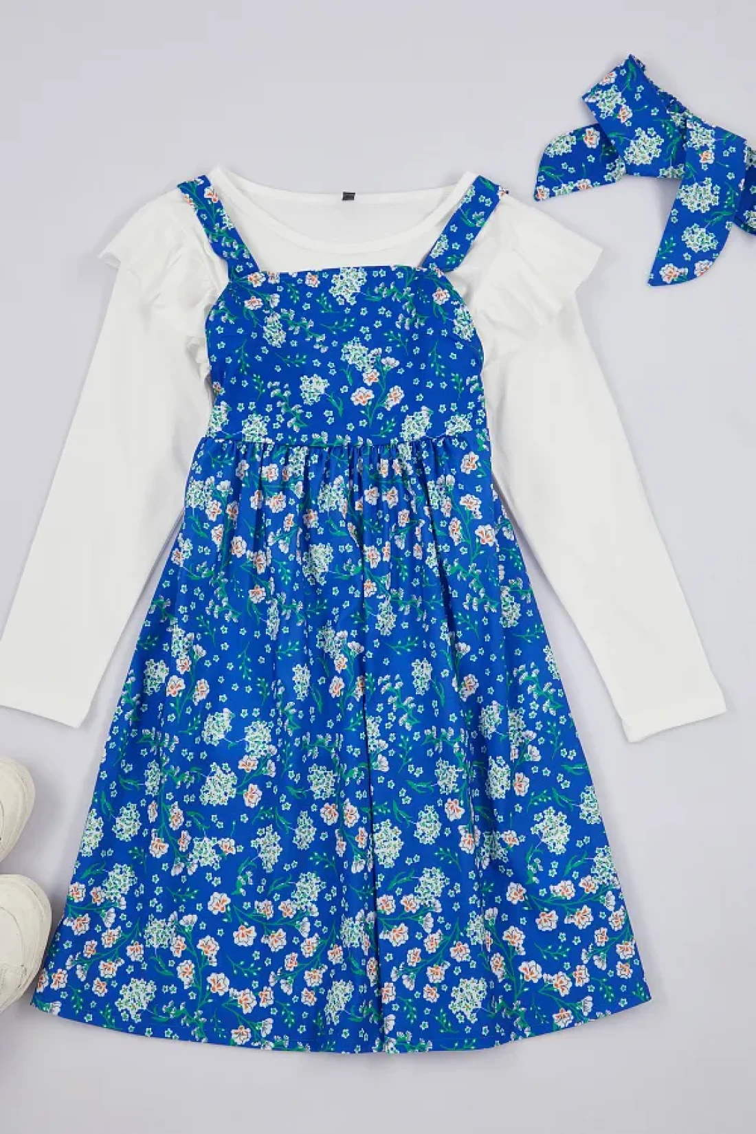 TRENDYOLKIDS فستان محبوك منقوش بالزهور باللون الأزرق الداكن للفتيات - باندانا TKDAW25EL00022