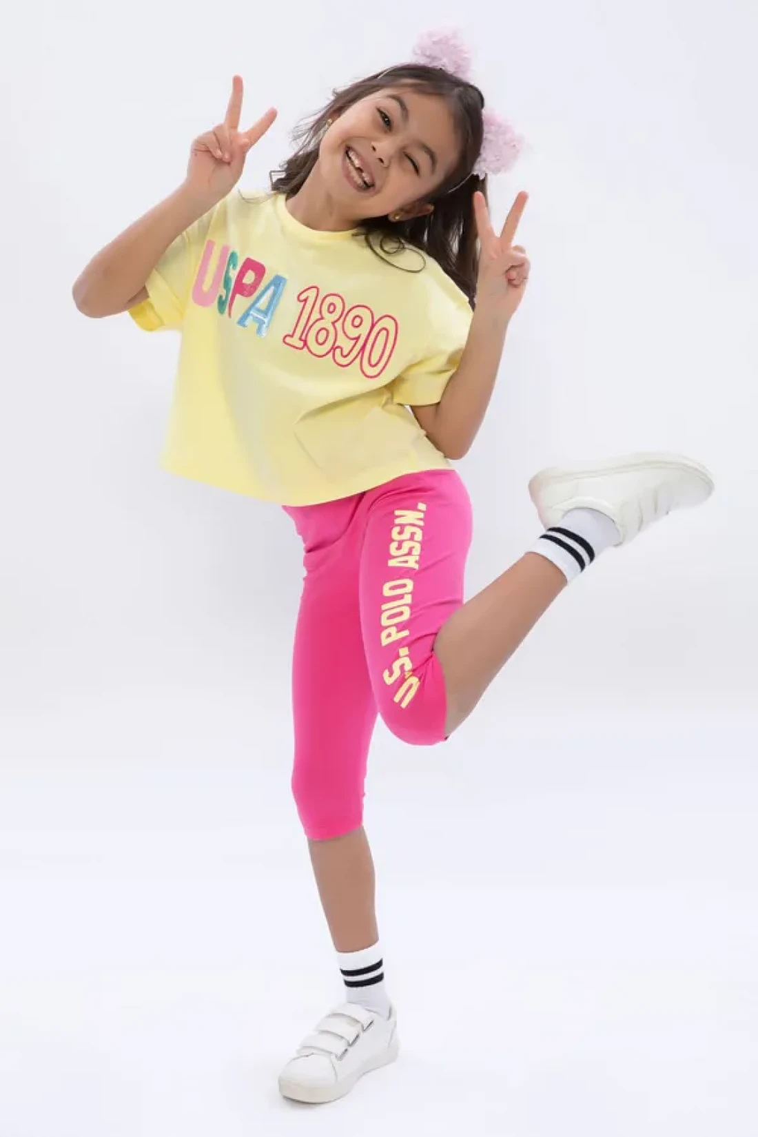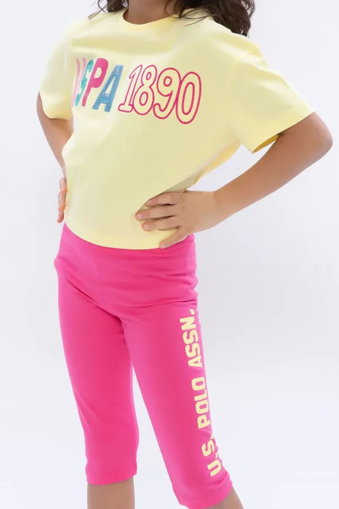 U.S. Polo Assn. طقم لباس ضيق برقبة دائرية للفتيات باللون الأصفر الفاتح