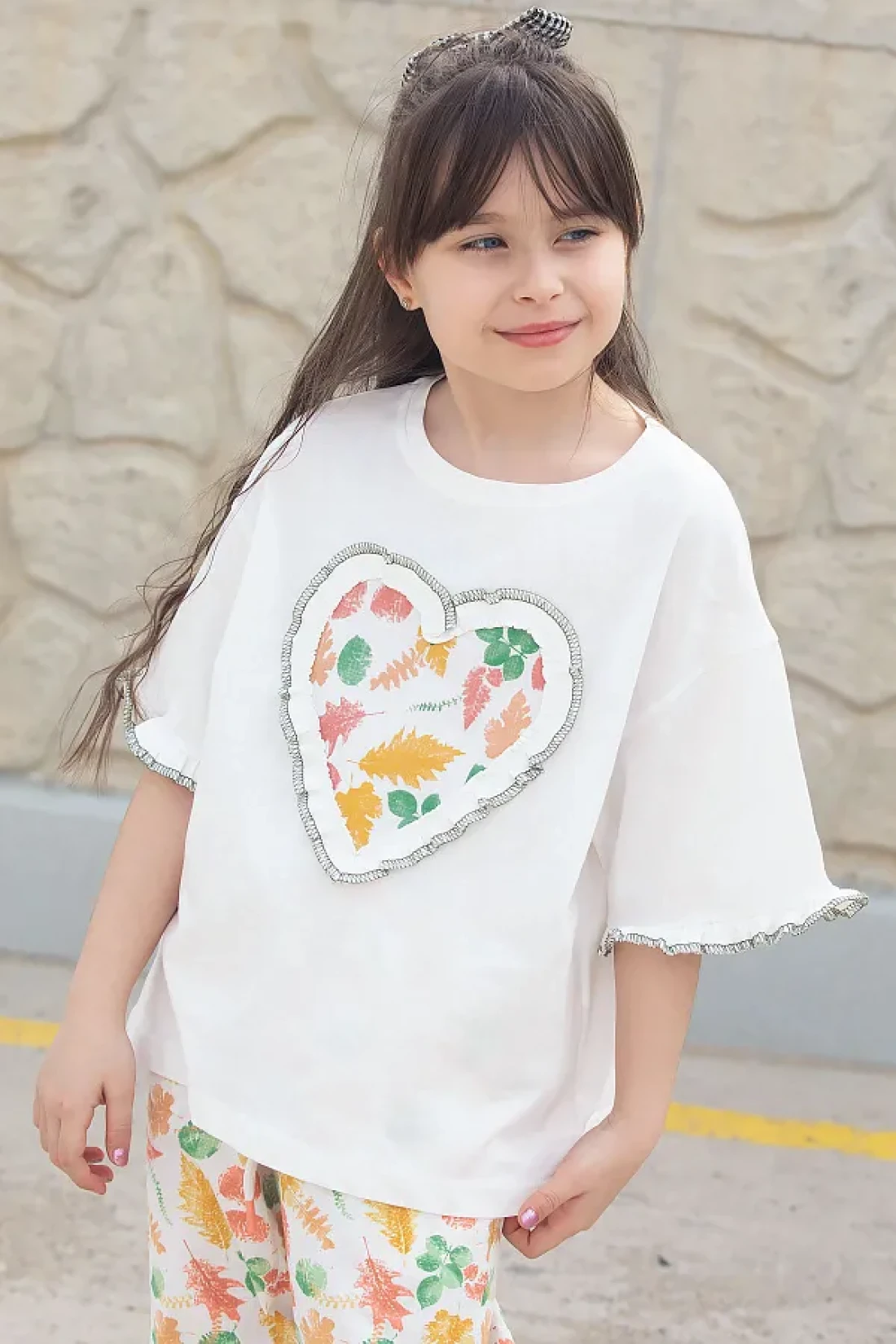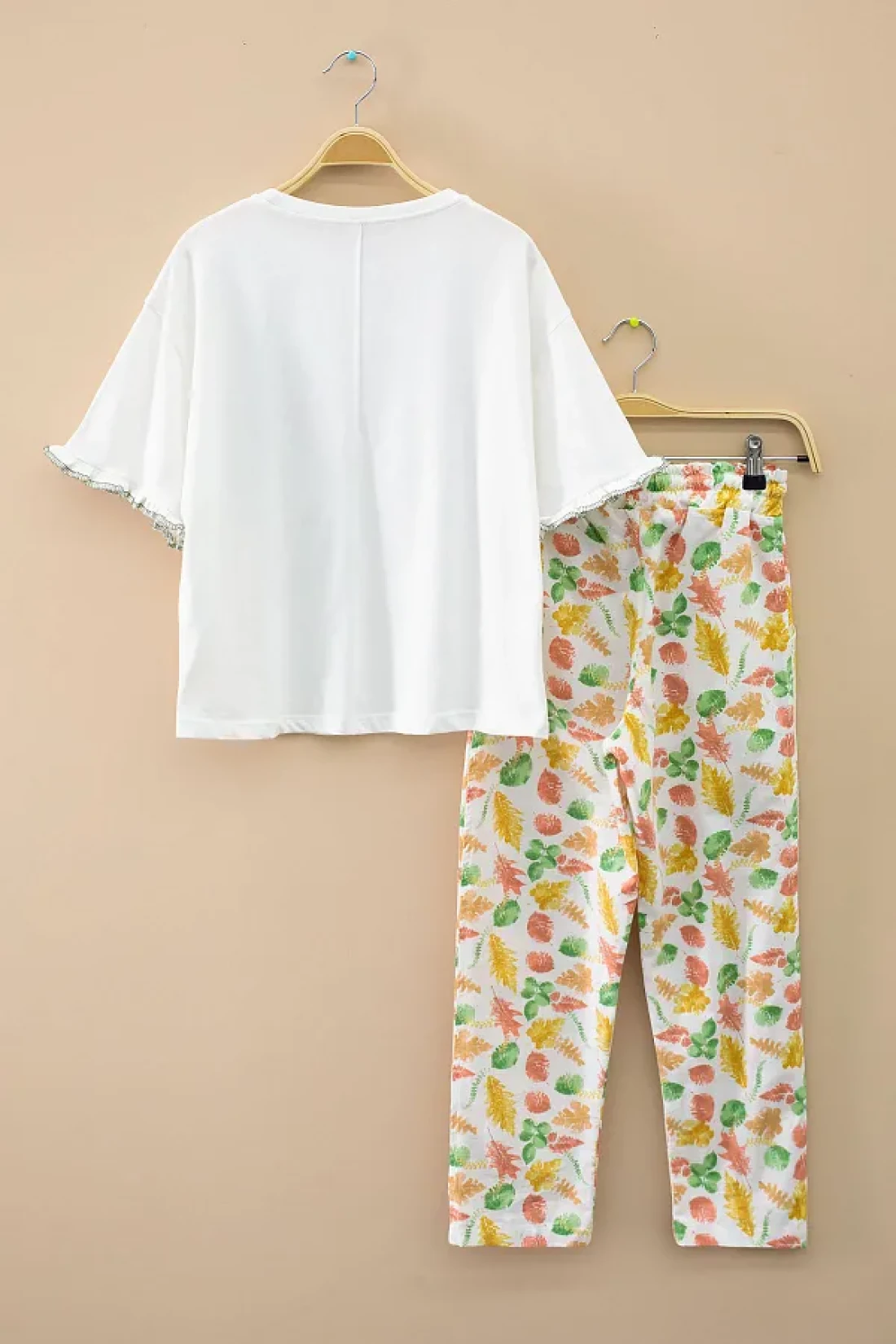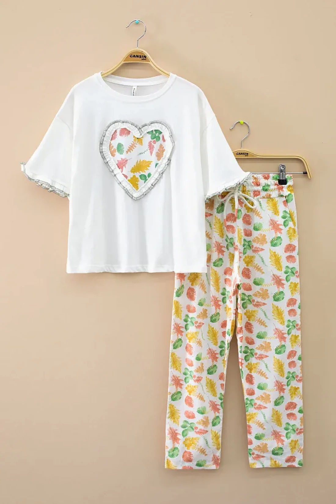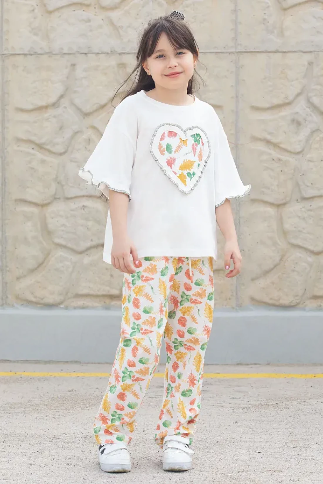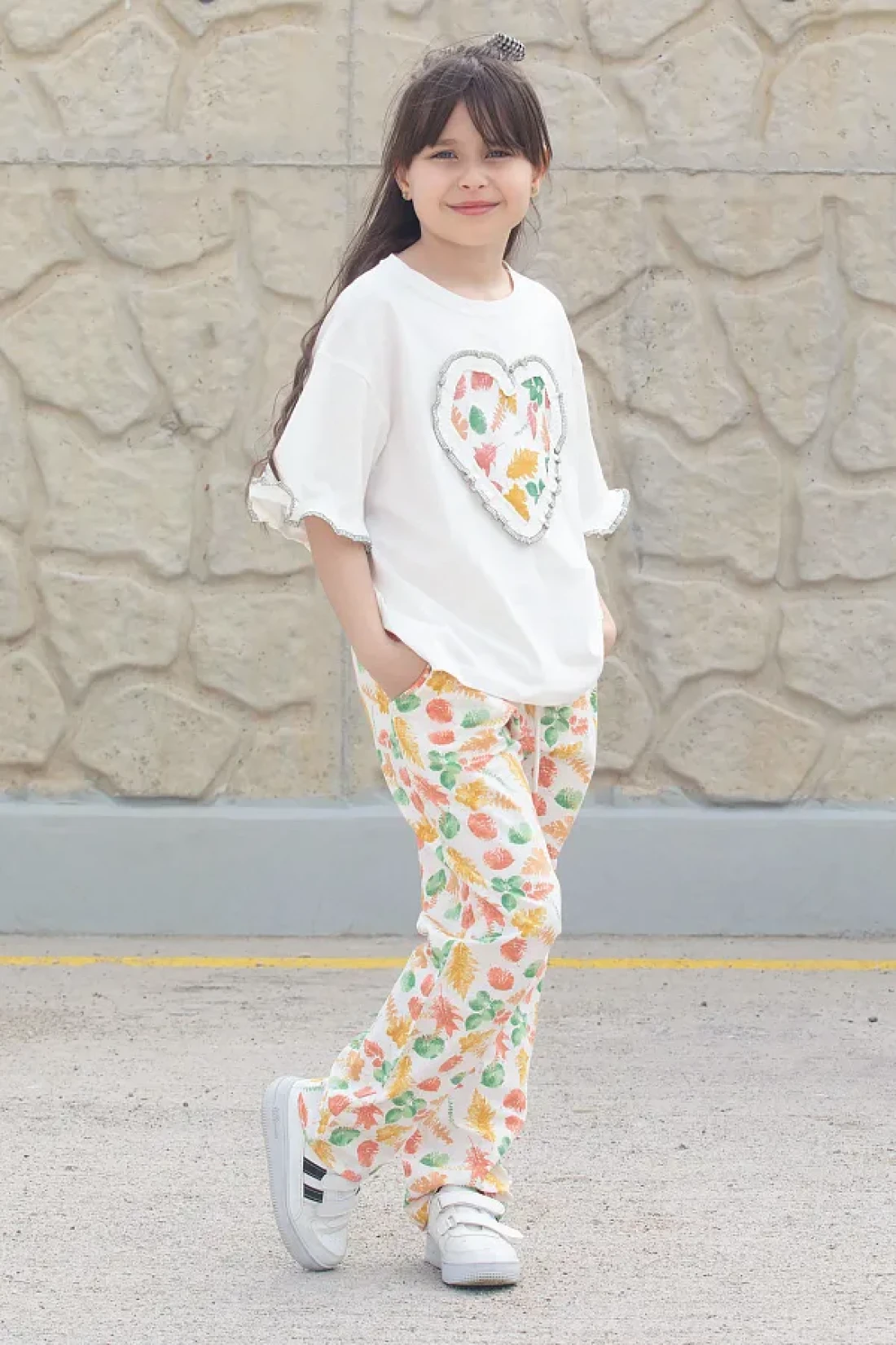 Cansın Mini طقم بناتي بنطال منقوش بأوراق إكرو تي شيرت كبير الحجم 20228