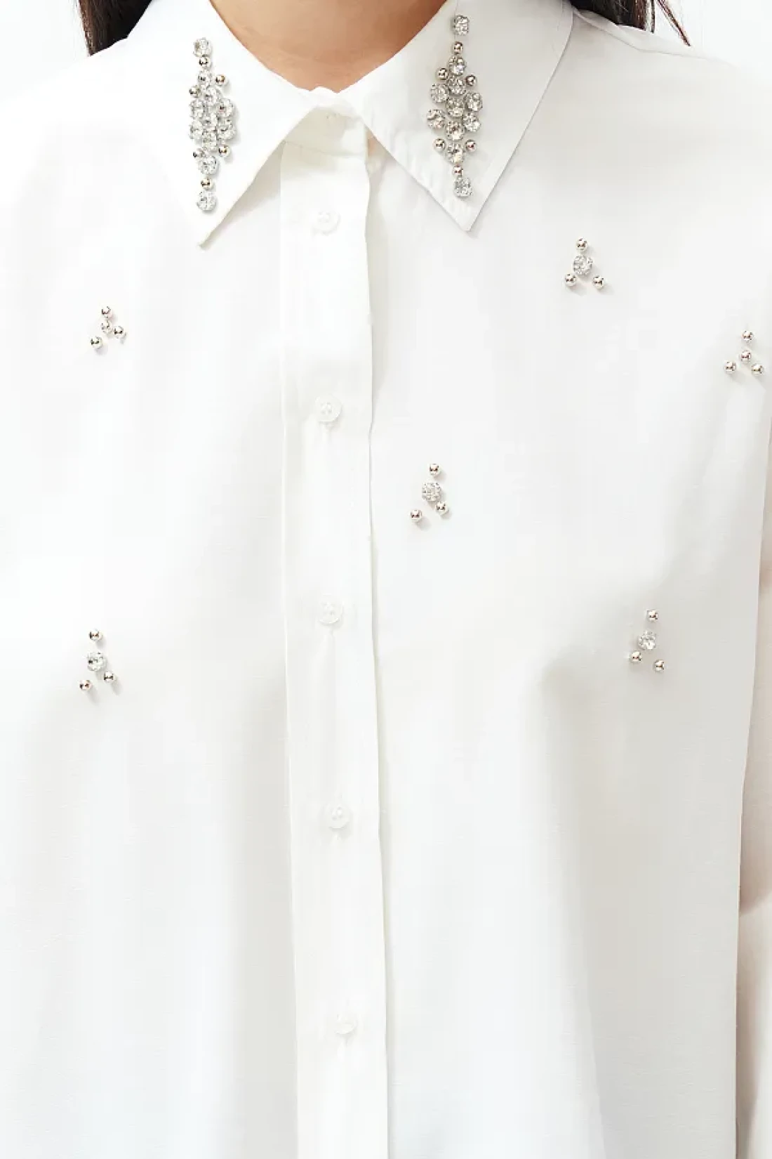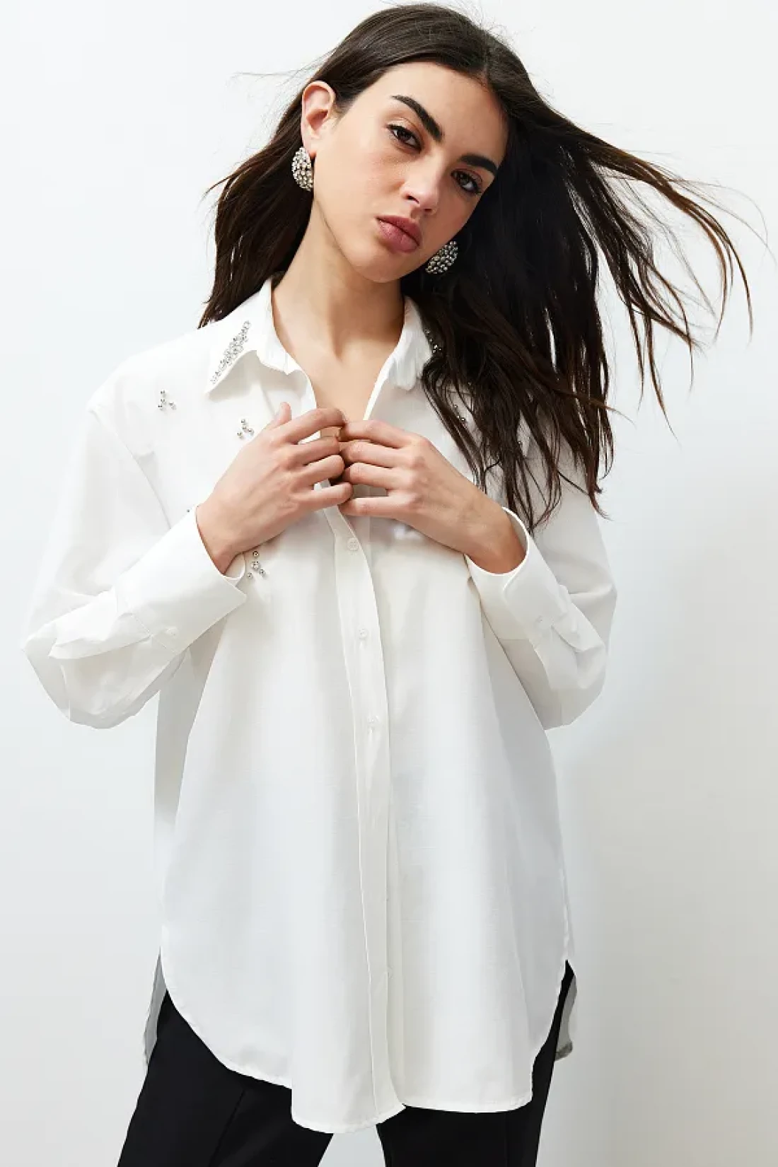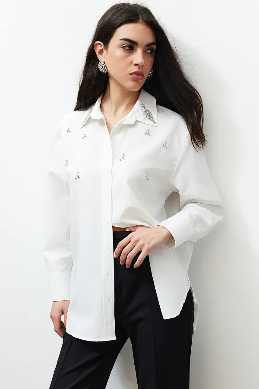 Collection قميص منسوج إكرو بتفاصيل حجرية - مقاس عادي TWOSS24GO00069