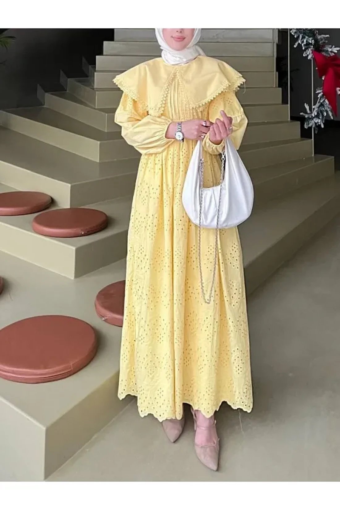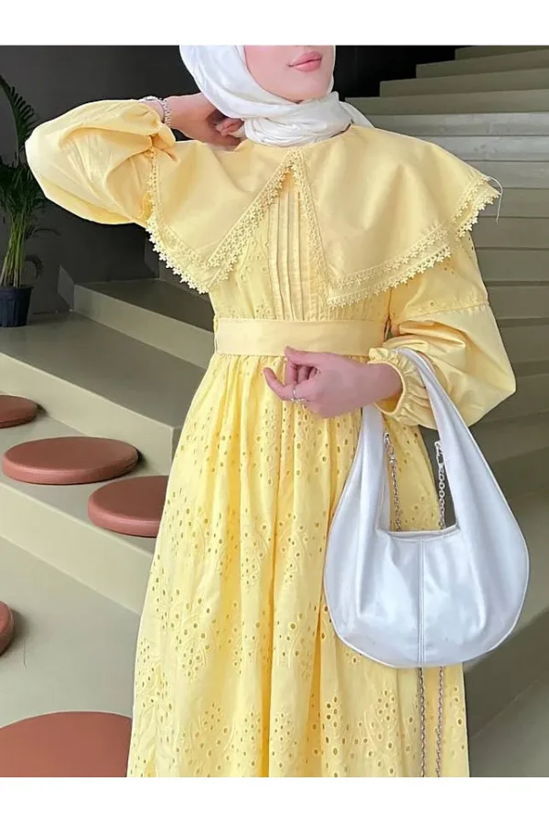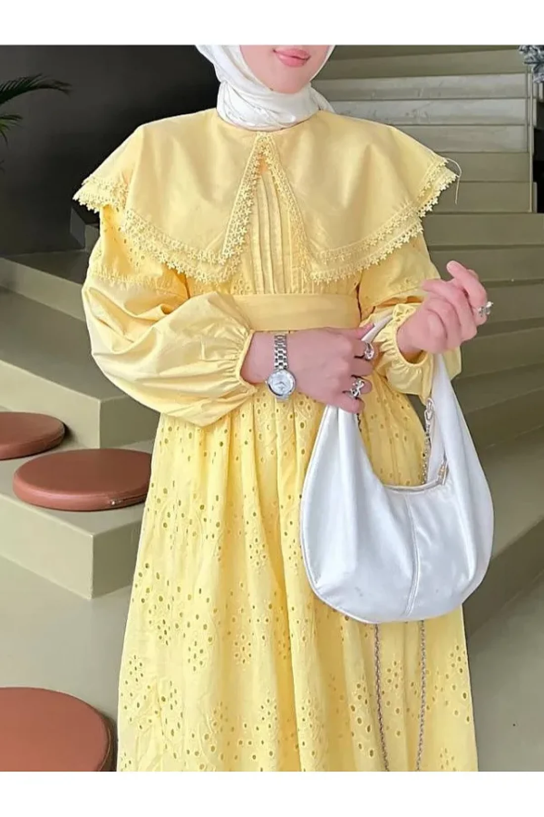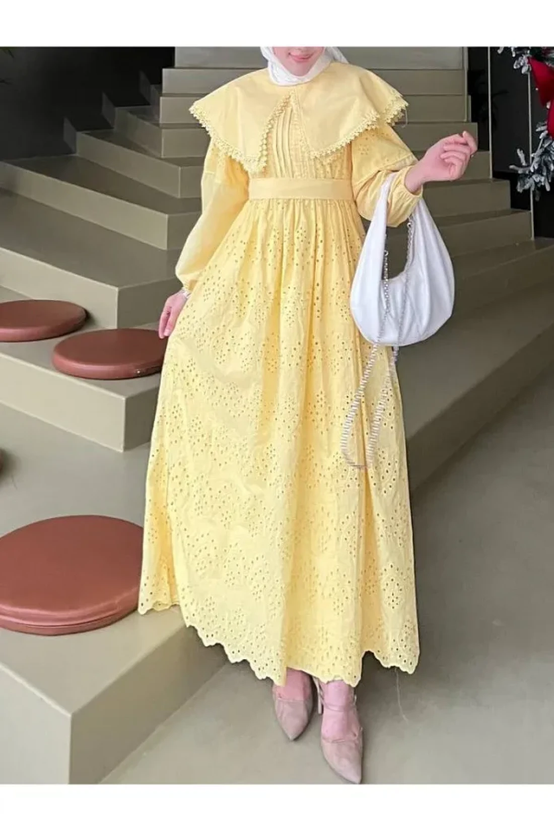 فستان بتفاصيل دانتيل وياقة كيب - أصفر