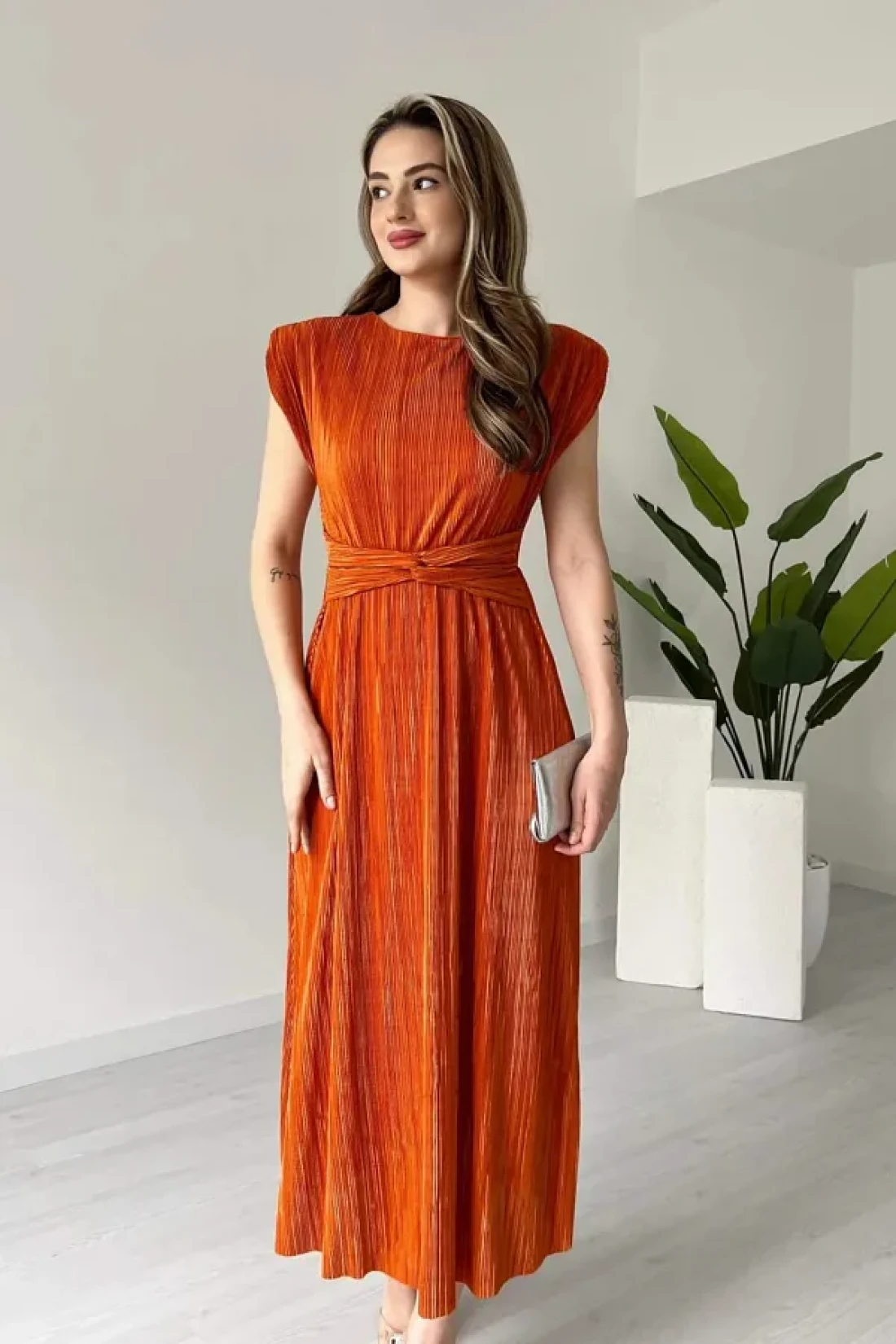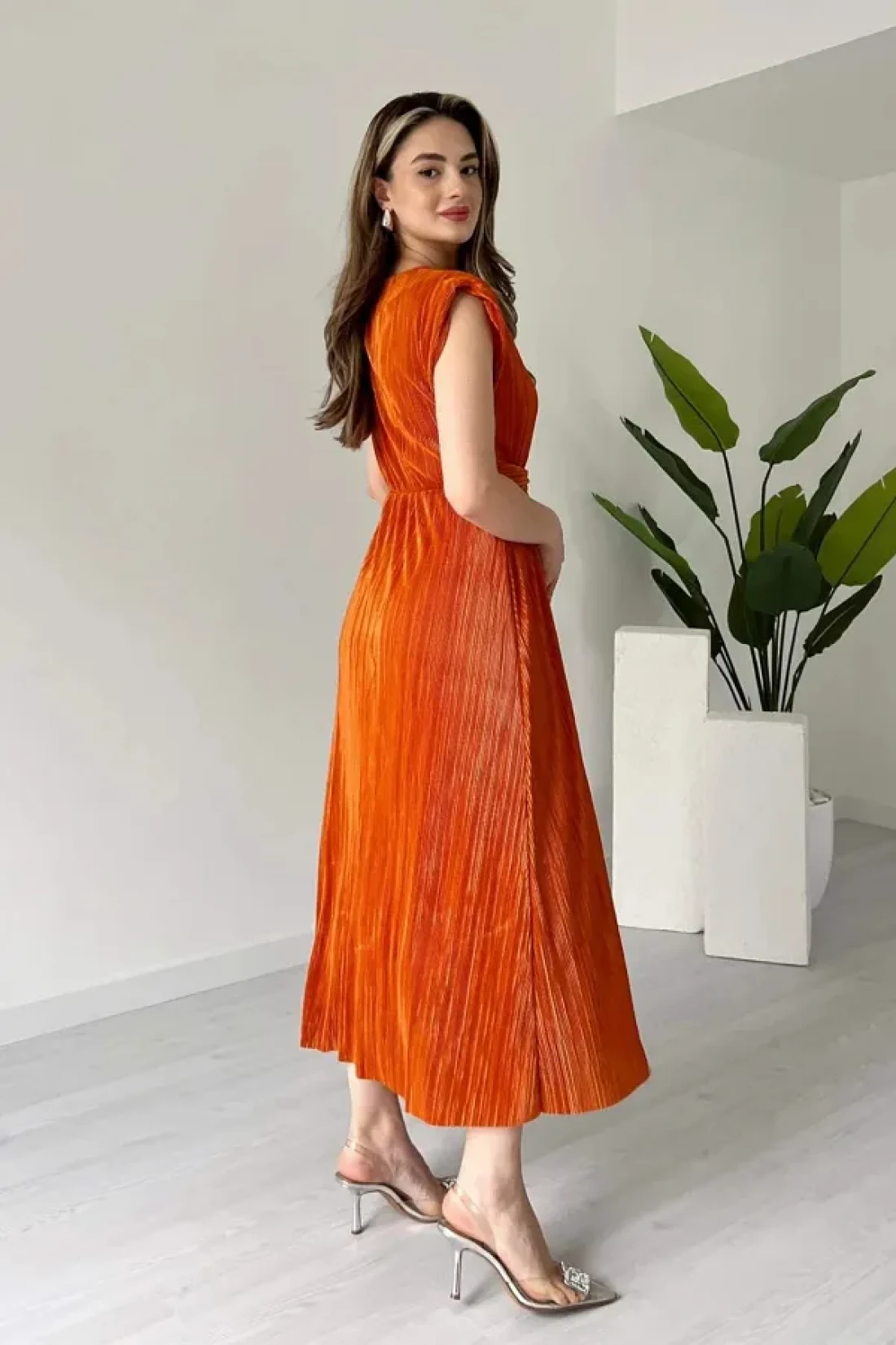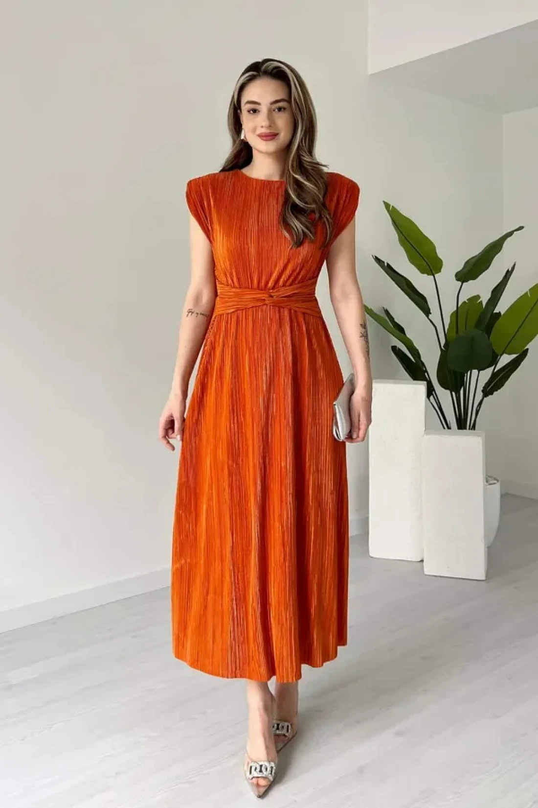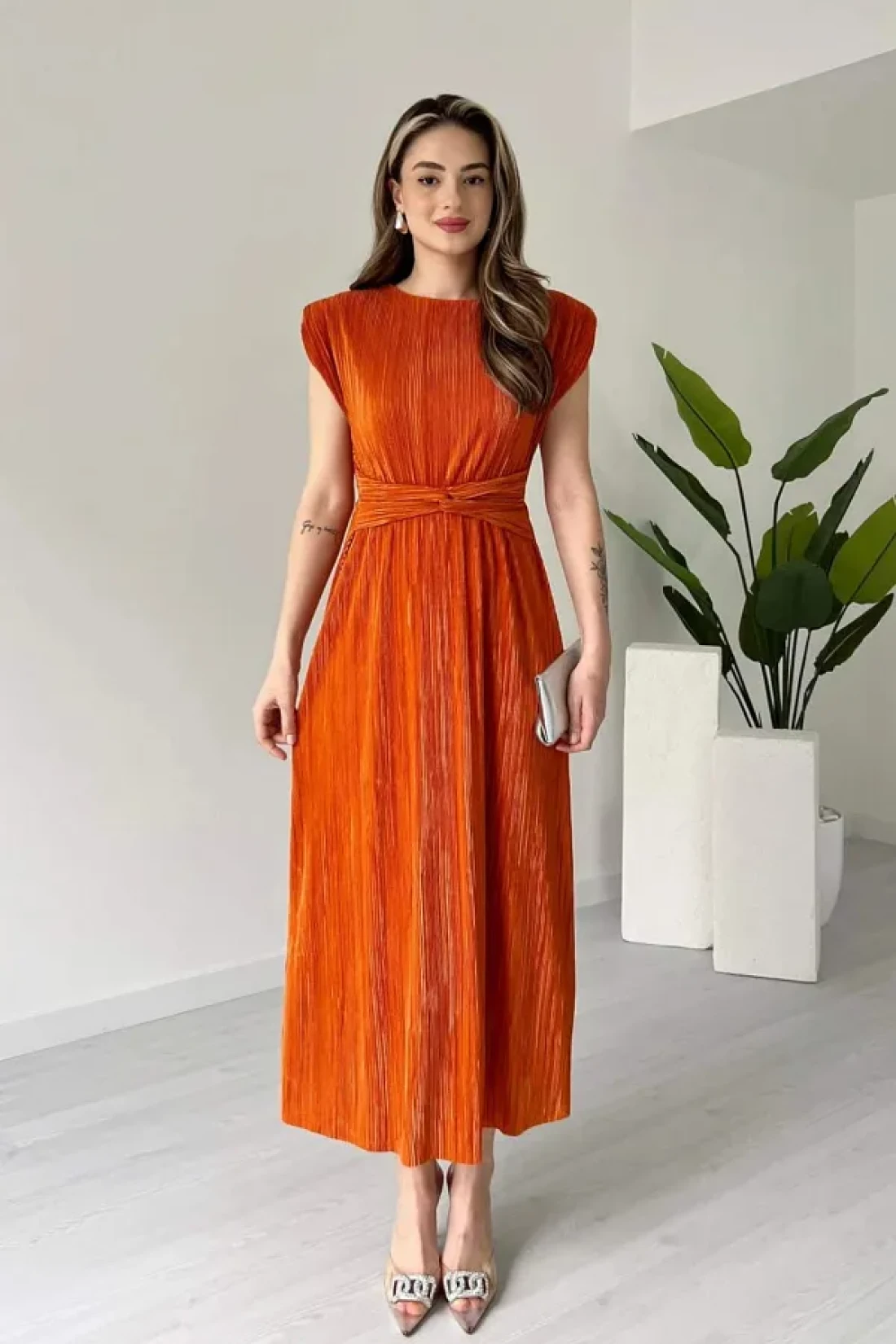 MODAMİNEM فستان دانيال نسائي بتفاصيل أربطة وطيات برتقالية اللون