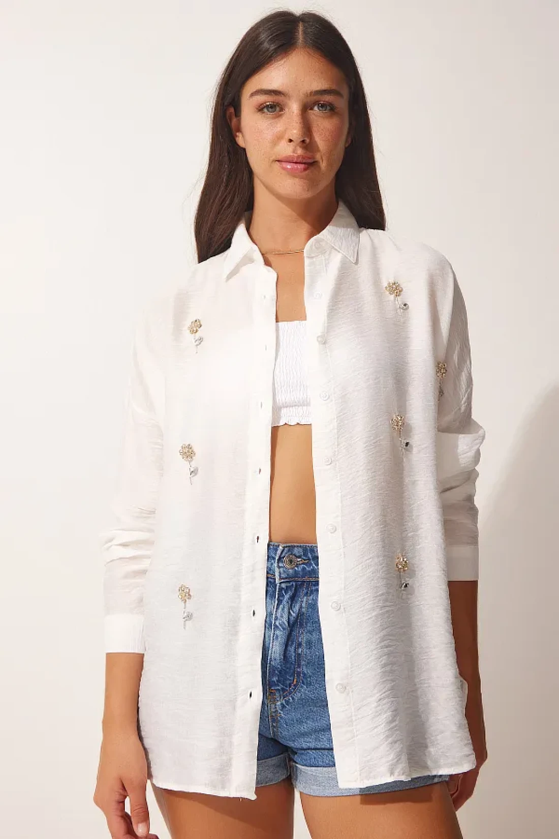 Happiness İstanbul قميص أيروبين نسائي مطرز بأحجار كريستال إكرو TU00025
