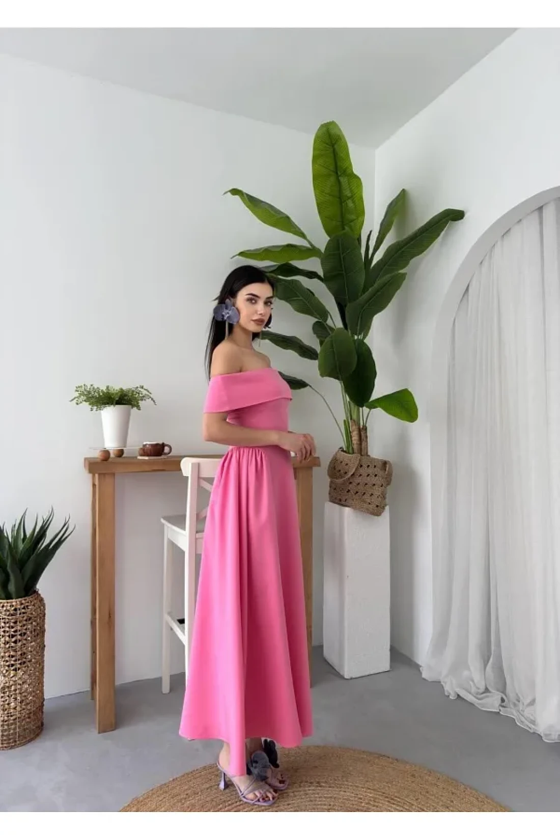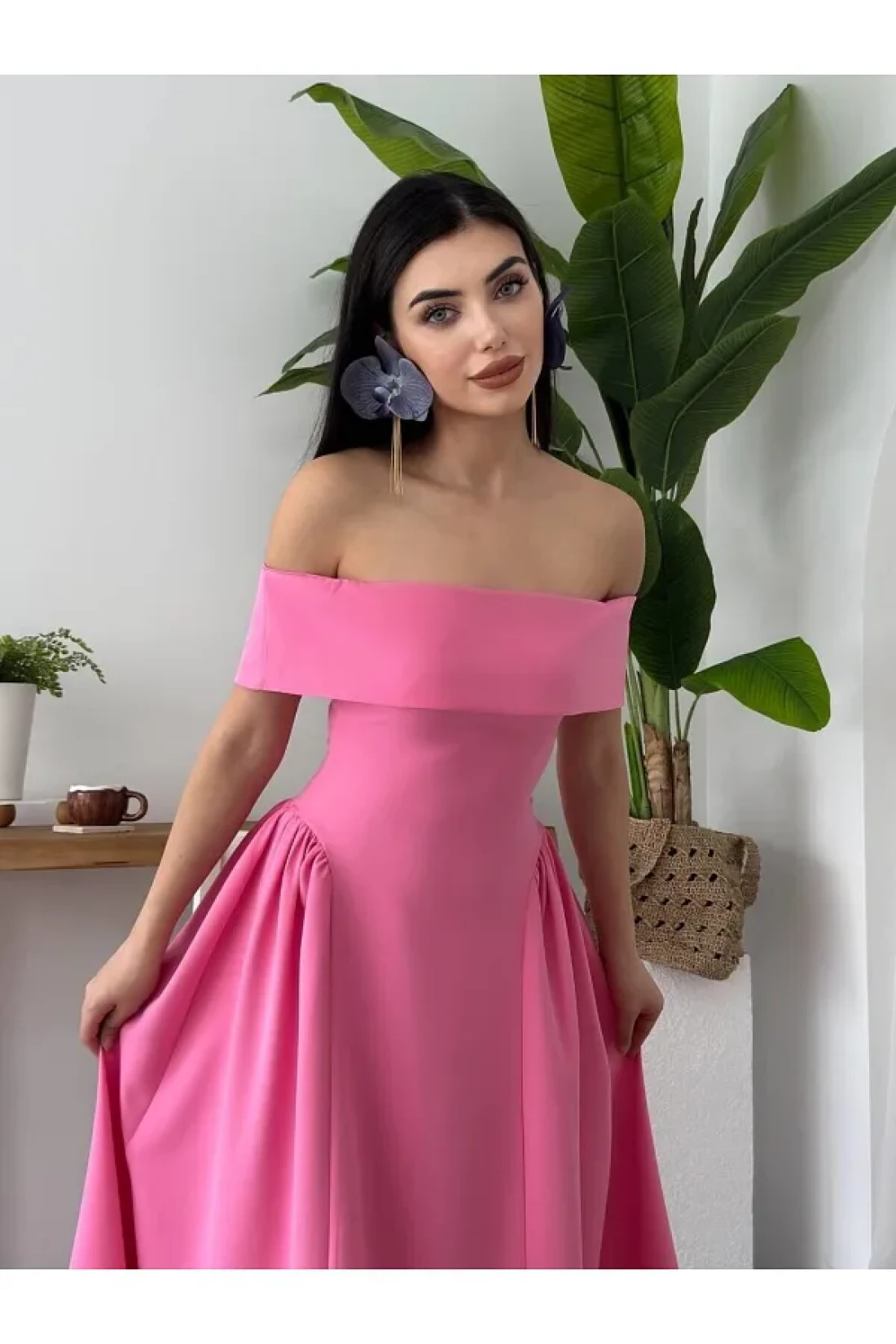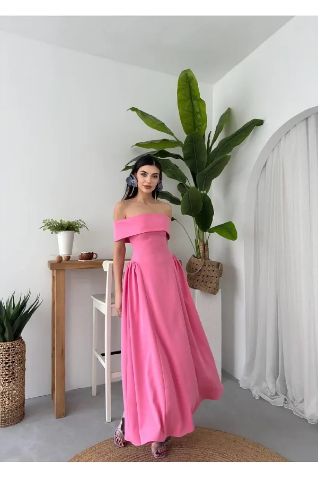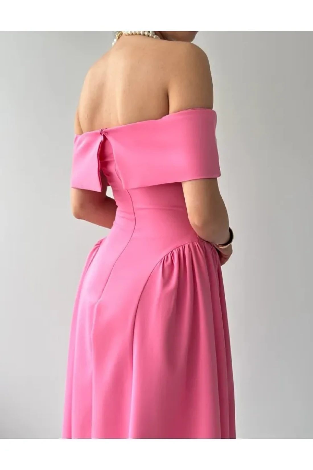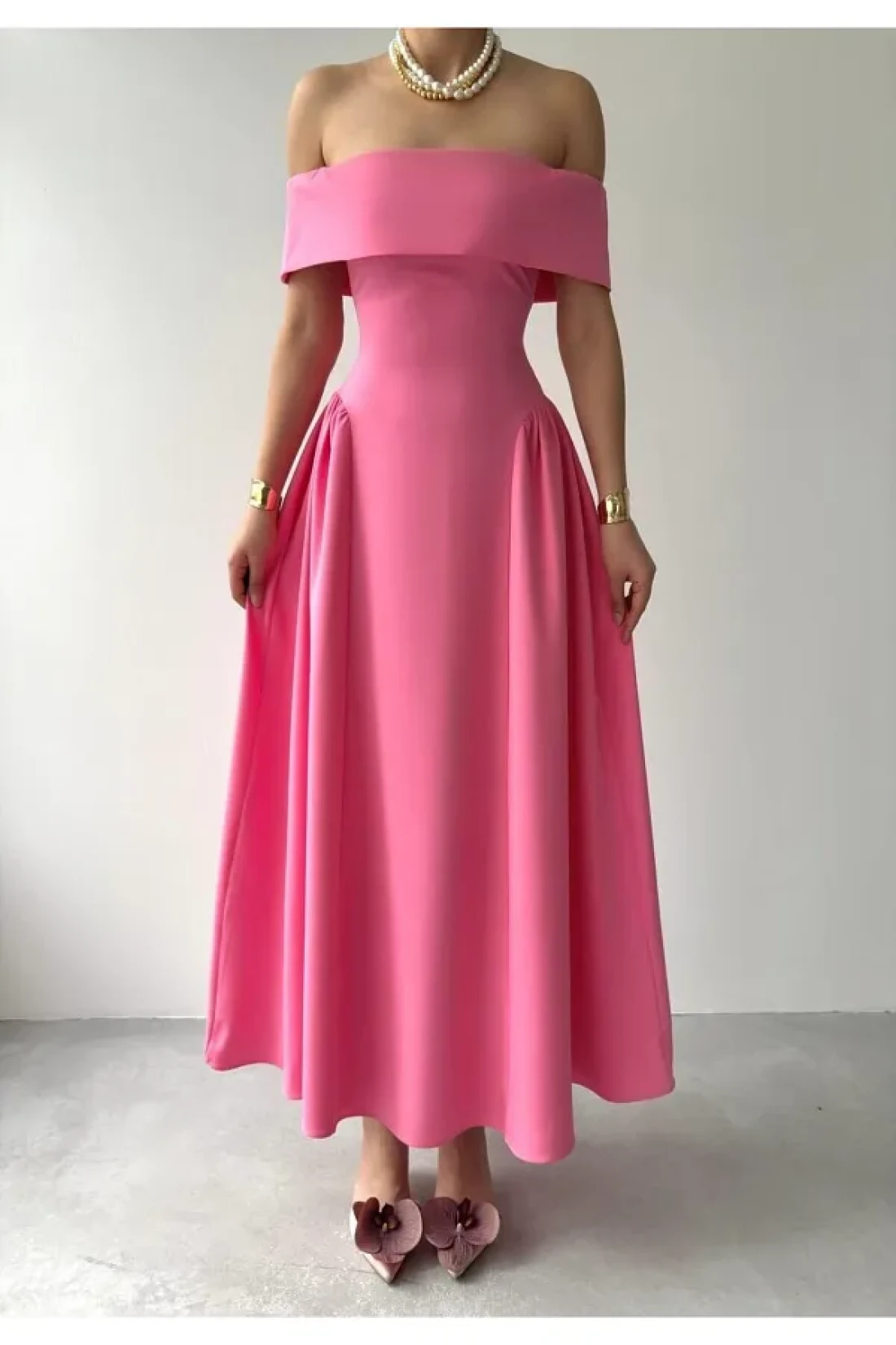 Julidress فستان سهرة طويل بياقة مادونا بطيات طويل وقلم رصاص ممتاز