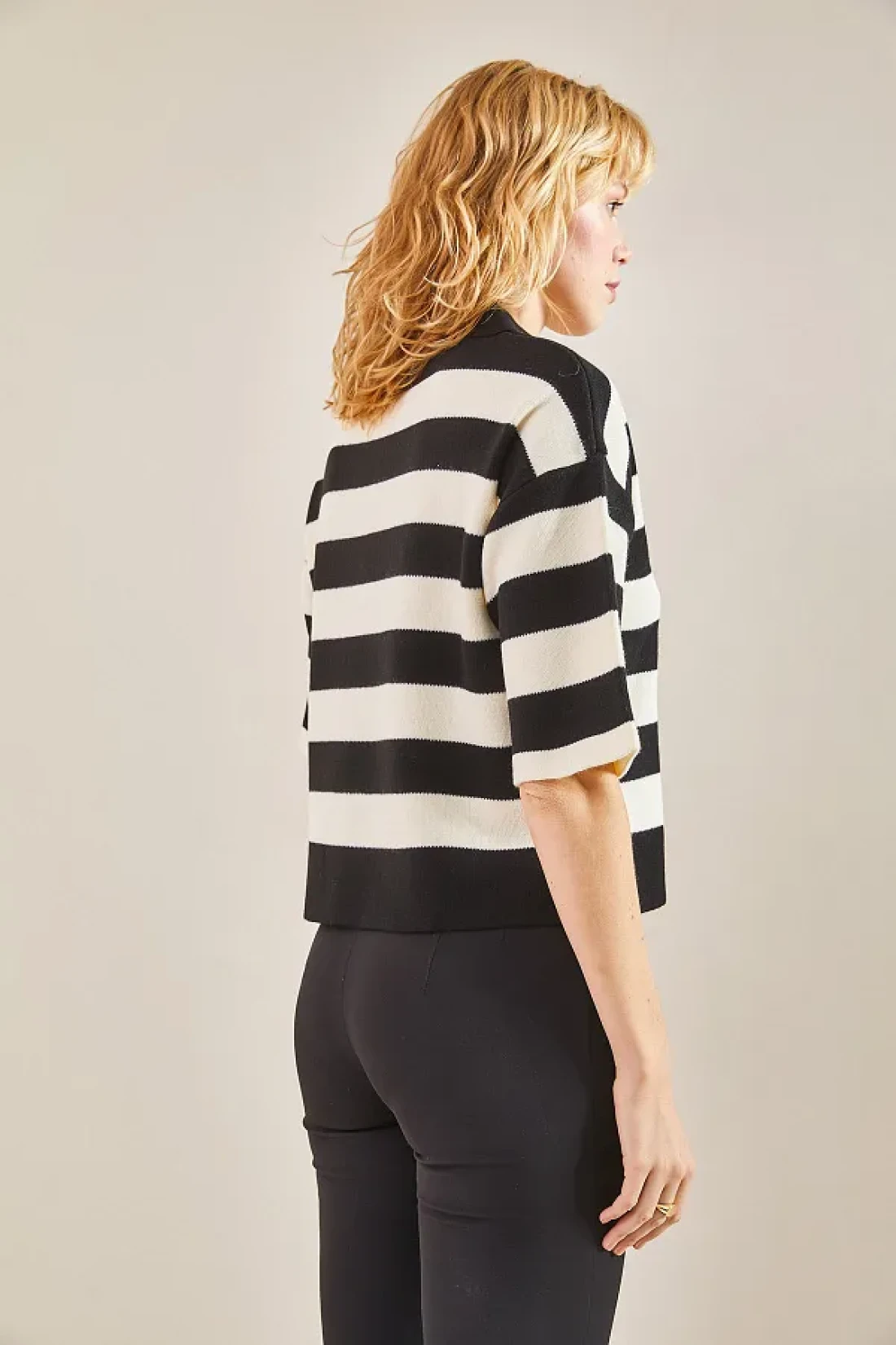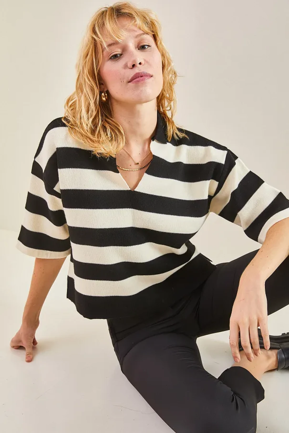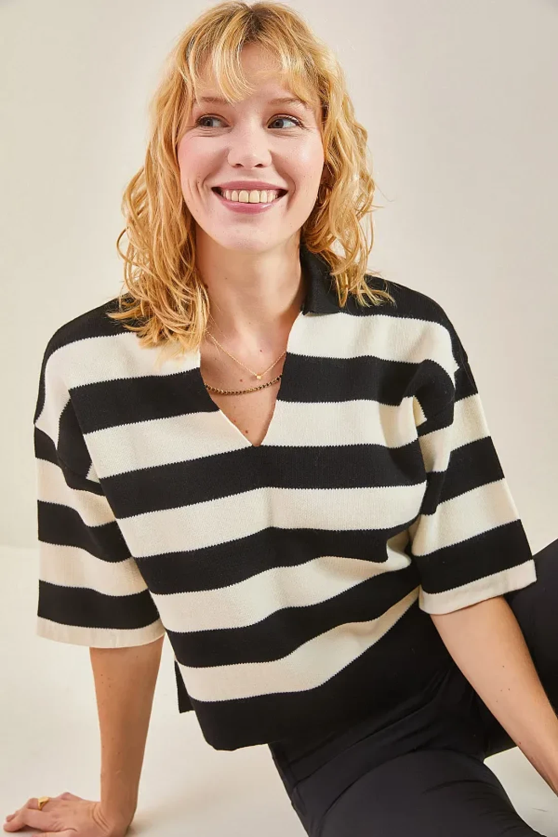 Bianco Lucci سترة نسائية محبوكة كبيرة الحجم مخططة بياقة بولو