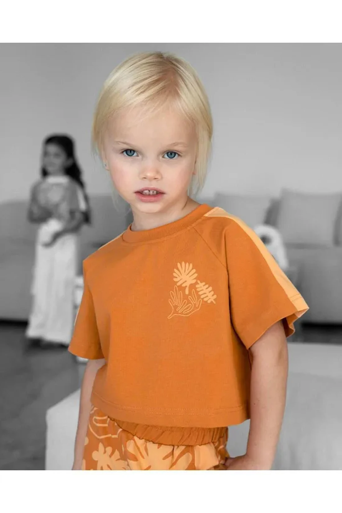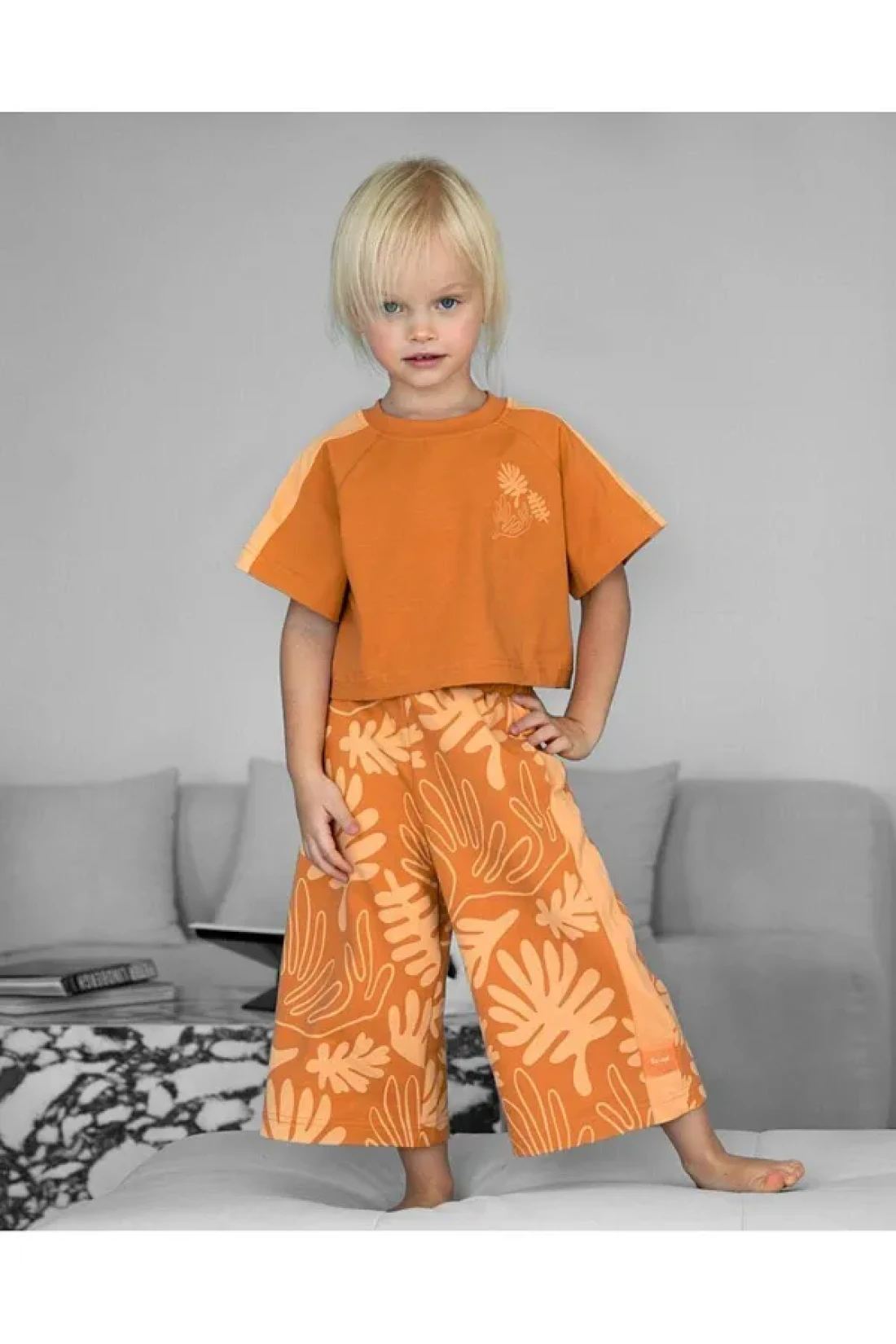 Magu طقم بناتي قطني برتقالي بطبعة يدوية - تي شيرت قصير الأكمام وبنطال واسع الساق
