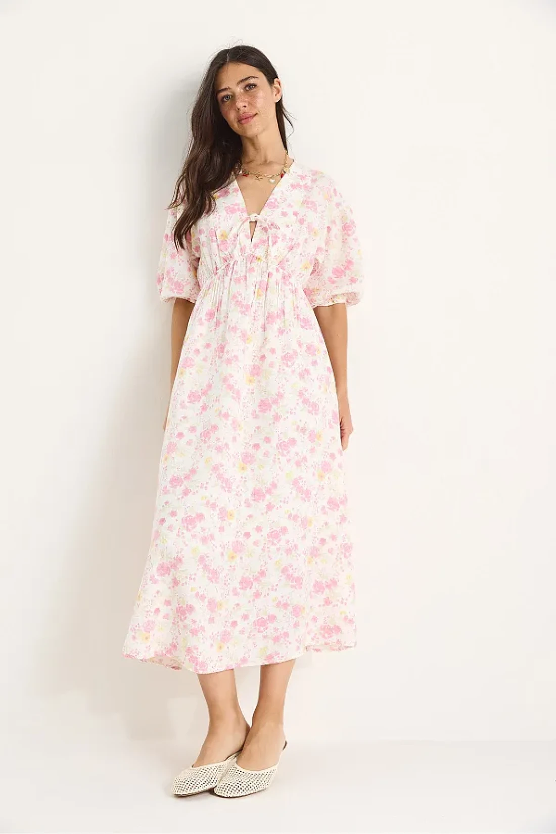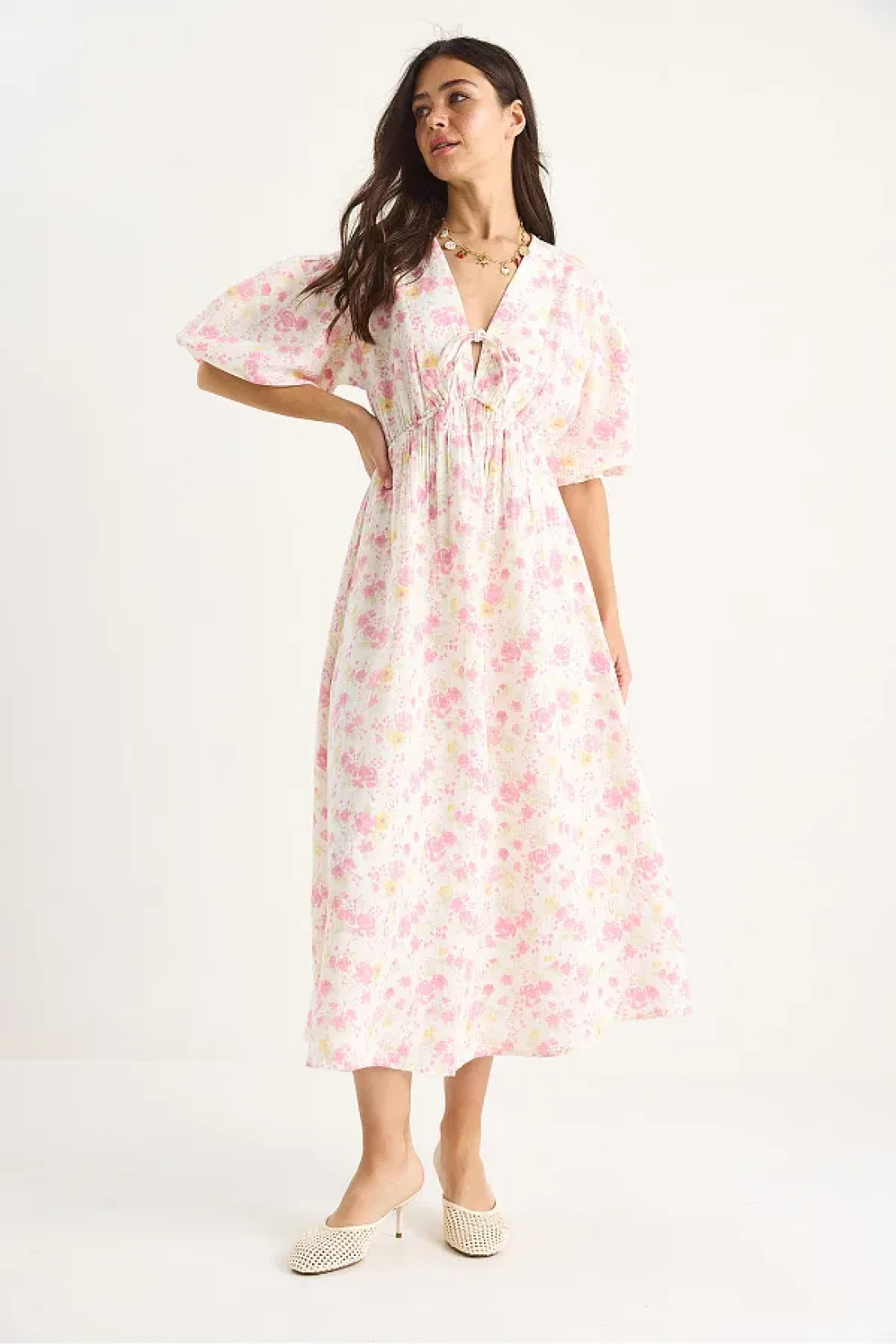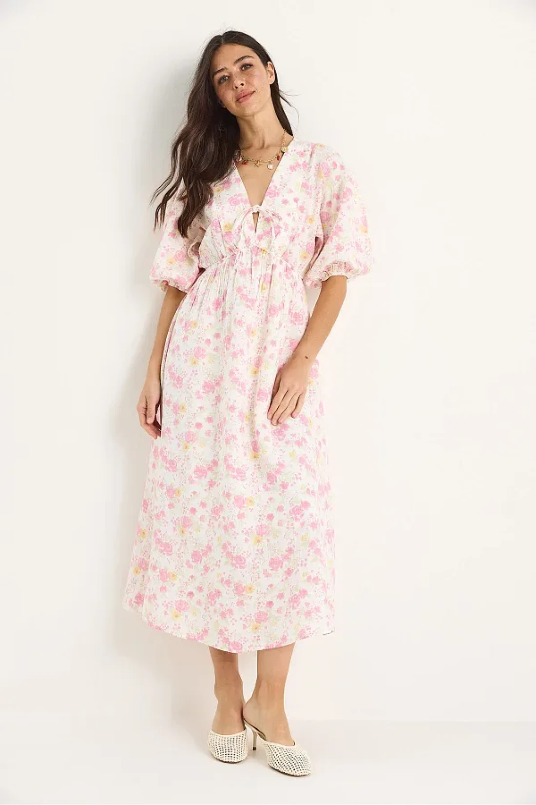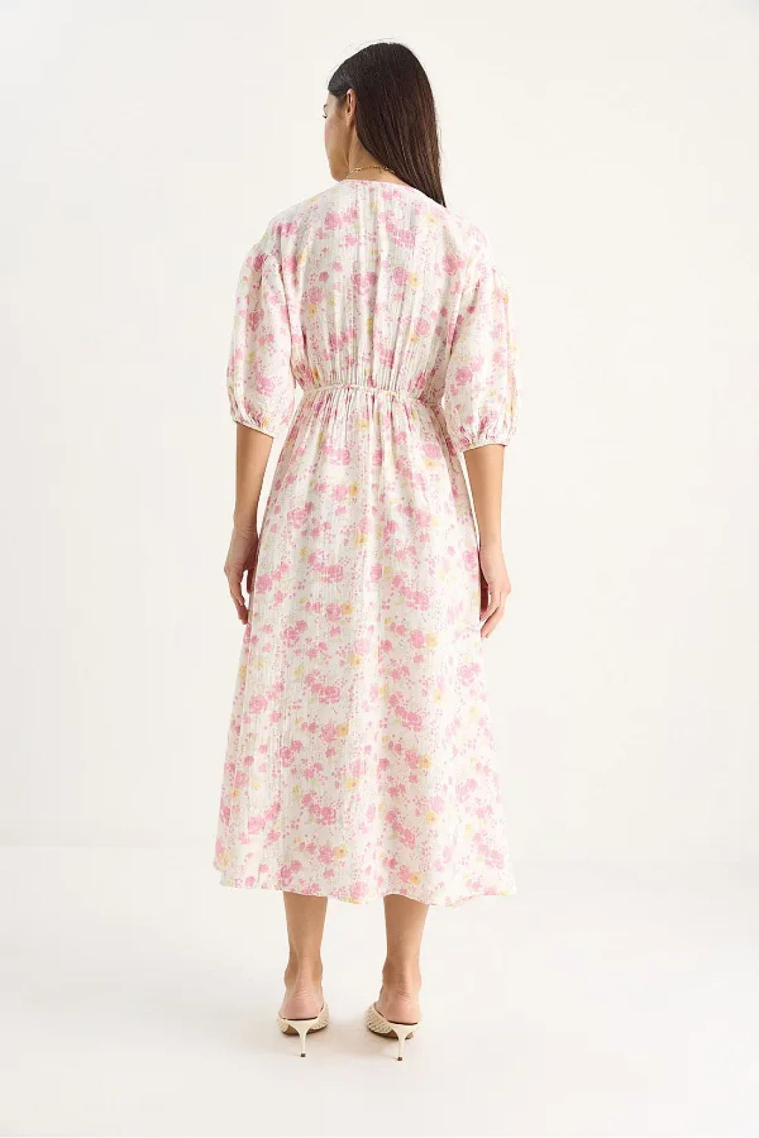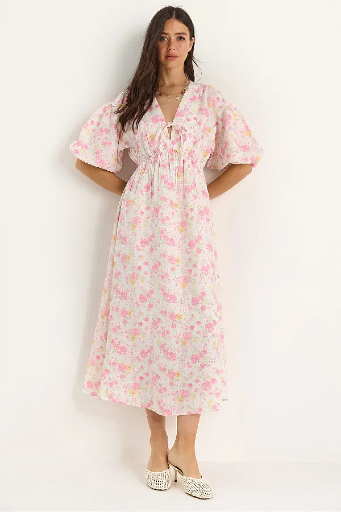 Bianco Lucci فستان نسائي من الموسلين مبطن بأكمام بالون وحزام مطاطي 3057 60283403