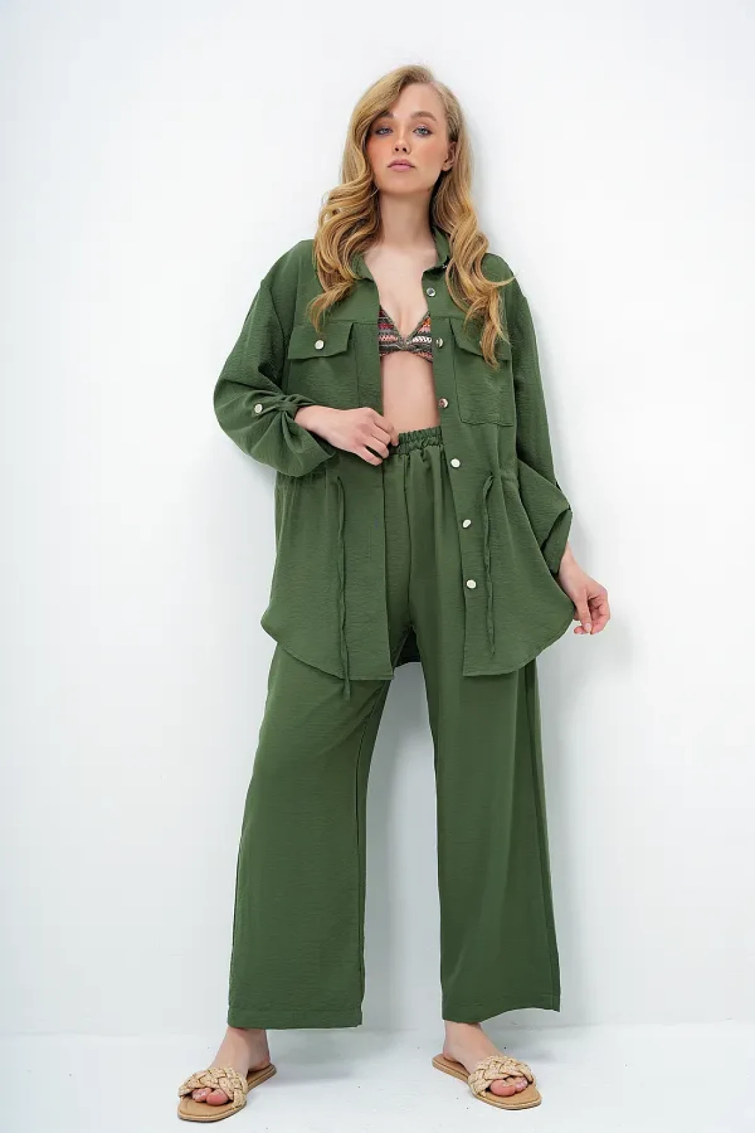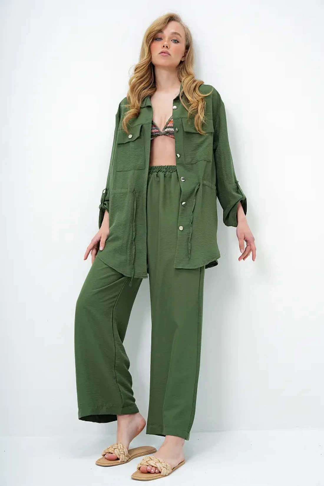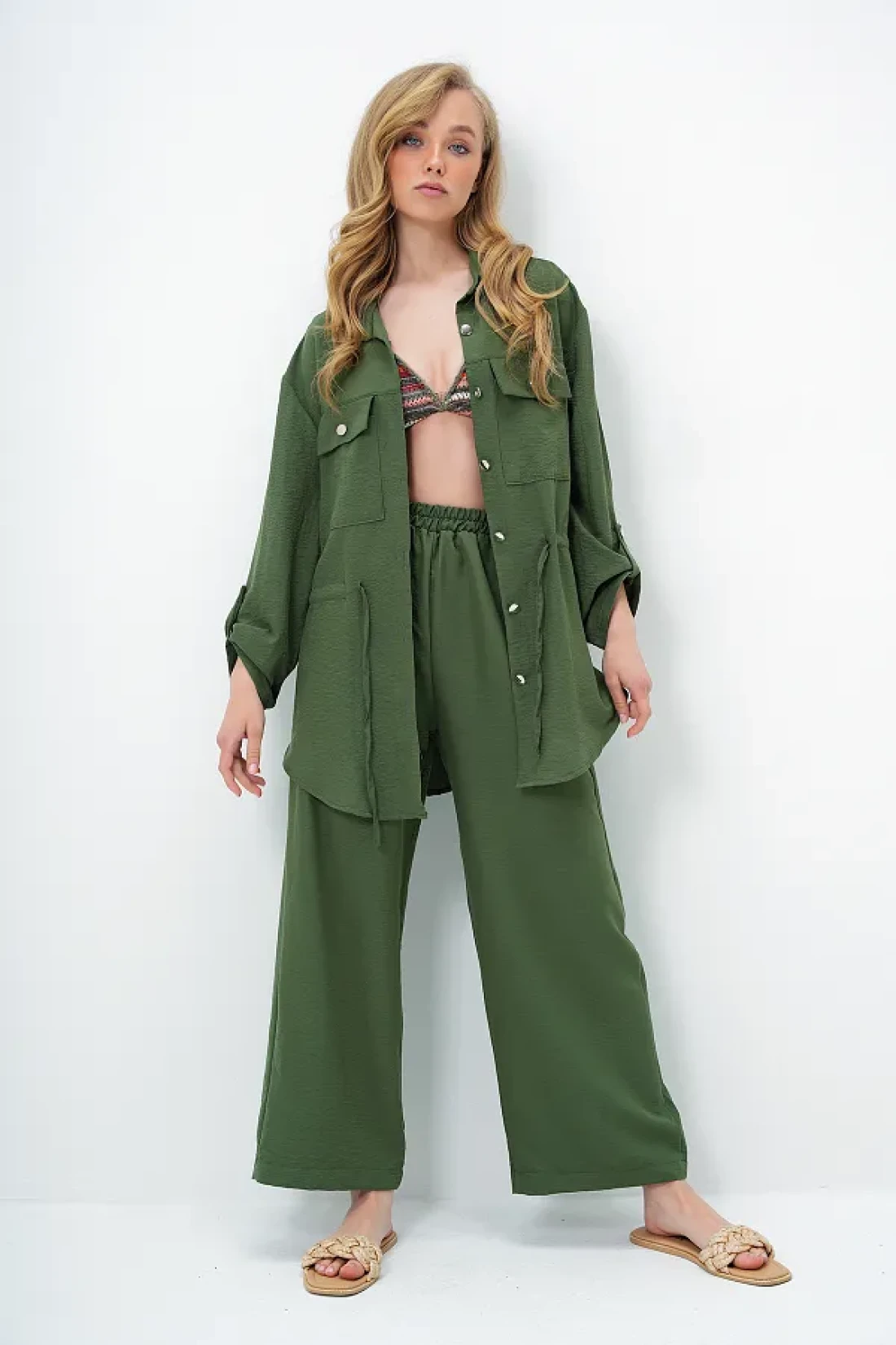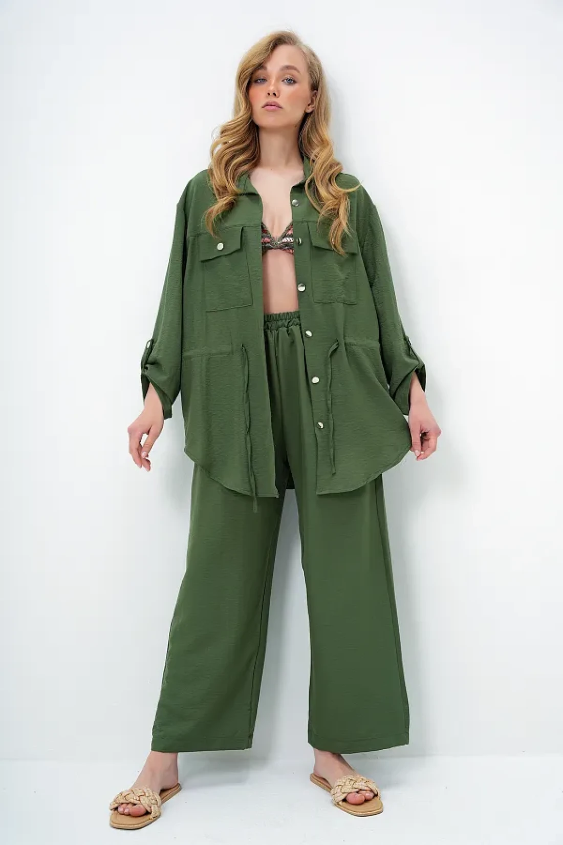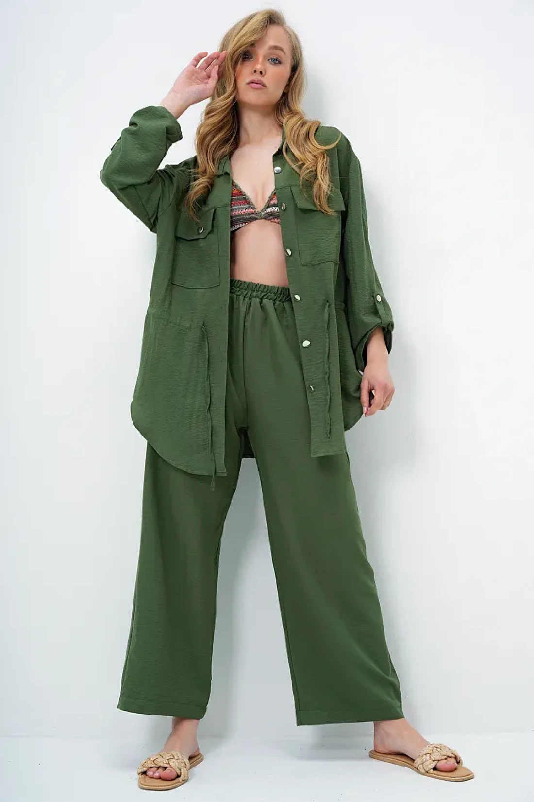 Trend Alaçatı Stili بدلة سفاري كاكي بجيب مزدوج للسيدات وبنطلون Aerobin واسع الساق بخصر مطاطي Ymx8448
