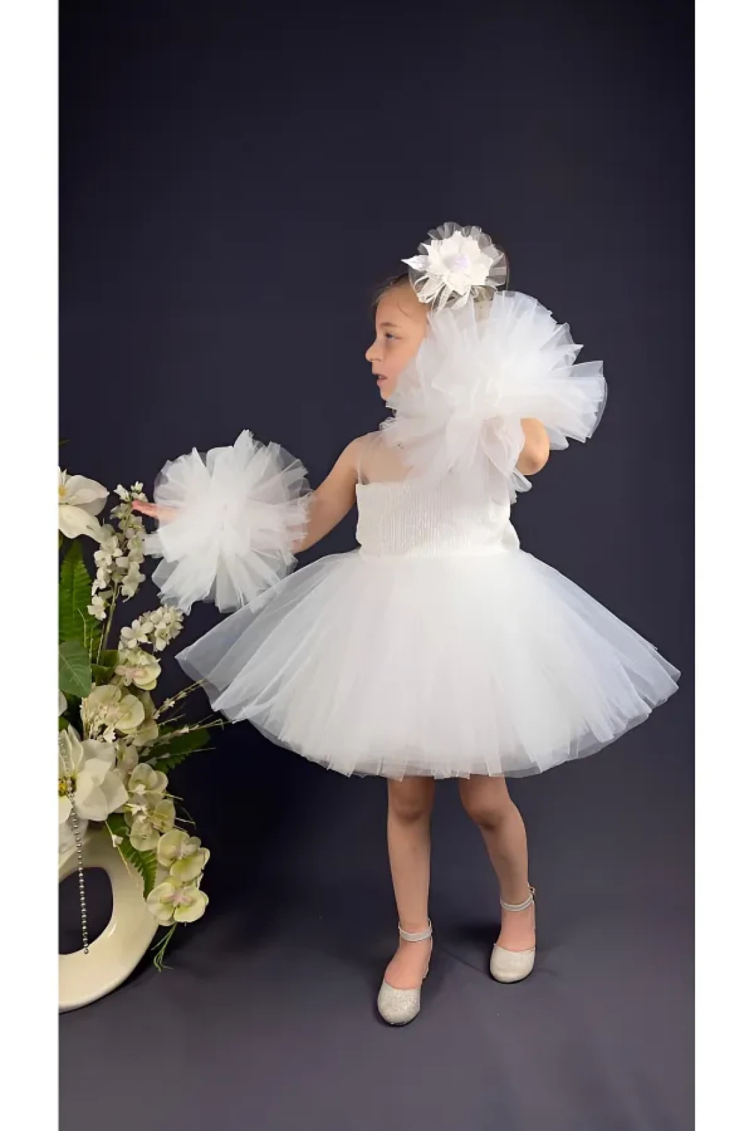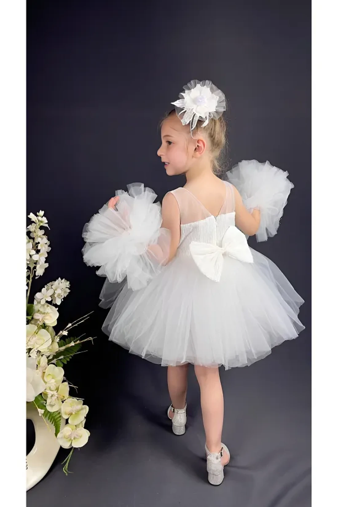 BAMBİNO KİDS فستان سهرة من الشيفون بأكمام بوم بوم مطرز بالترتر للفتيات مع تنورة منفوشة