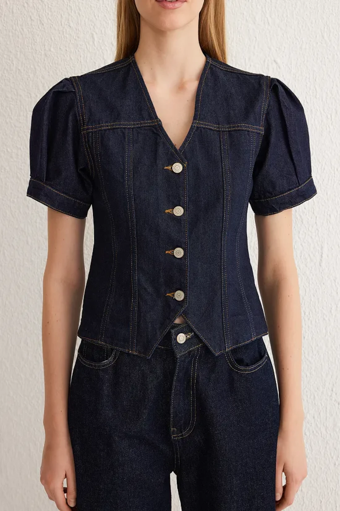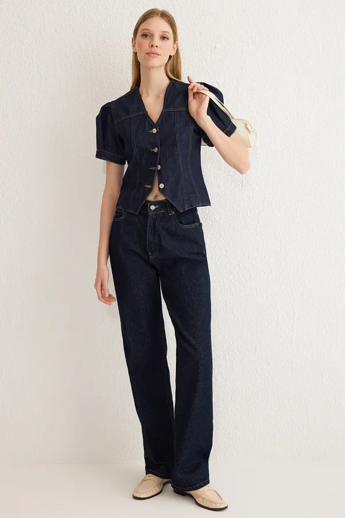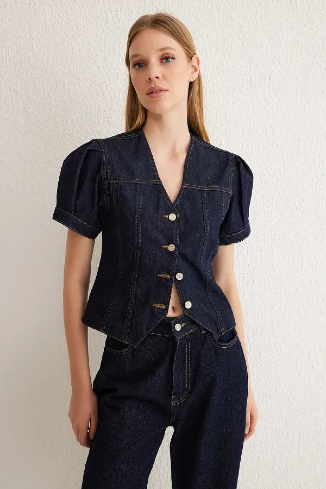 Collection بلوزة من قماش الدنيم بأكمام قصيرة باللون الأزرق الداكن ورقبة على شكل حرف V TWOSS25BZ00000