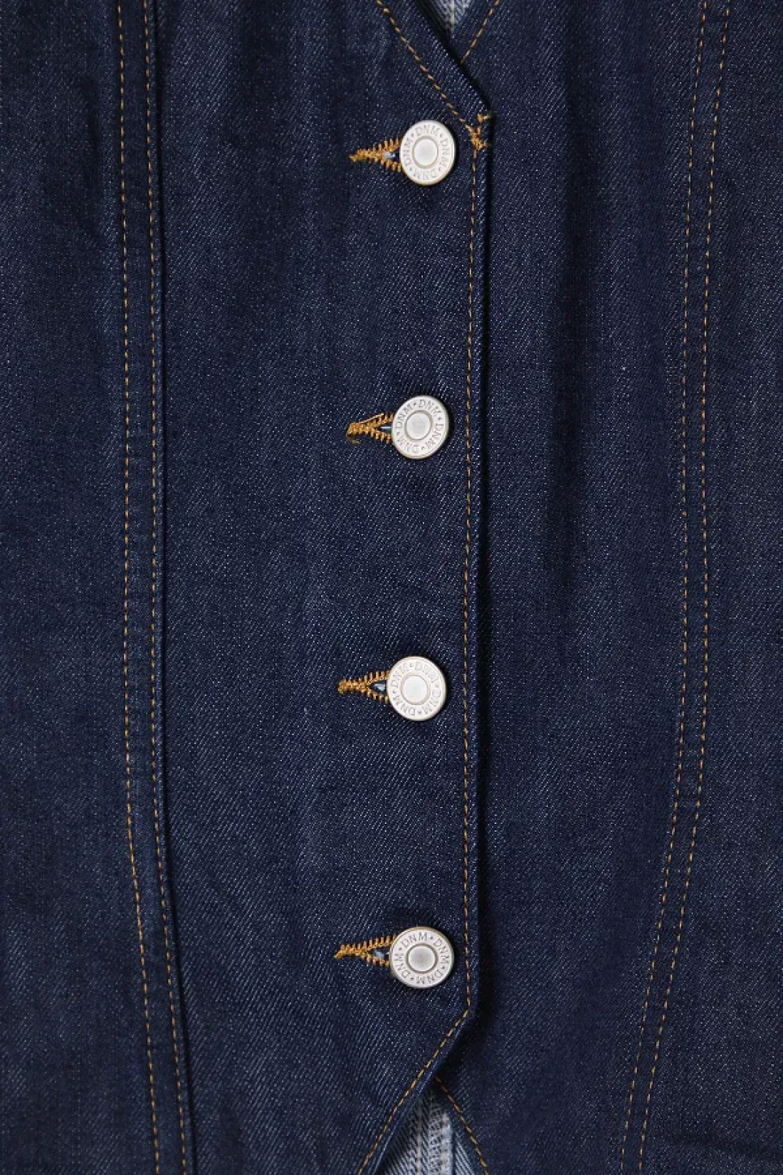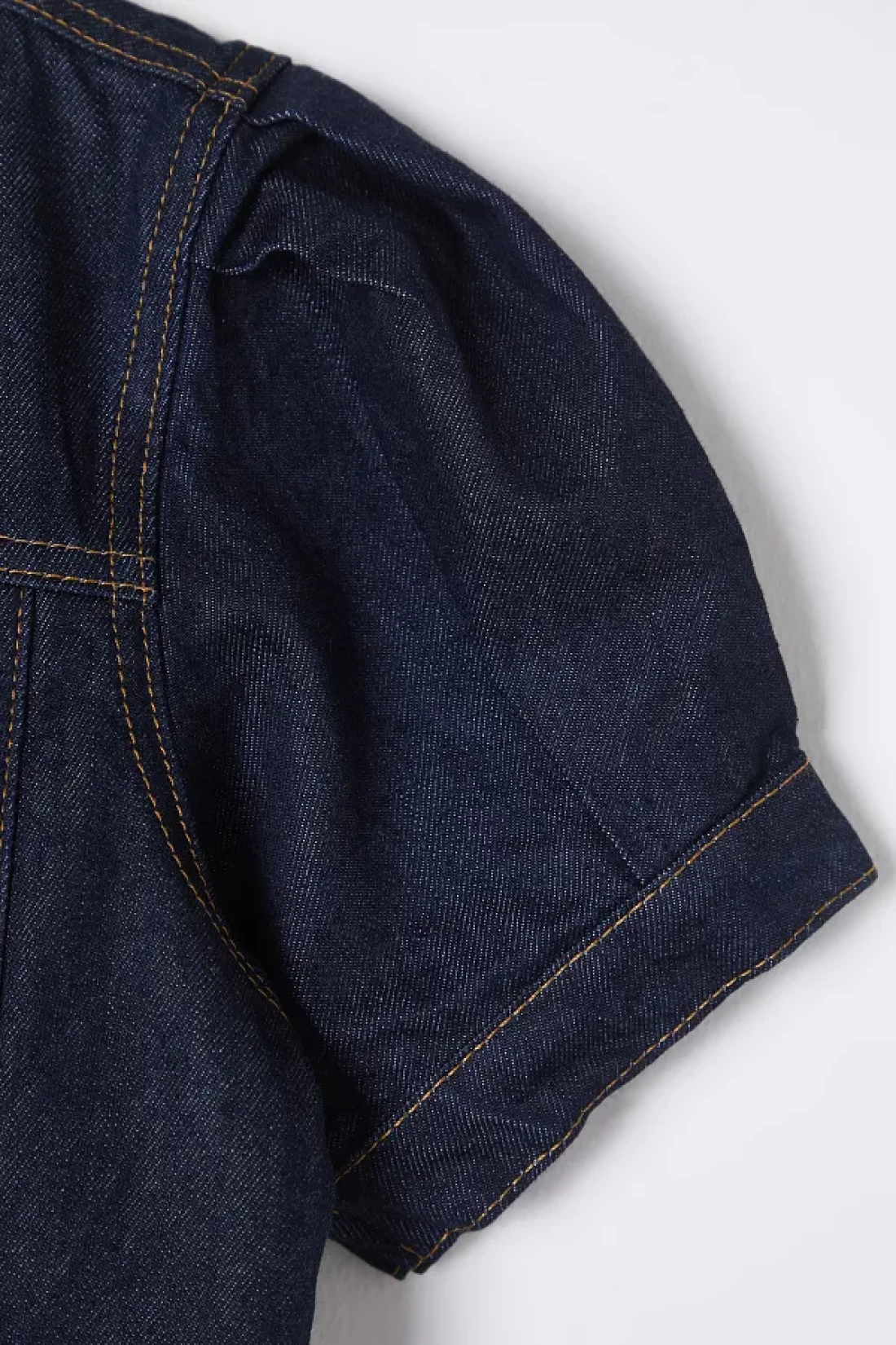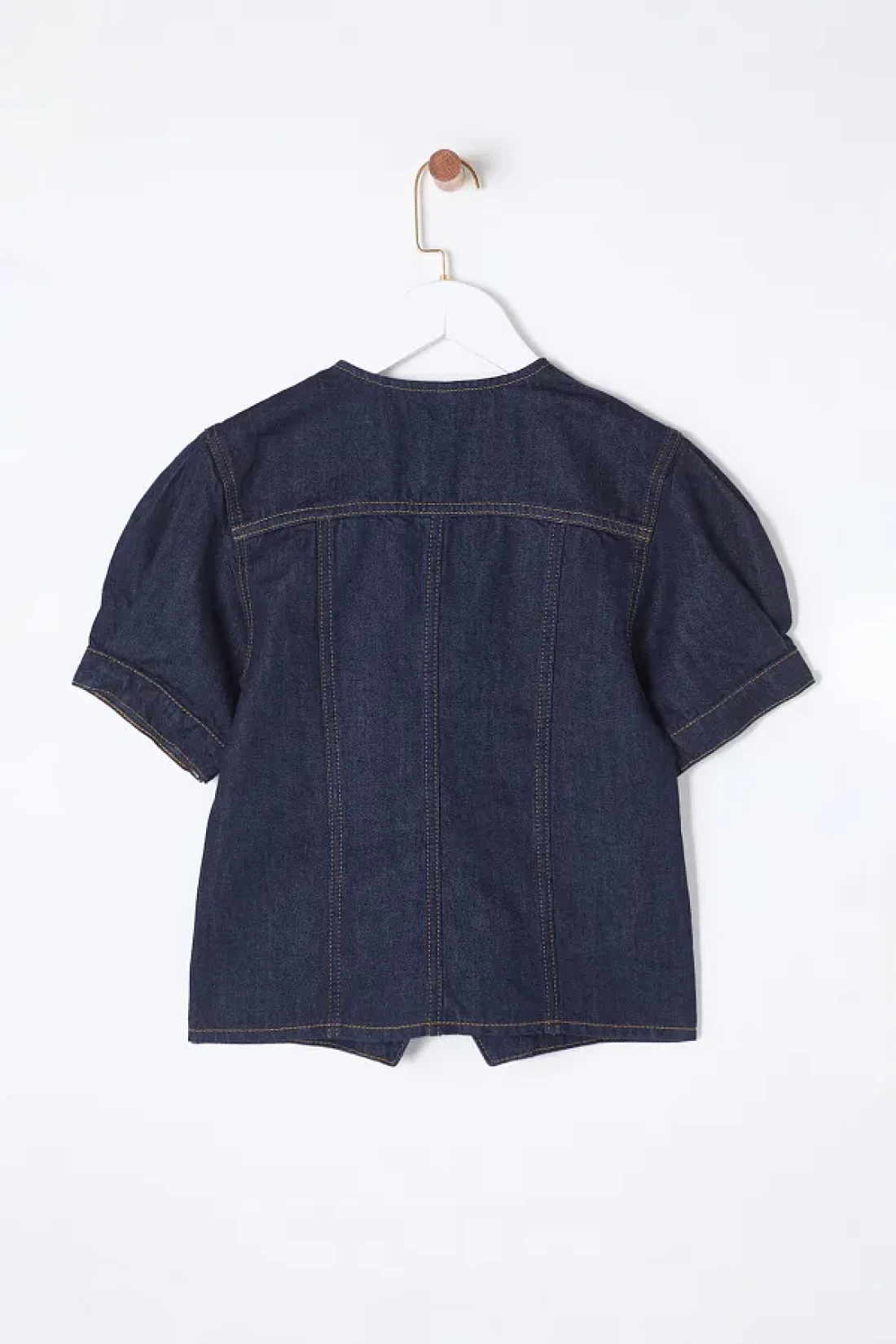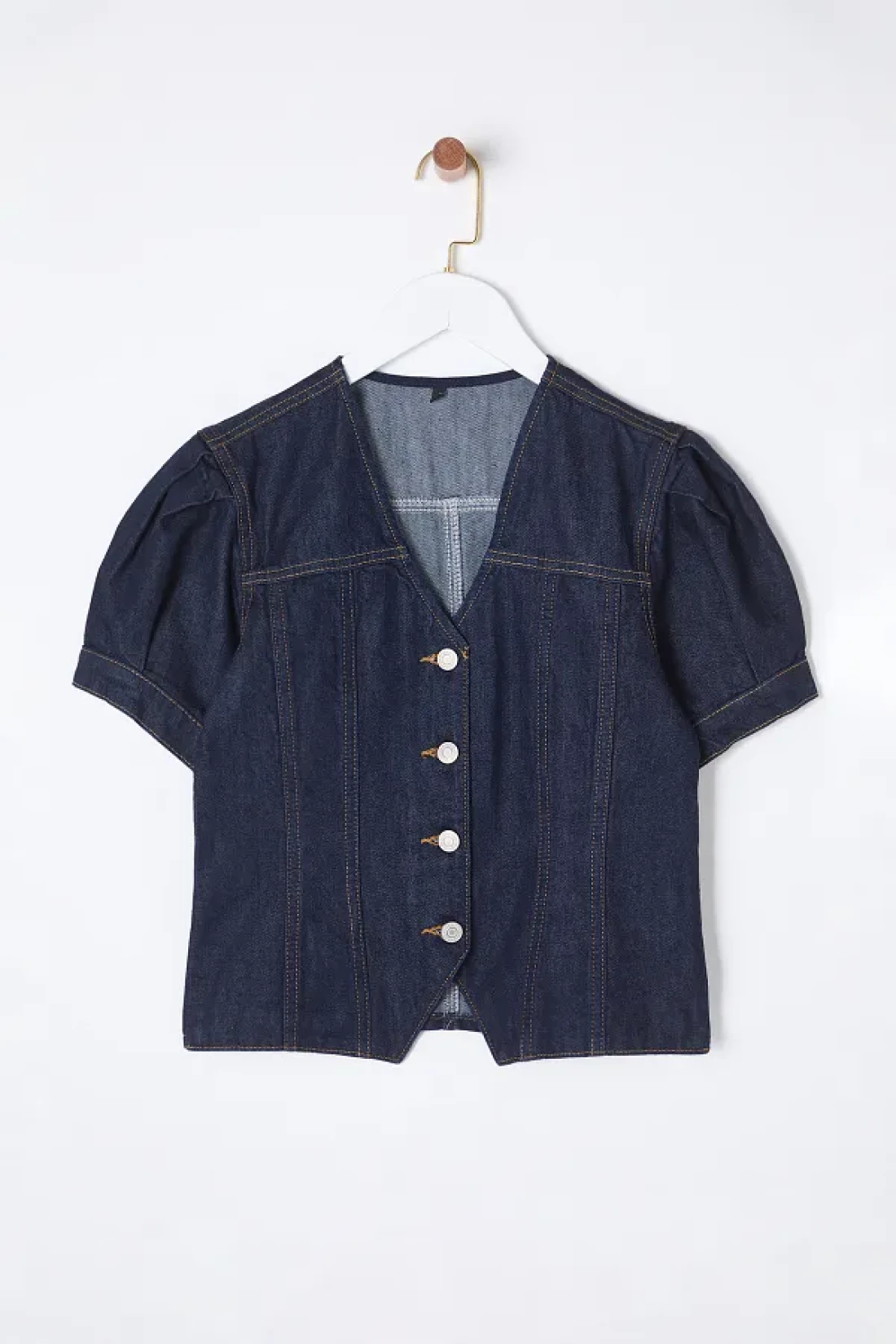 Collection بلوزة من قماش الدنيم بأكمام قصيرة باللون الأزرق الداكن ورقبة على شكل حرف V TWOSS25BZ00000