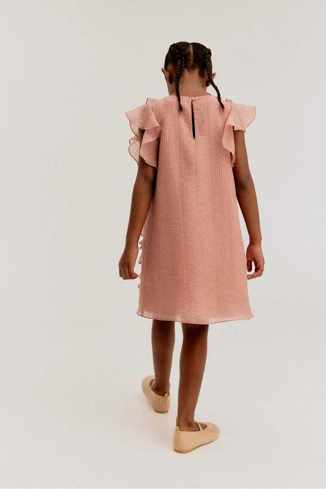 فستان من نسيج ناعم ومجعد مع كشكشة زخرفية على طول الجزء الأمامي. رقبة مستديرة، فتحة على شكل مفتاح مع زر في الخلف وأكمام مرفرفة. مبطن.