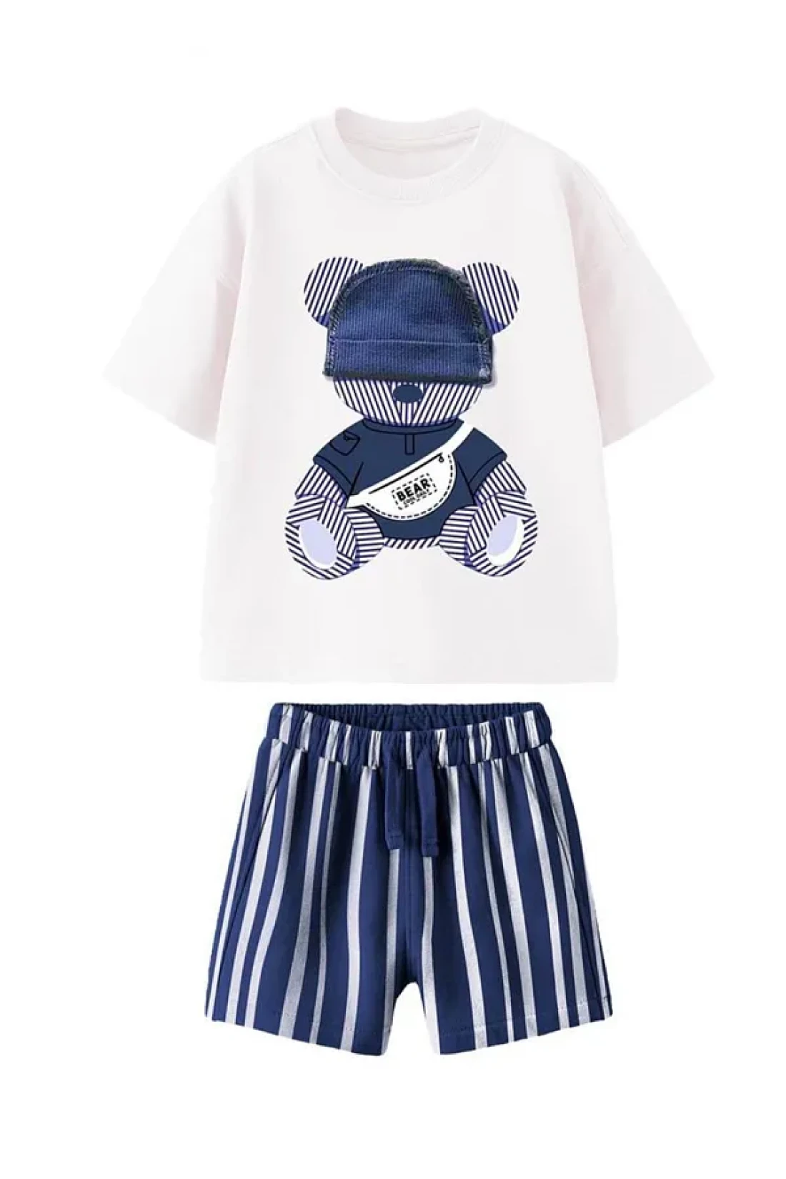 Monila طقم تي شيرت قطني مطبوع عليه دمية دب بتفاصيل قبعة للأولاد