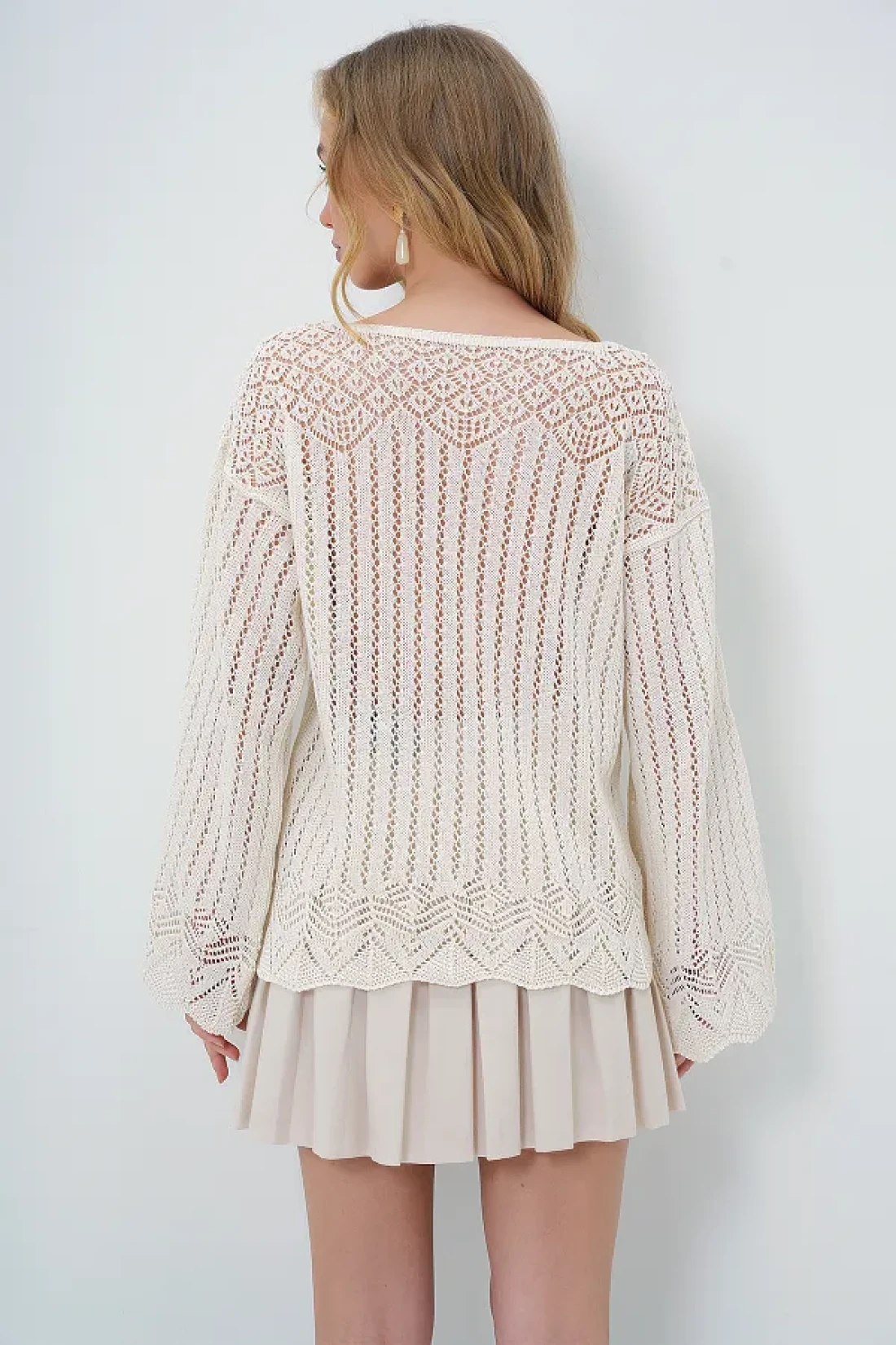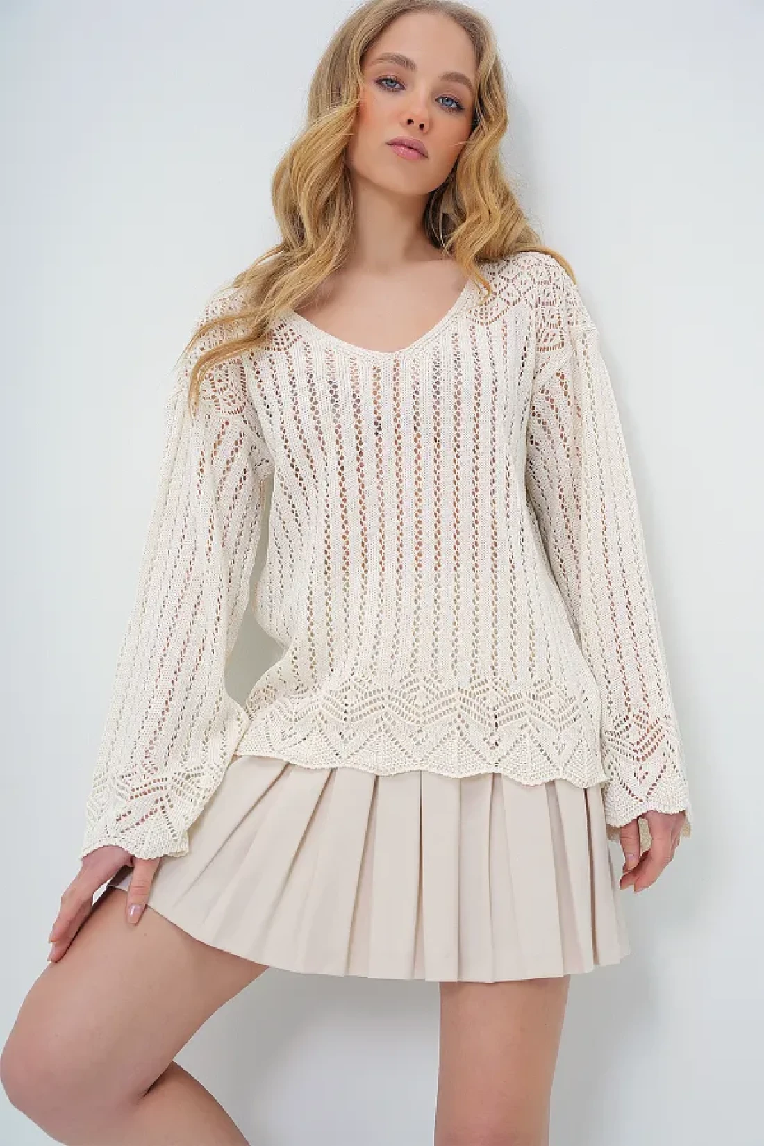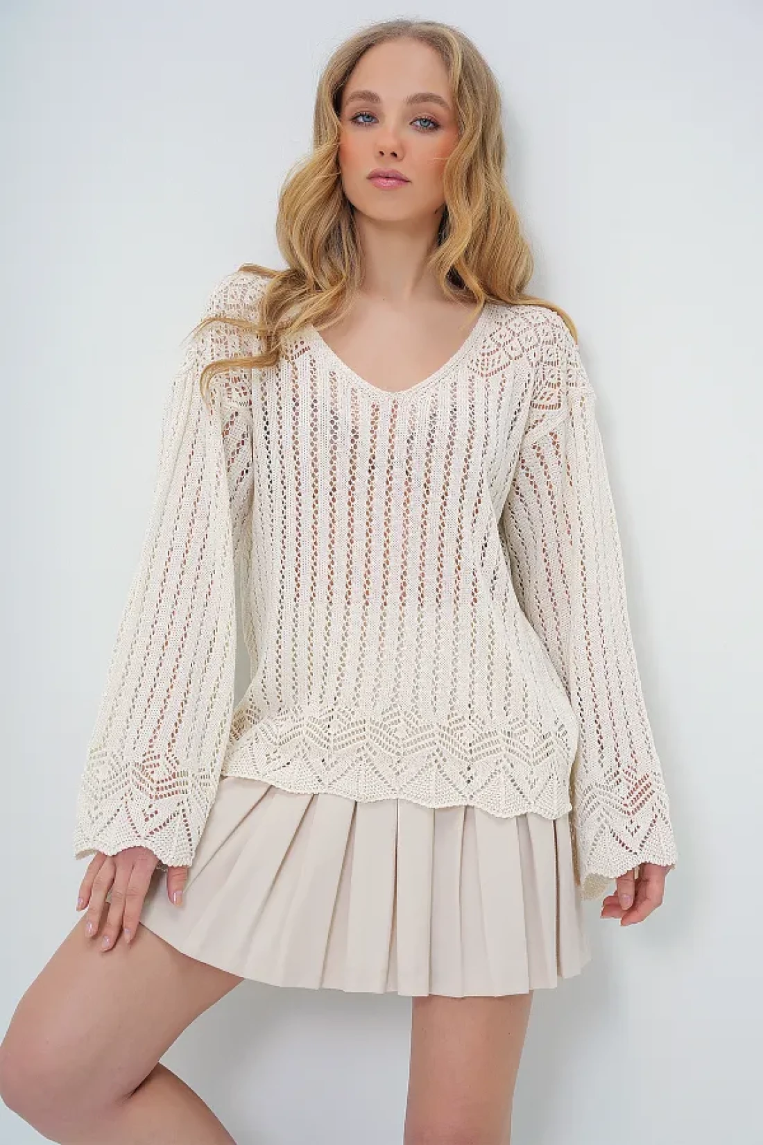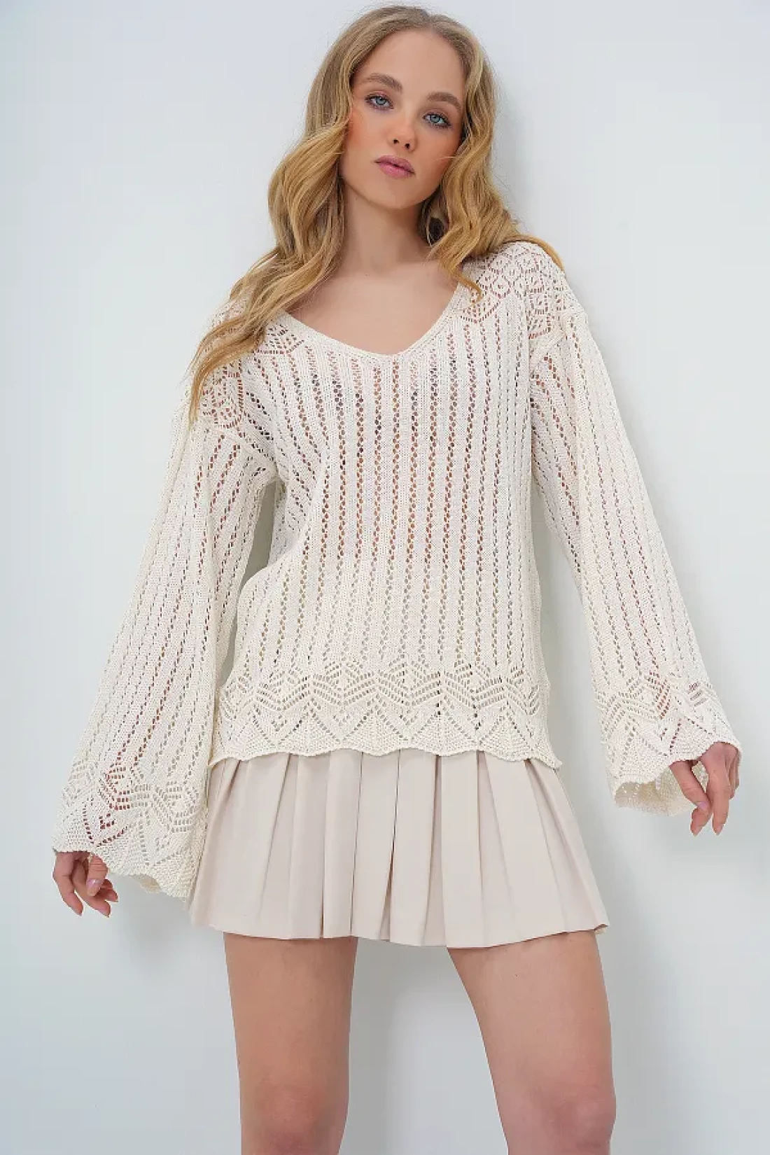 Trend Alaçatı Stili بلوزة تريكو صيفية مخرمة برقبة قارب فانيليا للسيدات ALC-X10640