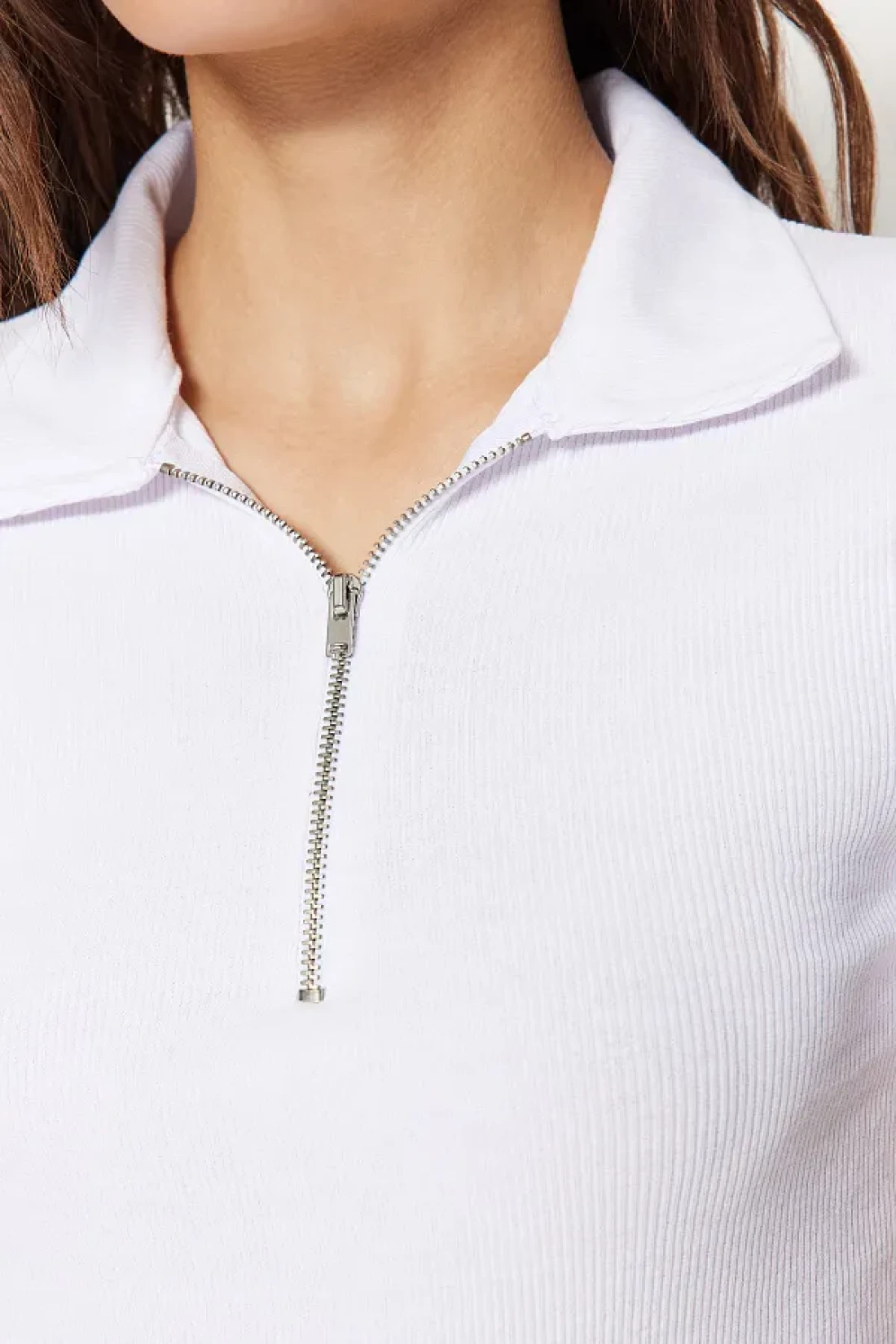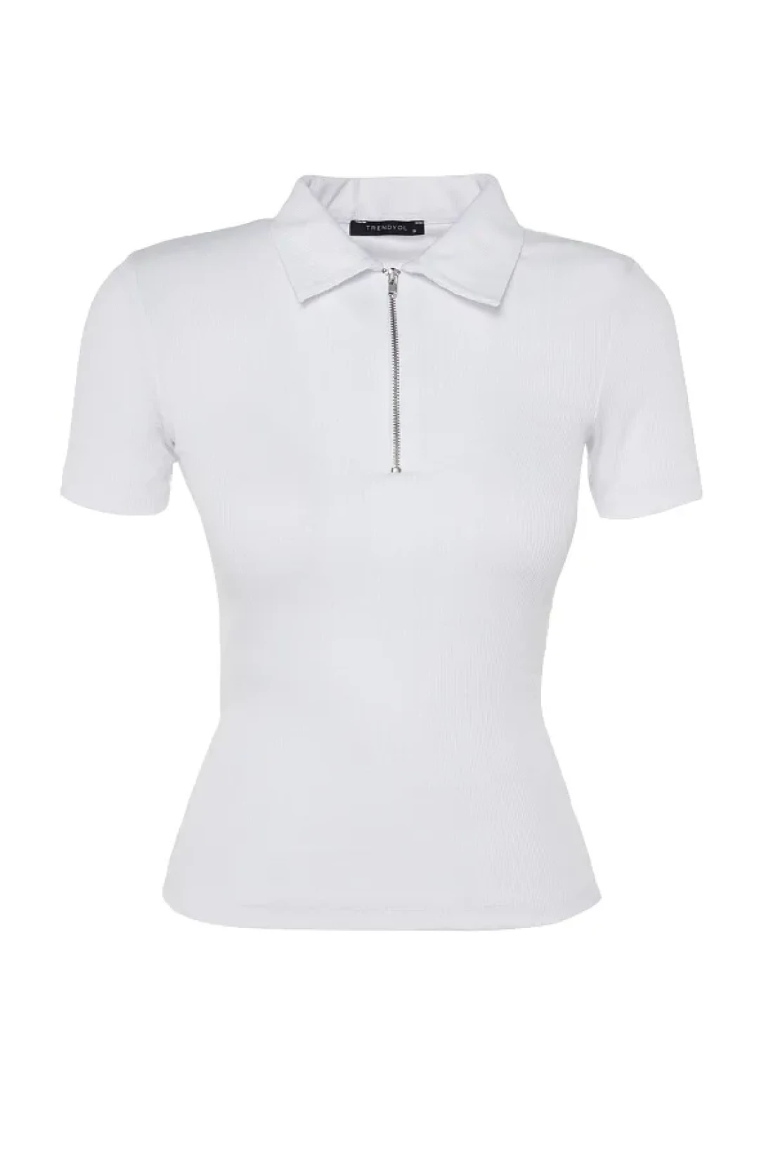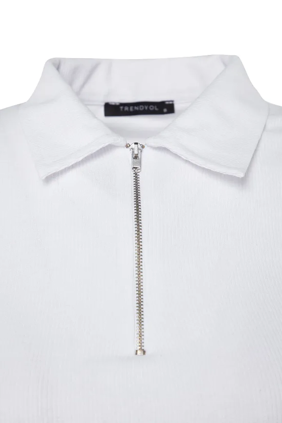 Collection بلوزة بيضاء بسحاب ومفصلة وياقة بولو ومضلعة ومتماسكة TWOSS23BZ00496
