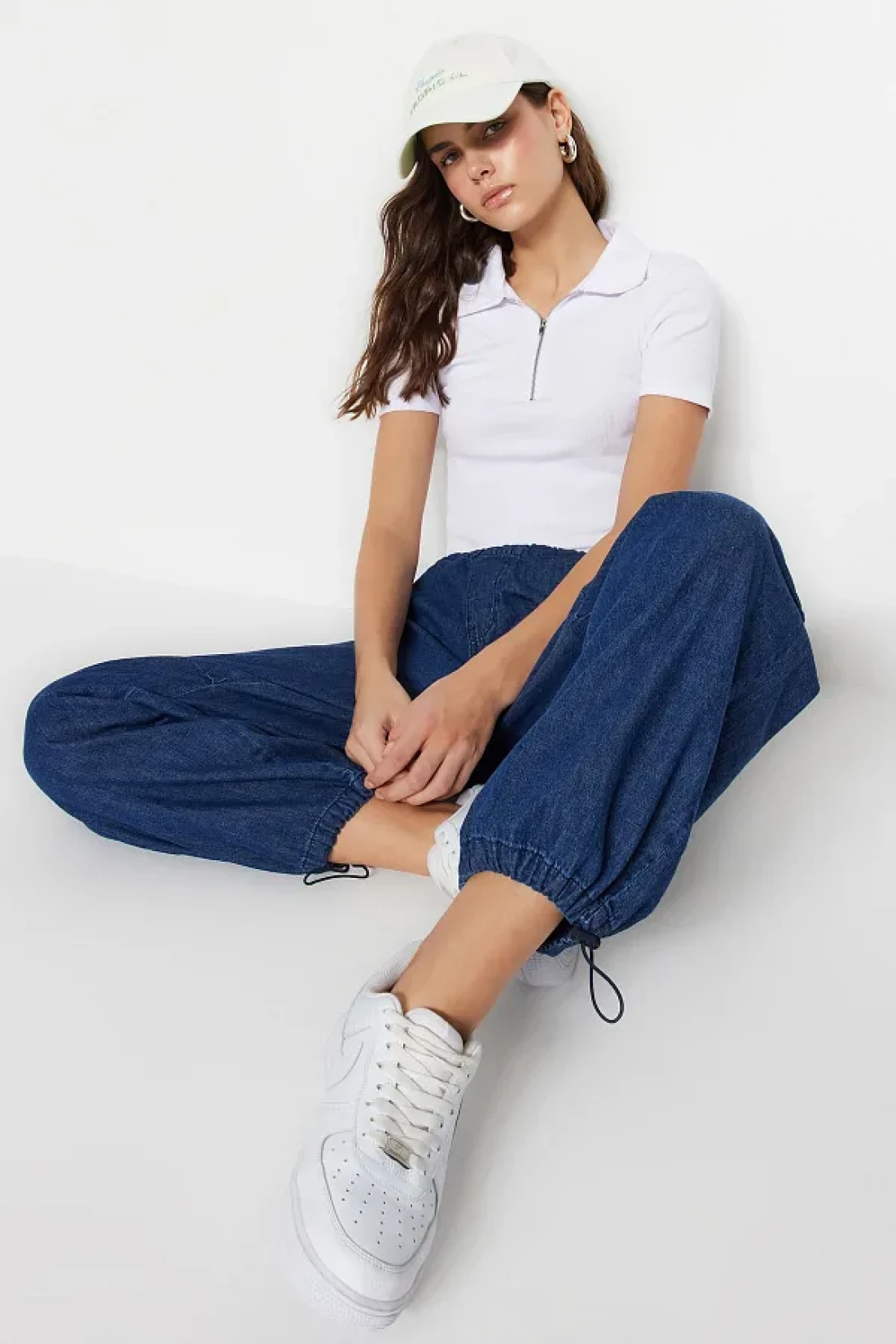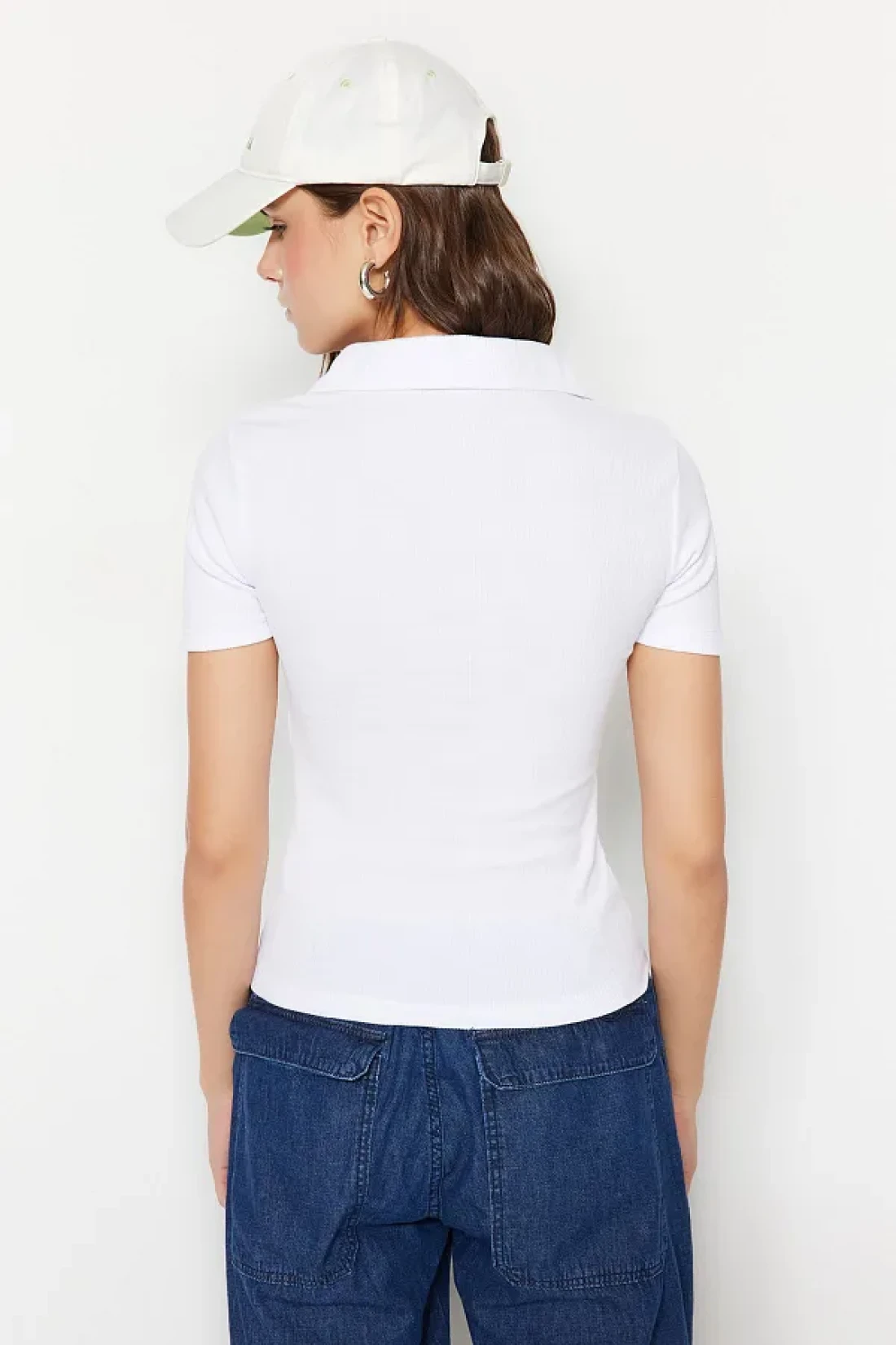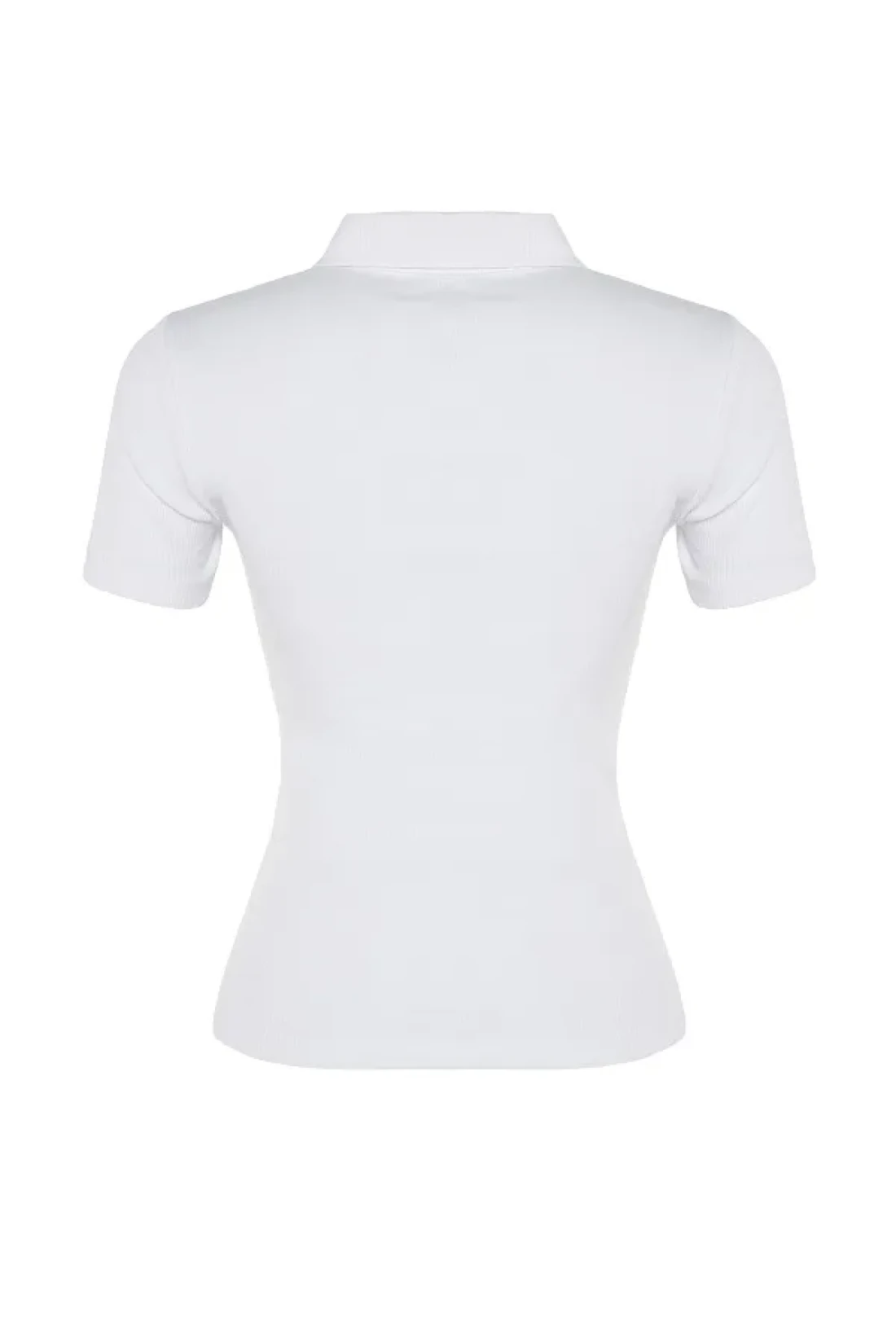 Collection بلوزة بيضاء بسحاب ومفصلة وياقة بولو ومضلعة ومتماسكة TWOSS23BZ00496