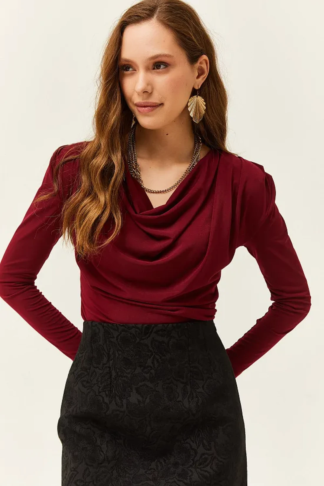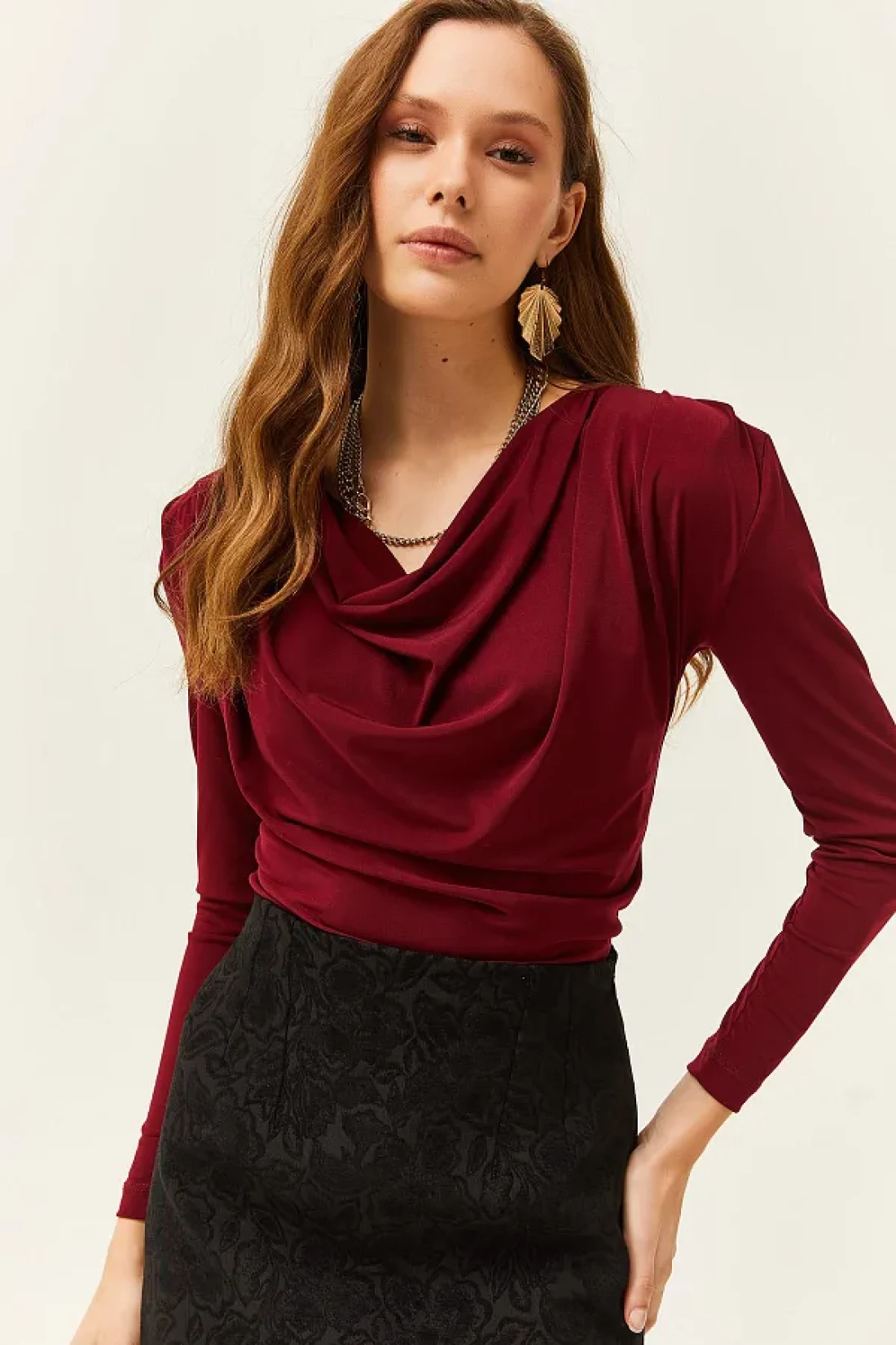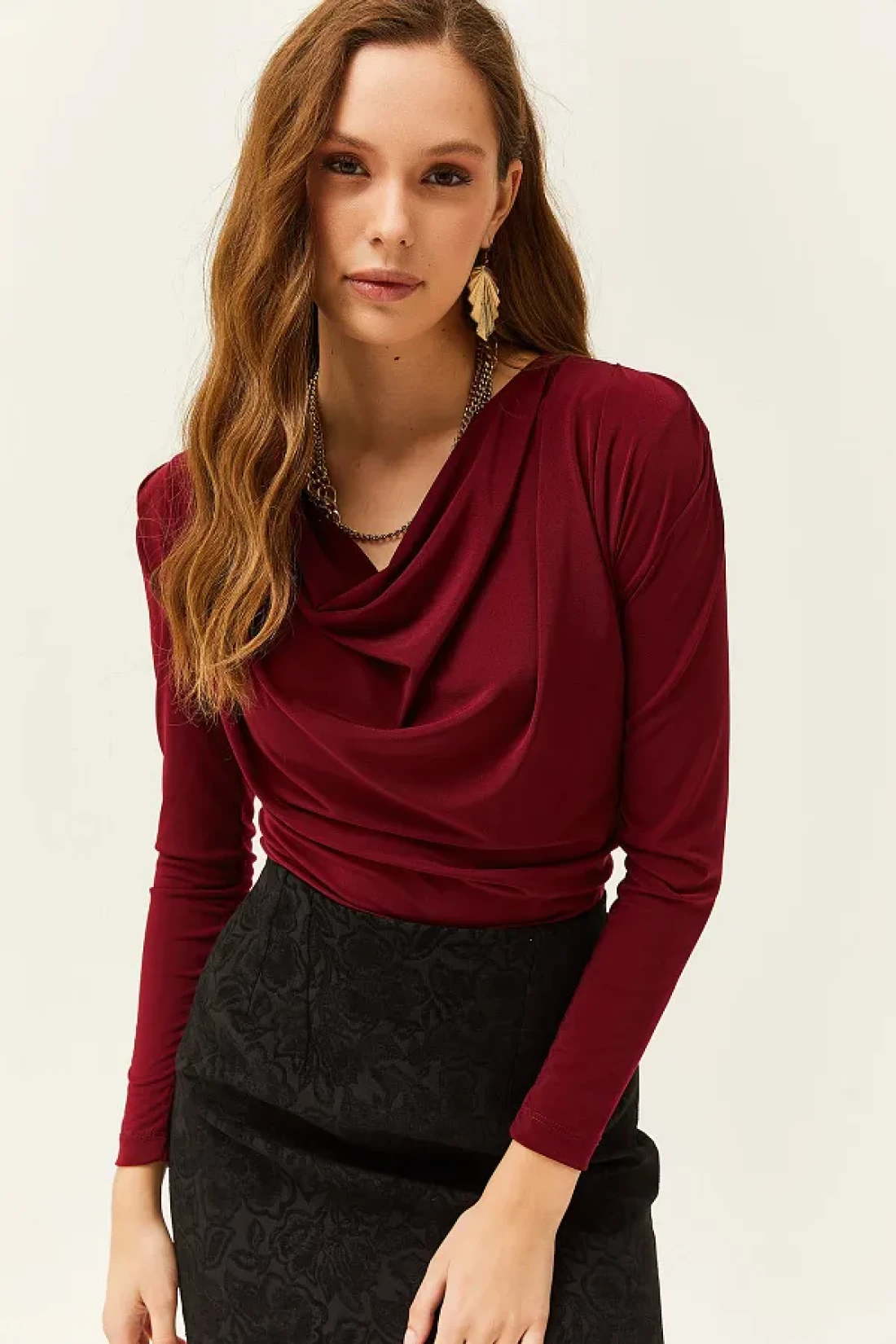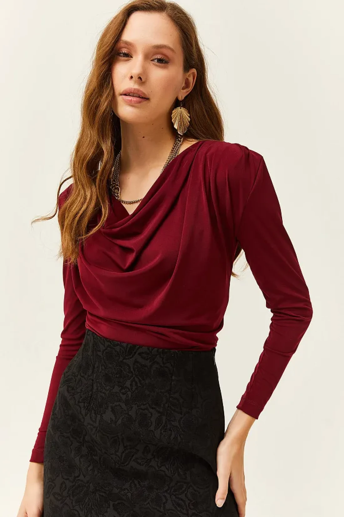 Olalook بلوزة نسائية بياقة مطوية مبطنة باللون الأحمر الداكن BLZ-19002419