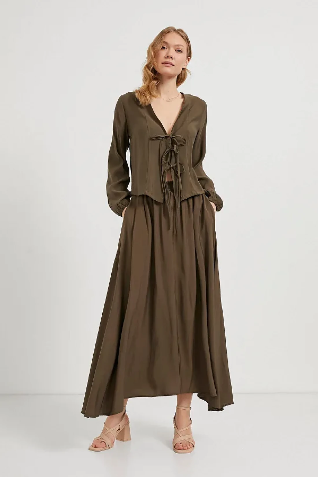 "في ملابس النساء، هذه ""التنورة الطويلة المكشوفة""، التي تعد مرشحة لتكون جزءًا من خزانة ملابسك التي تعد بأناقة سهلة، تقدم الأناقة والراحة طوال اليوم في أواخر الربيع المعتدلة في اسطنبول وأيام الصيف الحارة. بفضل نسيجها الخفيف والقابل للتنفس (مثل القطن، الفسكوز، الكتان الناعم) من القماش الفاخر ""الصيفي""، فإنها توفر استخدامًا باردًا ومنعشًا حتى في الطقس الأكثر حرارة دون أن تثقل كاهلك."