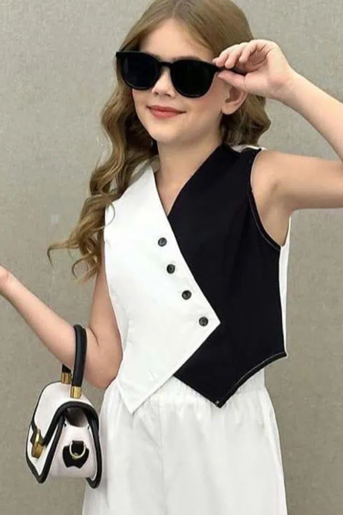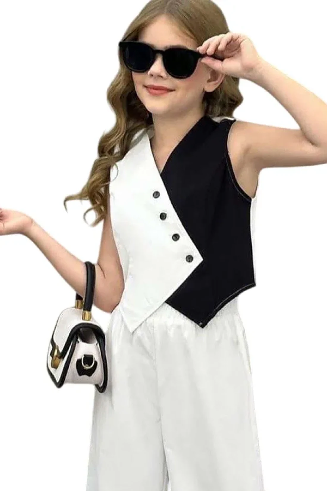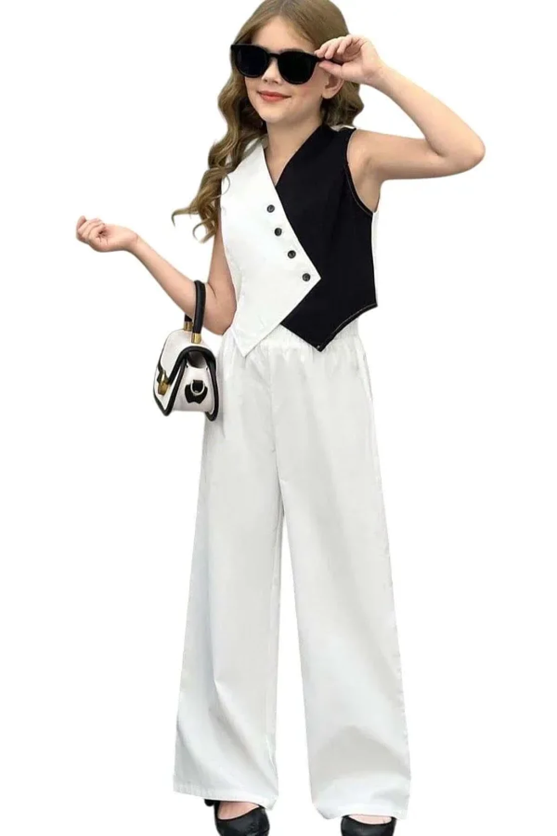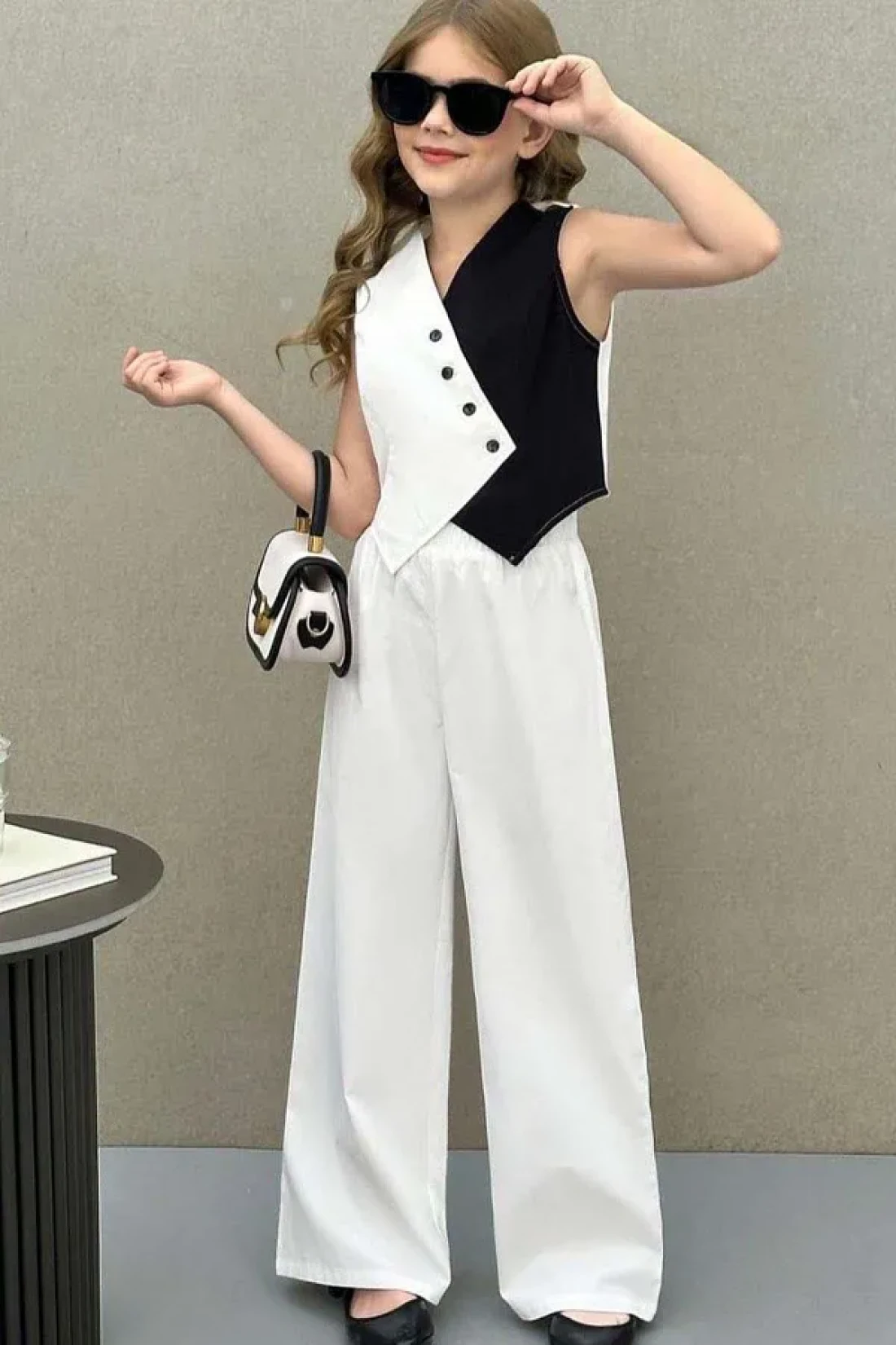 سترة مزدوجة اللون للفتيات بقصة غير متماثلة بنطلون واسع الأرجل مجموعة علوية وسفلية معلومات المنتج: 90% قطن، سترة مزدوجة اللون بتفاصيل أزرار غير متماثلة.