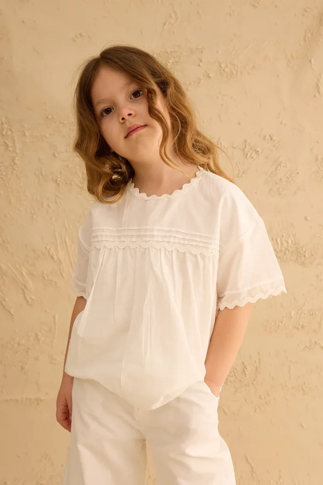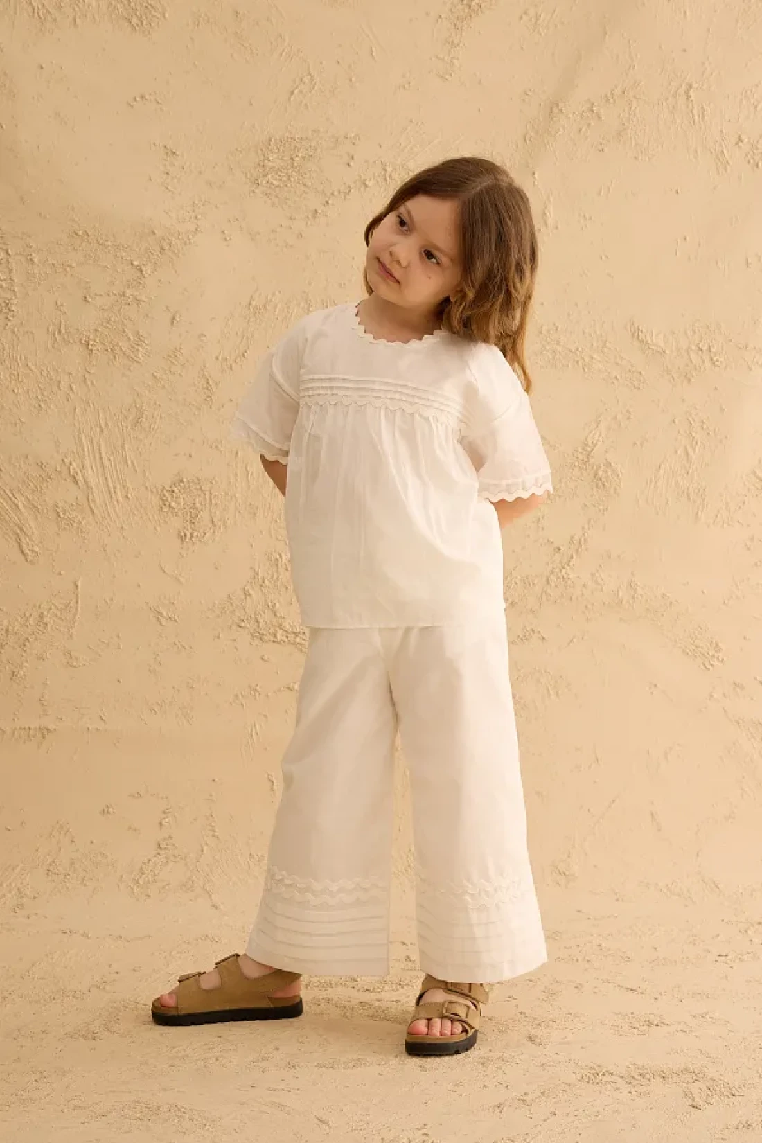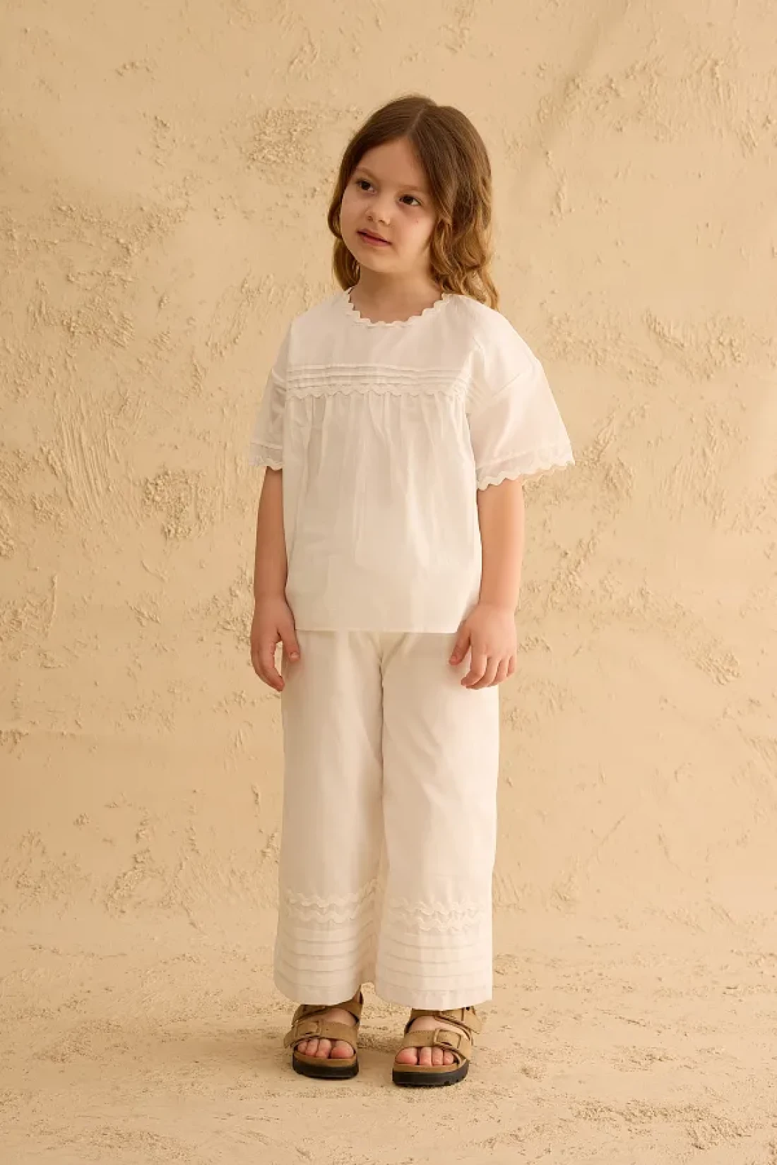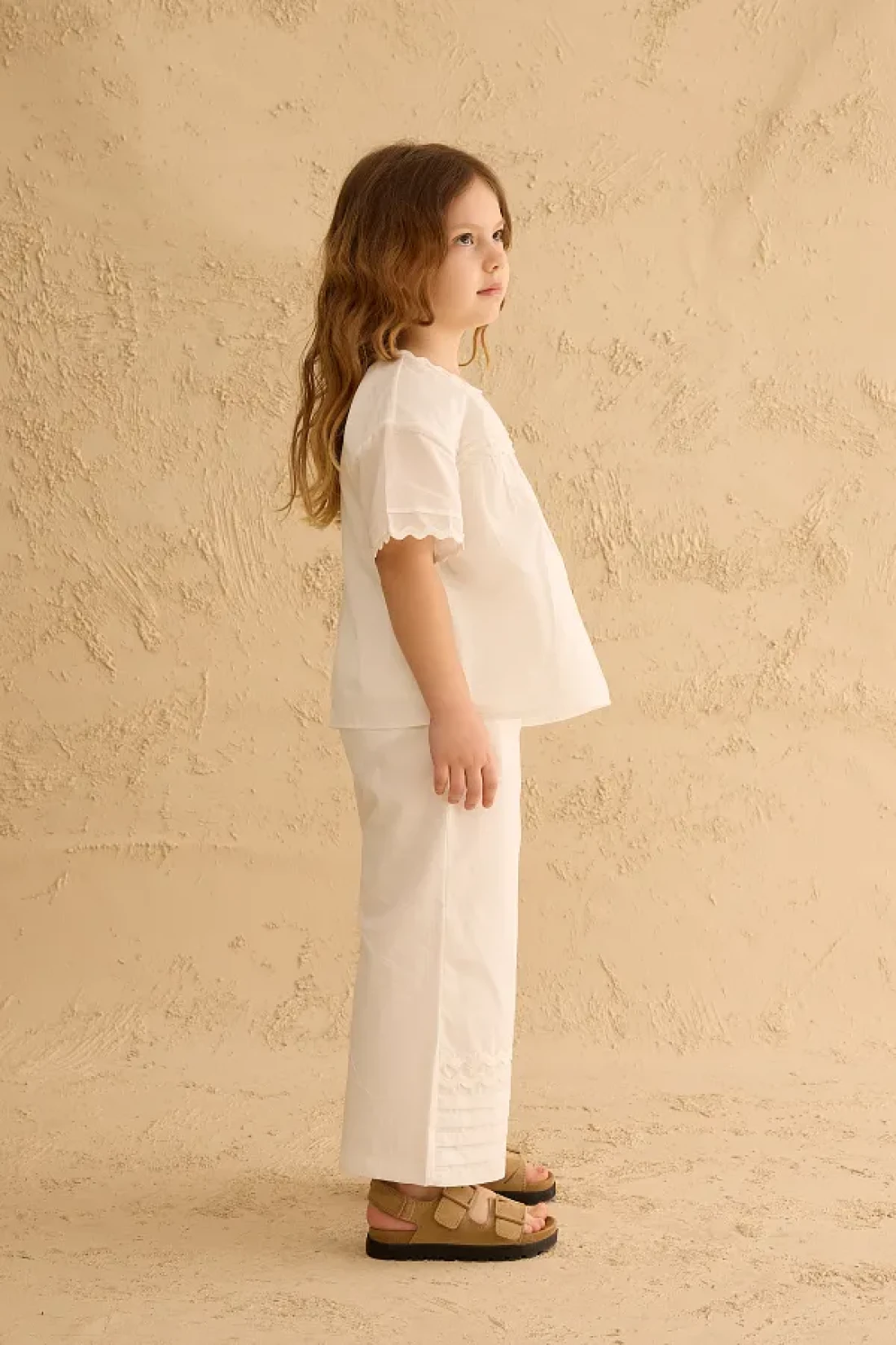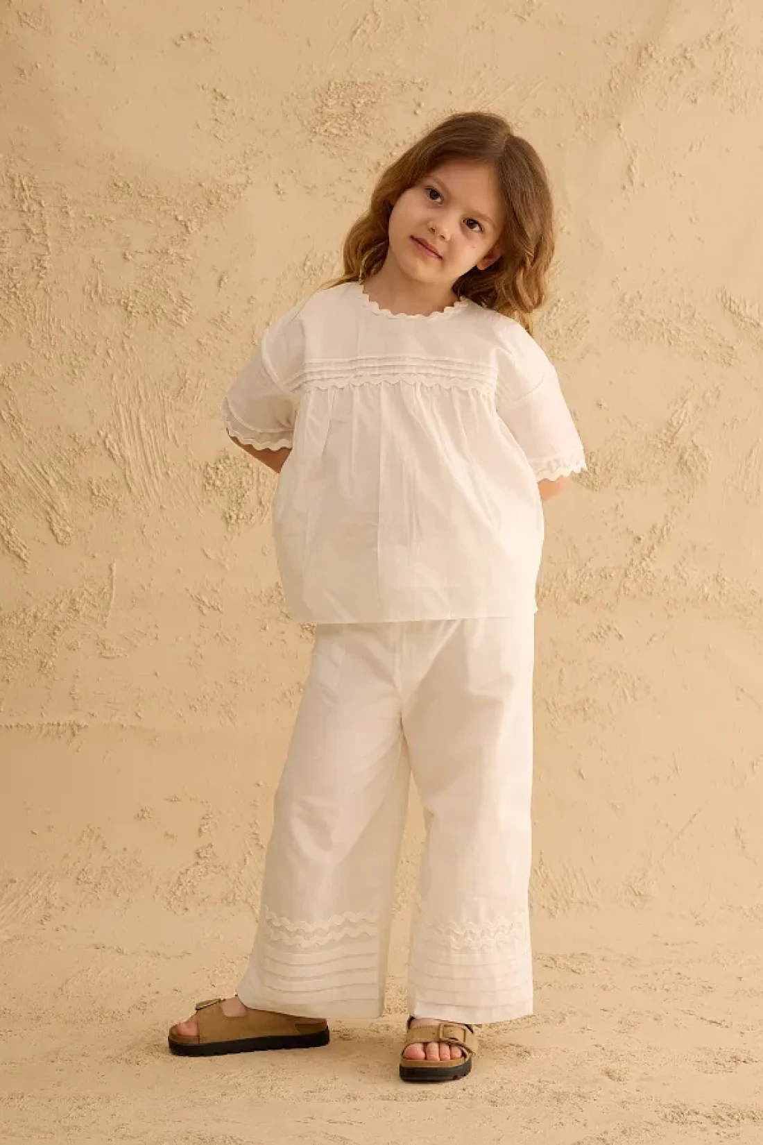 مجموعة بنطلون مصنوعة من قماش الفوال القطني 100٪، مع تفاصيل مضلعة وحزام في الأمام، وإغلاق بسحاب في الخلف، وقميص بأكمام قصيرة وخصر مرن، مع جيوب، وسروال بتفاصيل مضلعة على الساق.