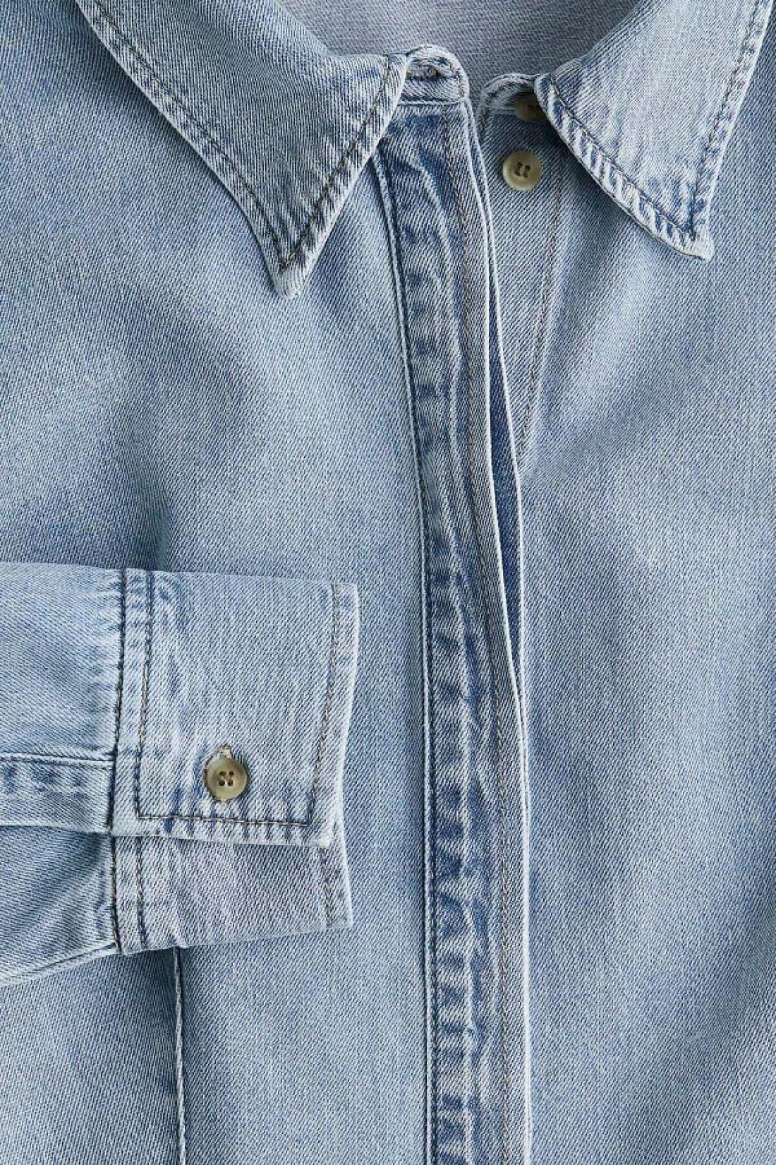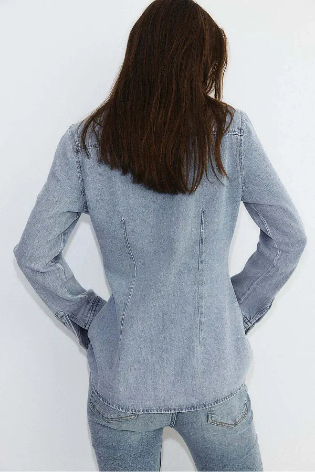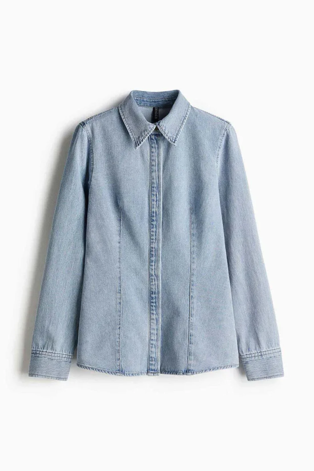 قميص ملائم من قماش الدنيم الصلب يتميز بياقة وأزرار مخفية على طول الجزء الأمامي وأكمام طويلة وأصفاد بأزرار؛ خصر مدبب مع طيات وحاشية مستديرة بلطف.