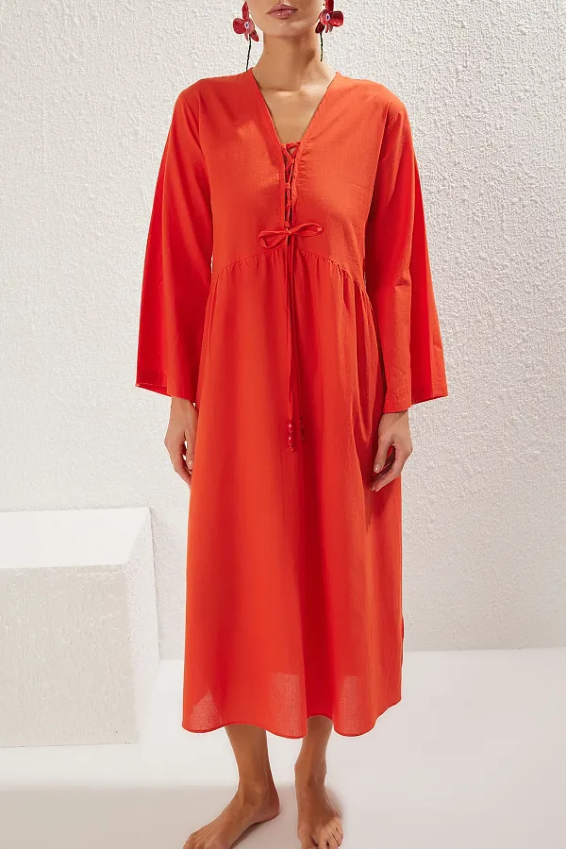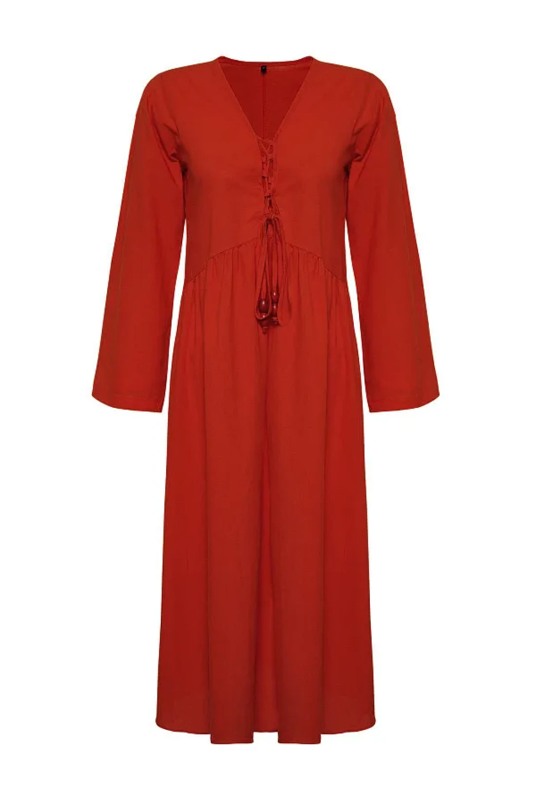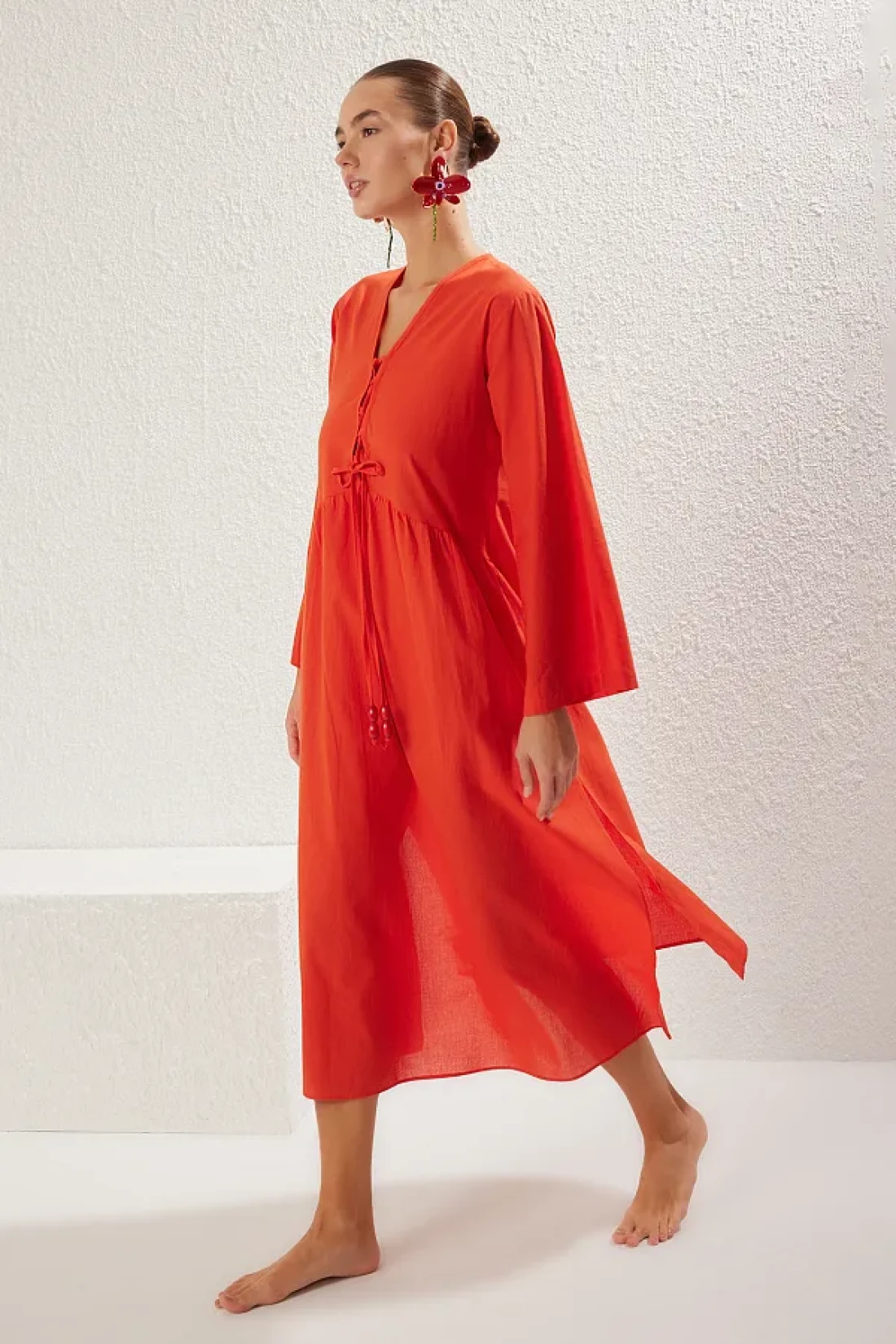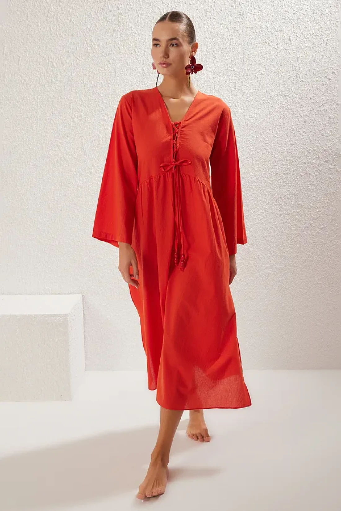 Collection فستان شاطئ ماكسي منسوج باللون الأحمر مصنوع من القطن بنسبة 100% TBESS25EL00015