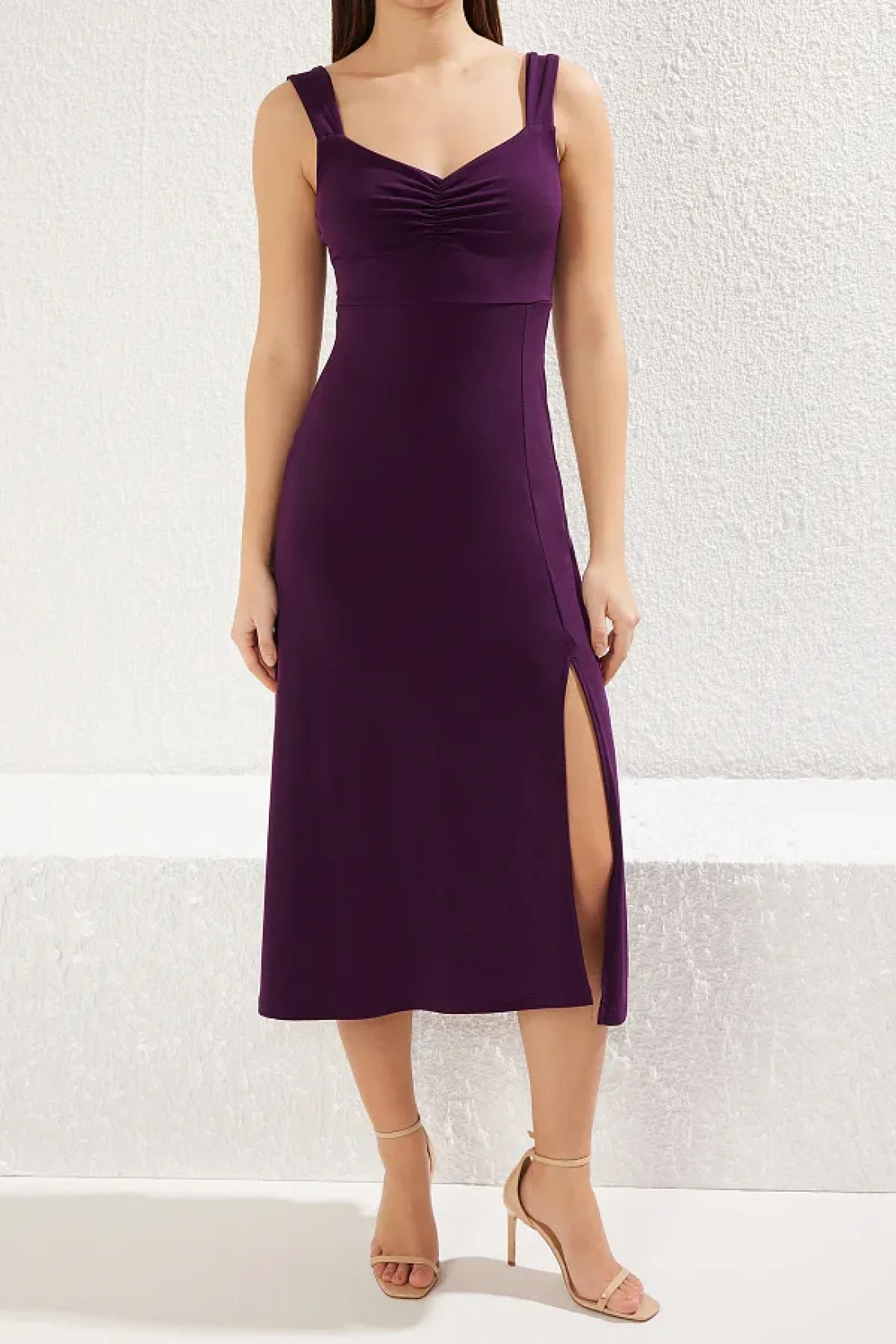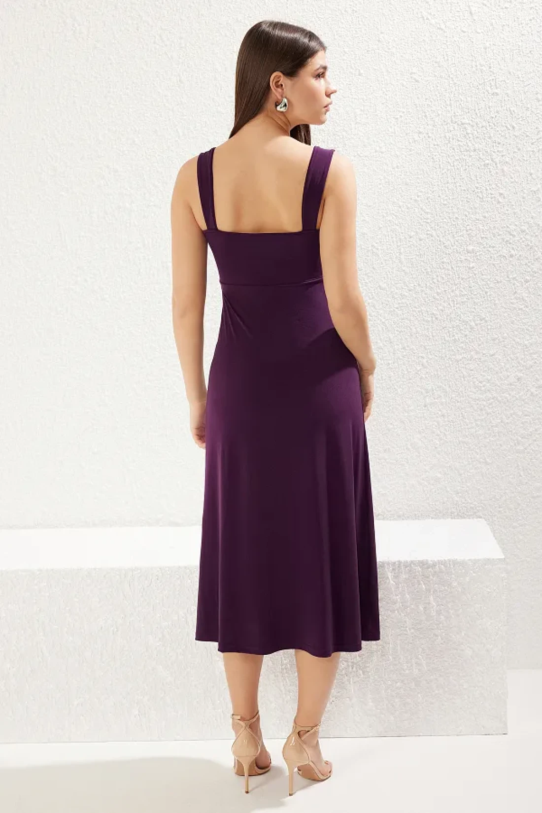 Collection فستان محبوك متوسط الطول قابل للتمدد على شكل حرف A من البرقوق مع تفاصيل رباط/دروب TWOSS24EL00412