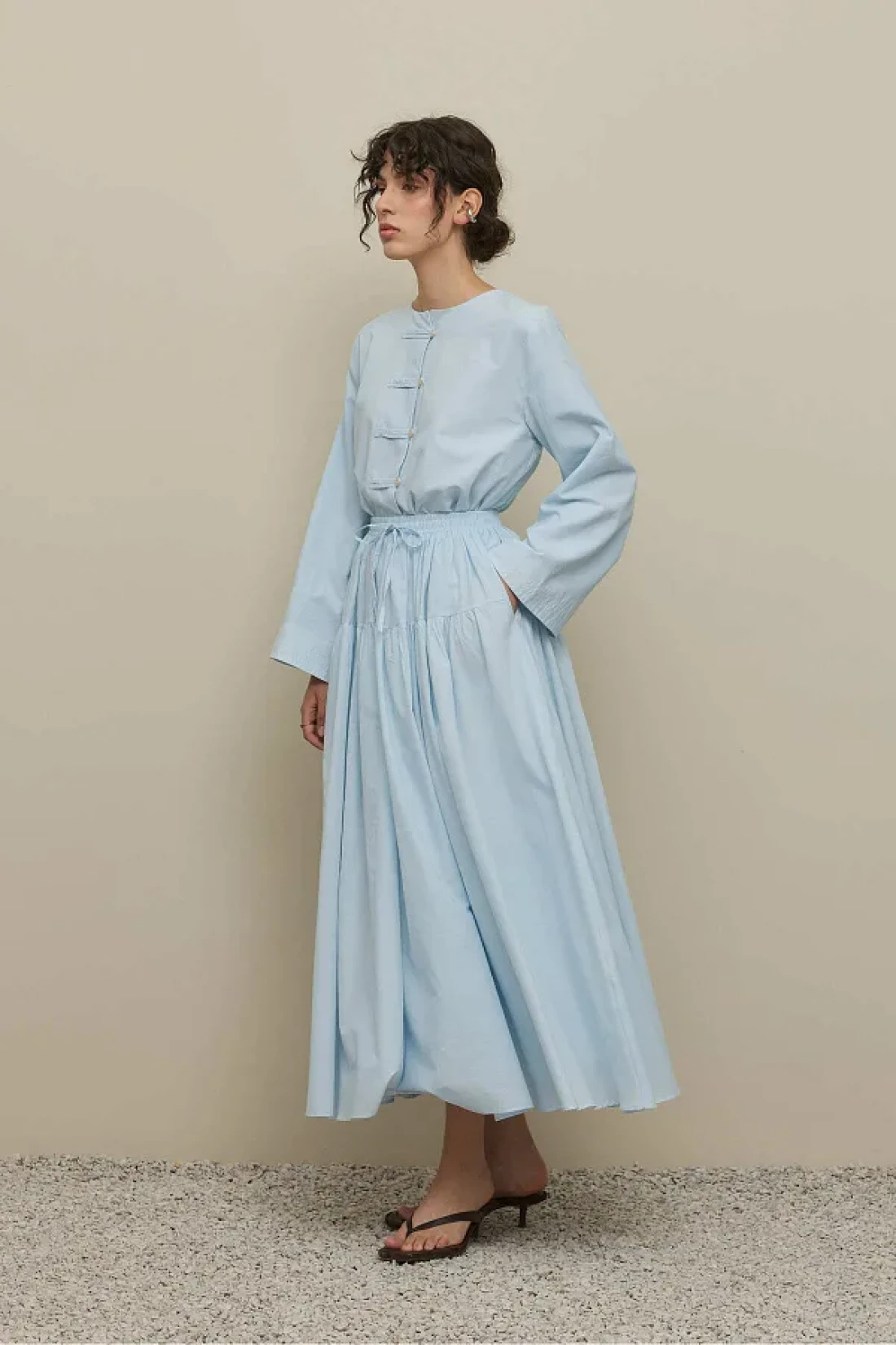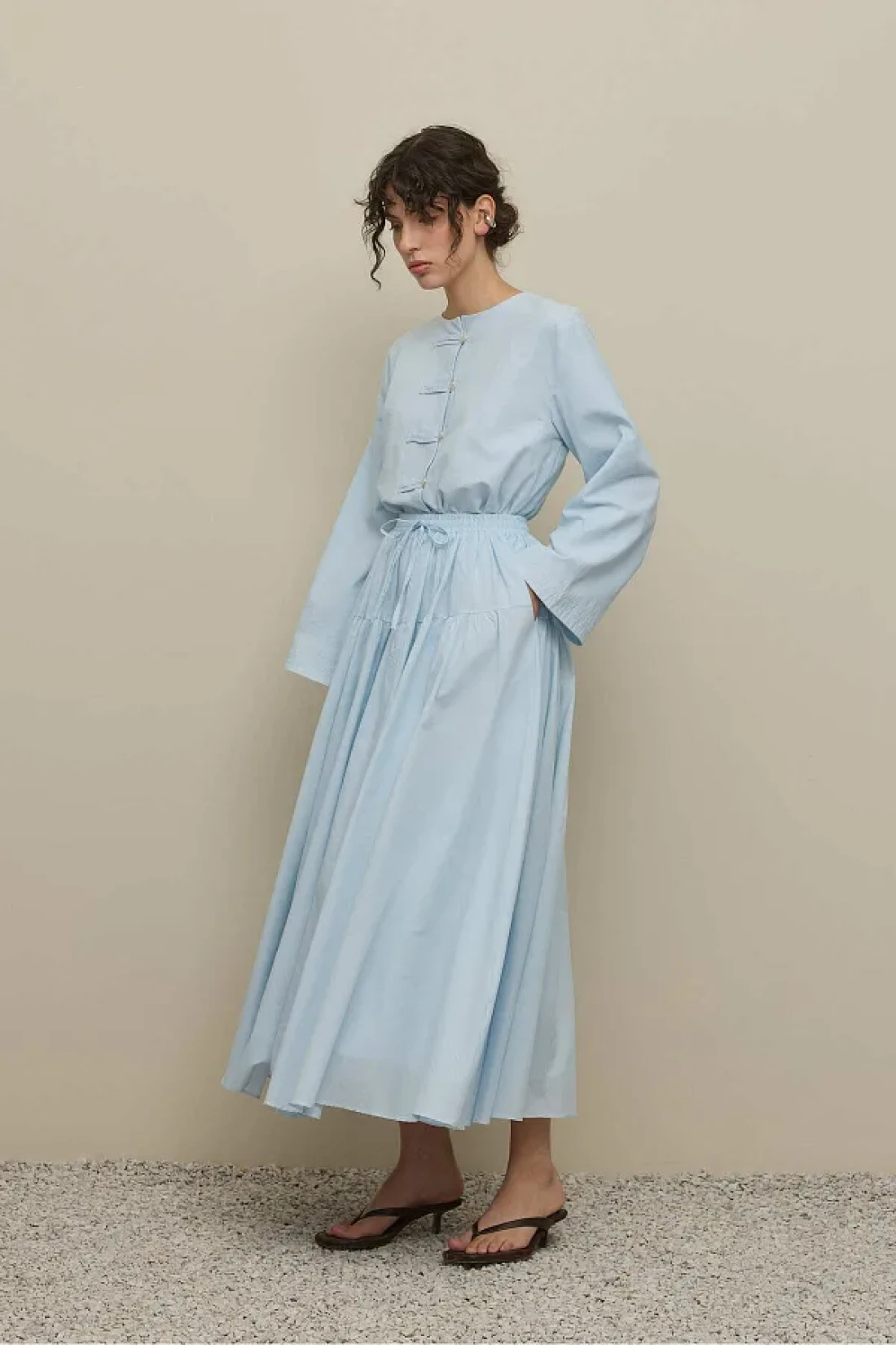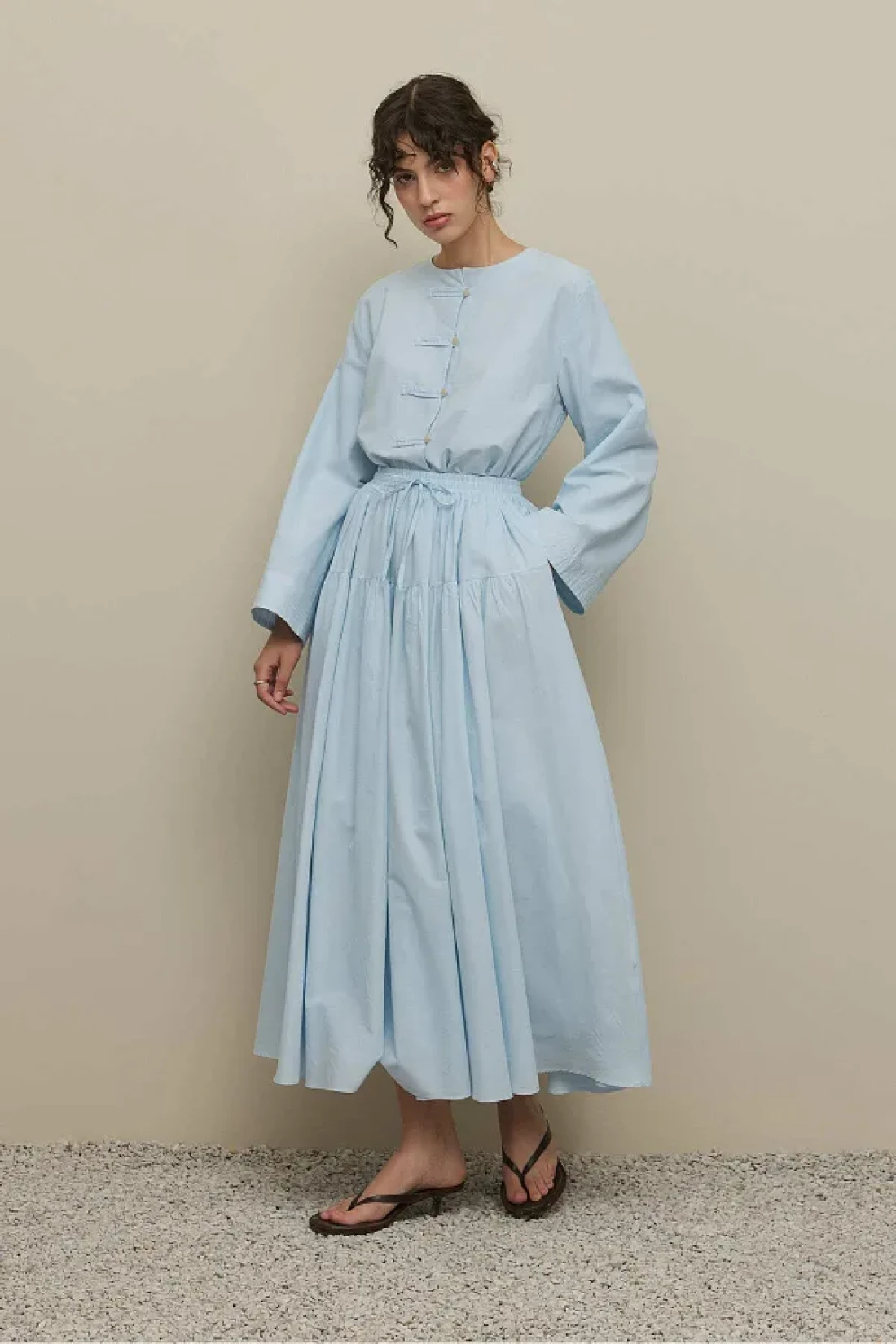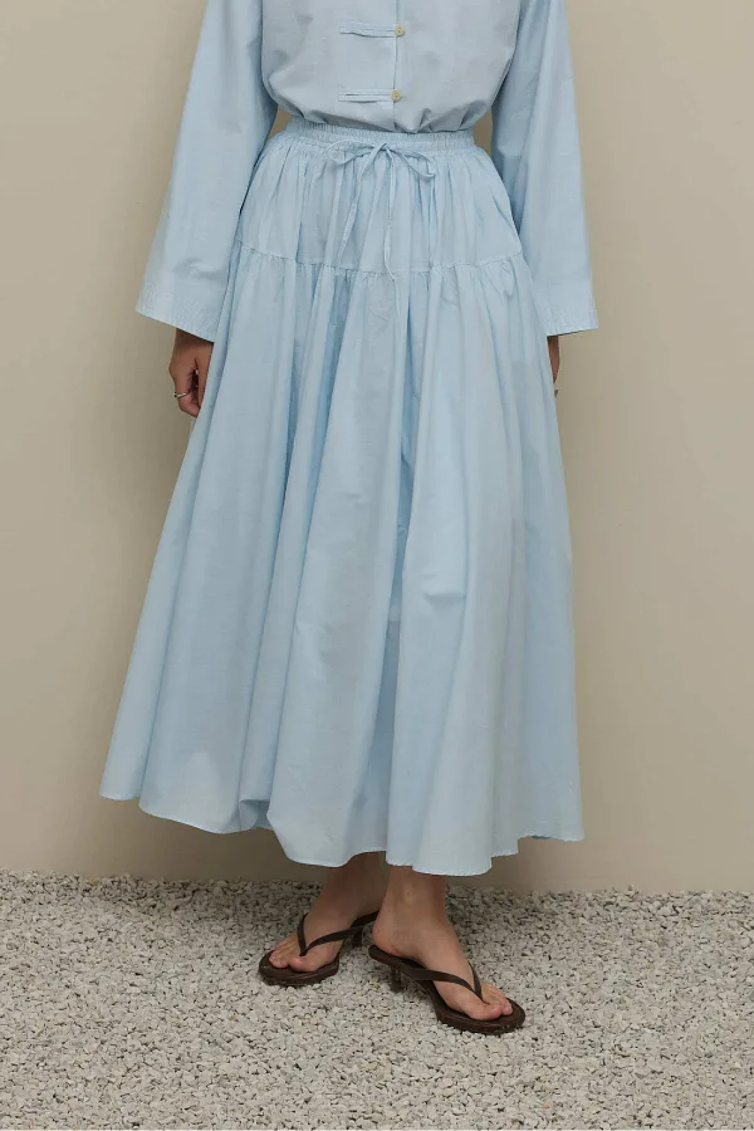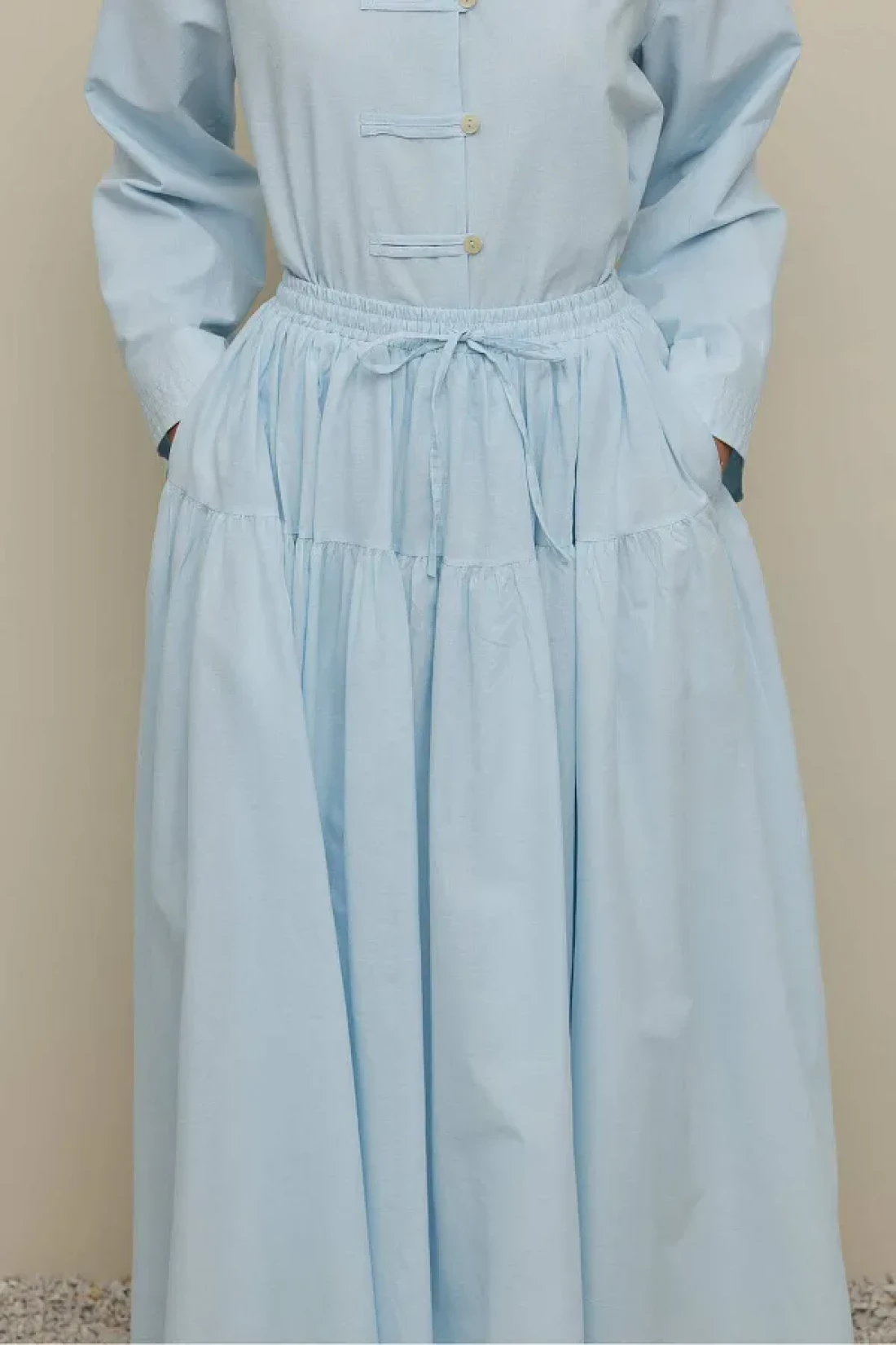 تنورة طويلة مصنوعة من قماش الفوال المنسوج بإحكام بنسبة 100٪ قطن، مع حزام خصر قابل للتعديل، مرنة، مكشكشة، مبطنة.