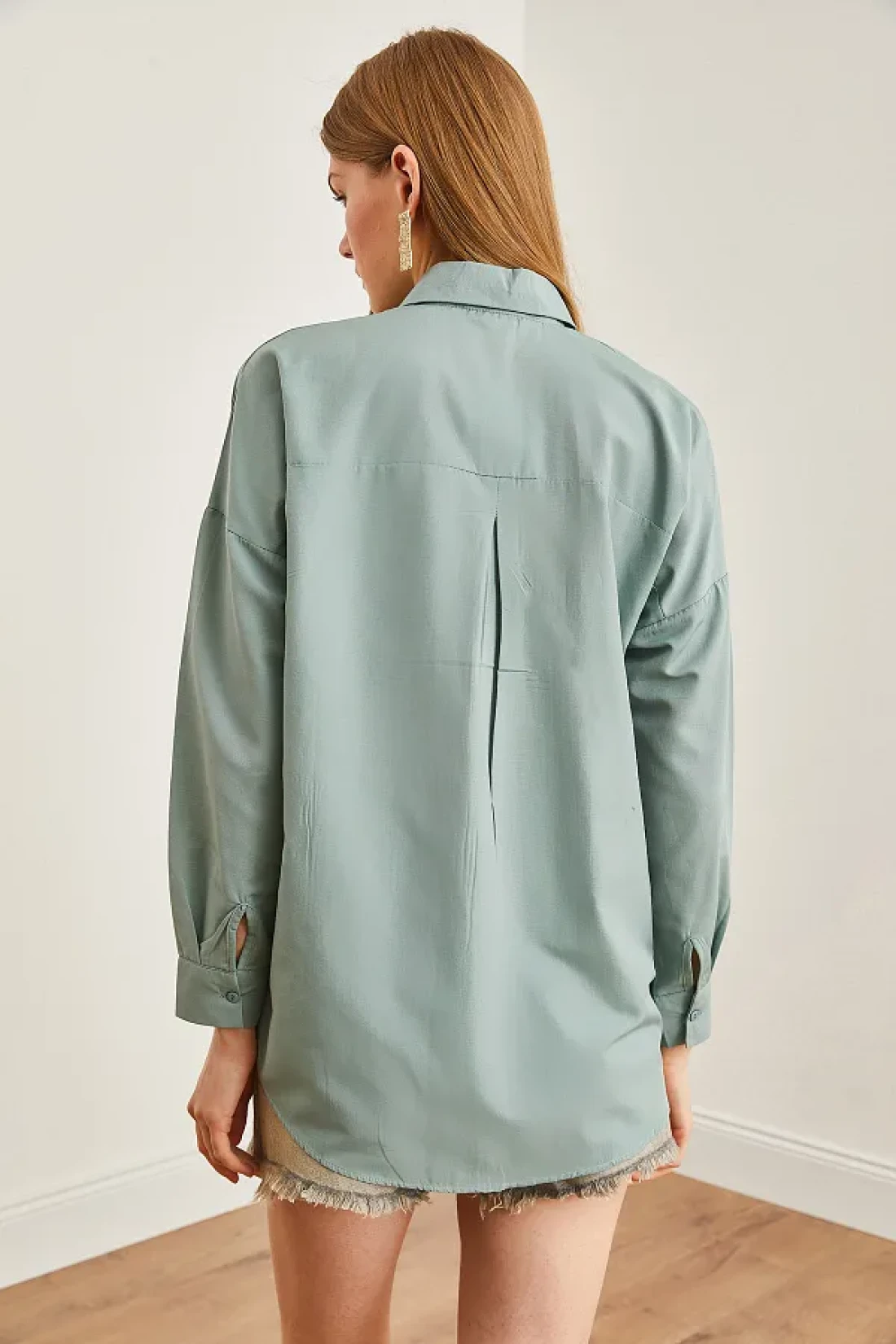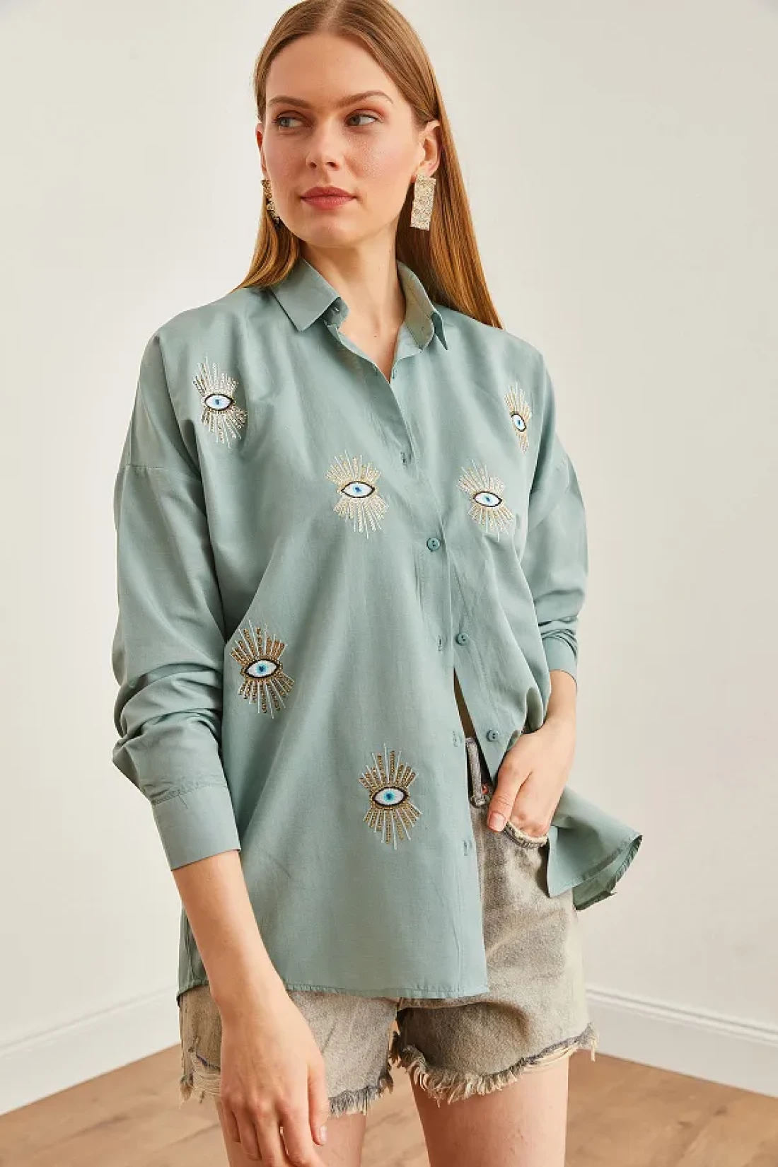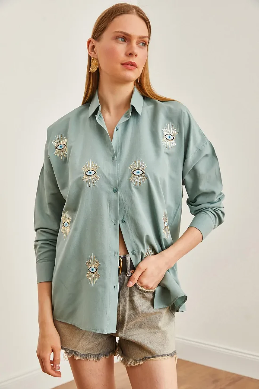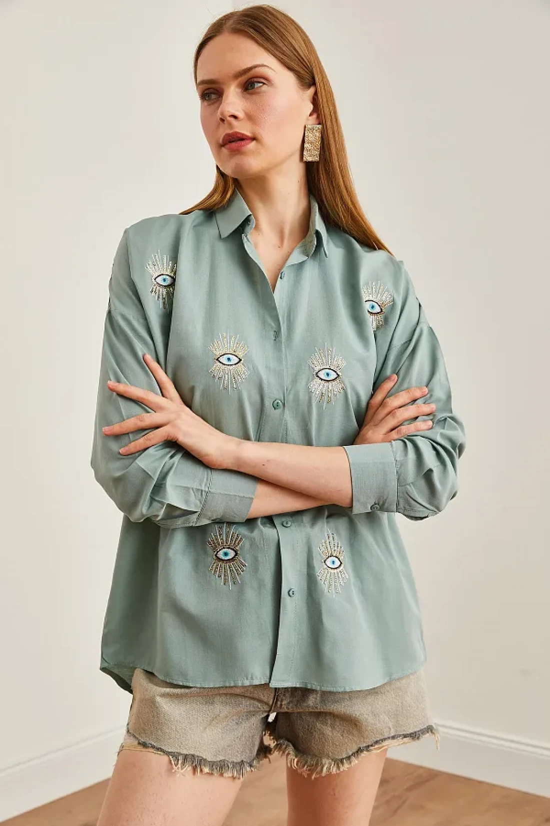 Olalook قميص Boyfriend نسائي مطرز باللون الأخضر - GML- 19000992