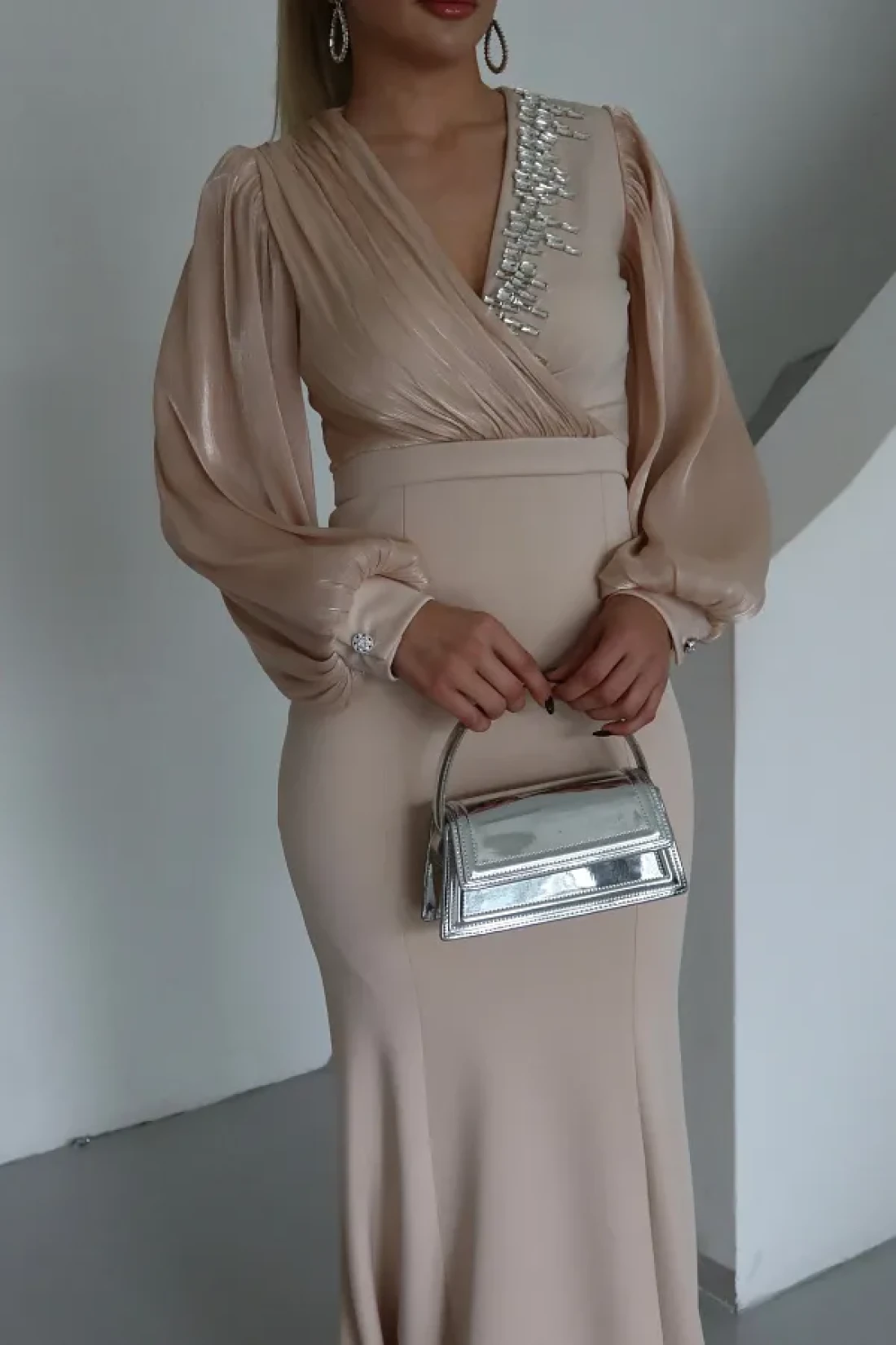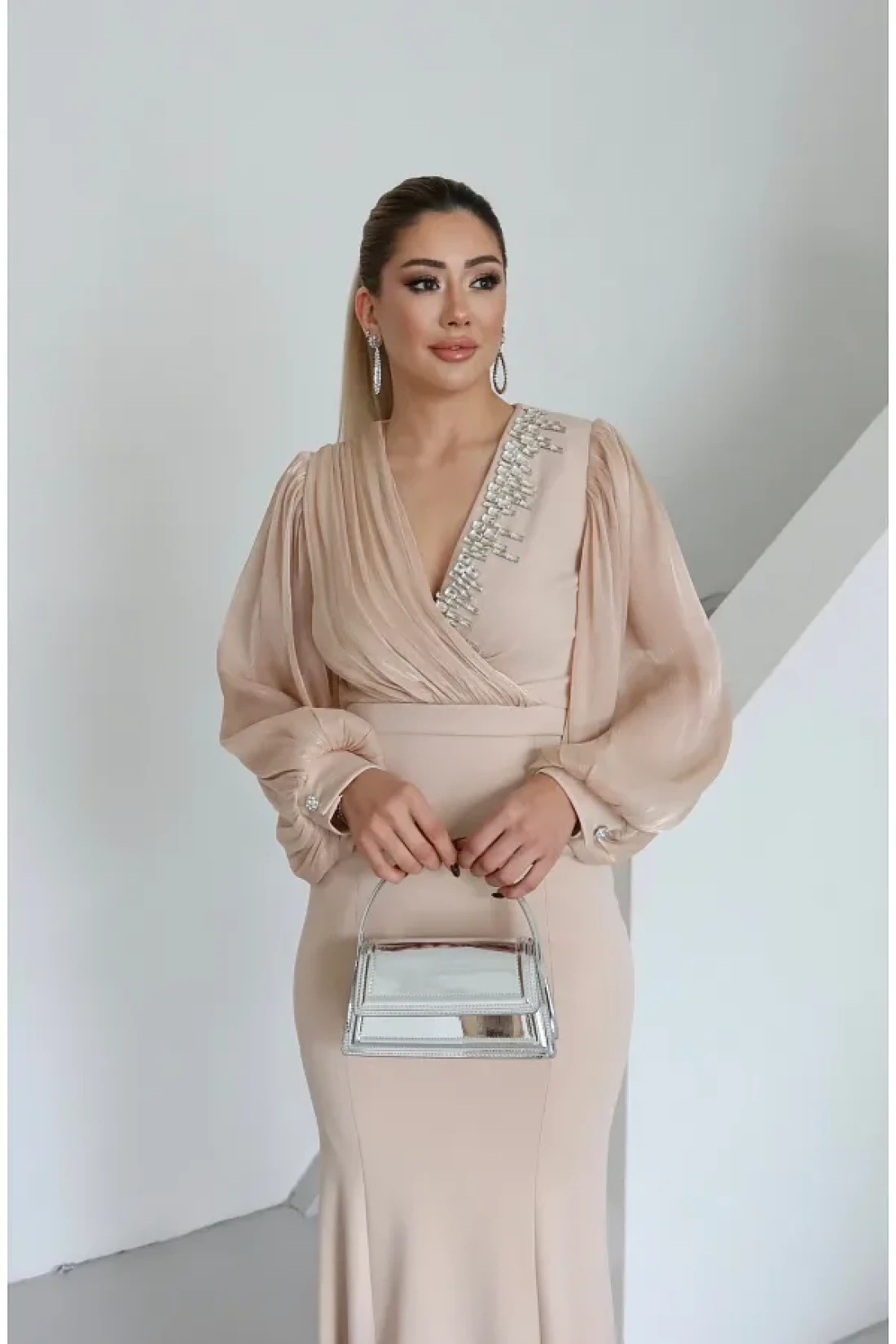 1Moda1Tarz فستان نسائي مستورد من قماش الكريب بأكمام وصدر شيفون مطرز بالأحجار بتصميم خاص