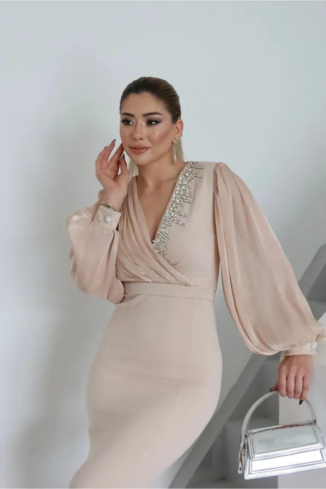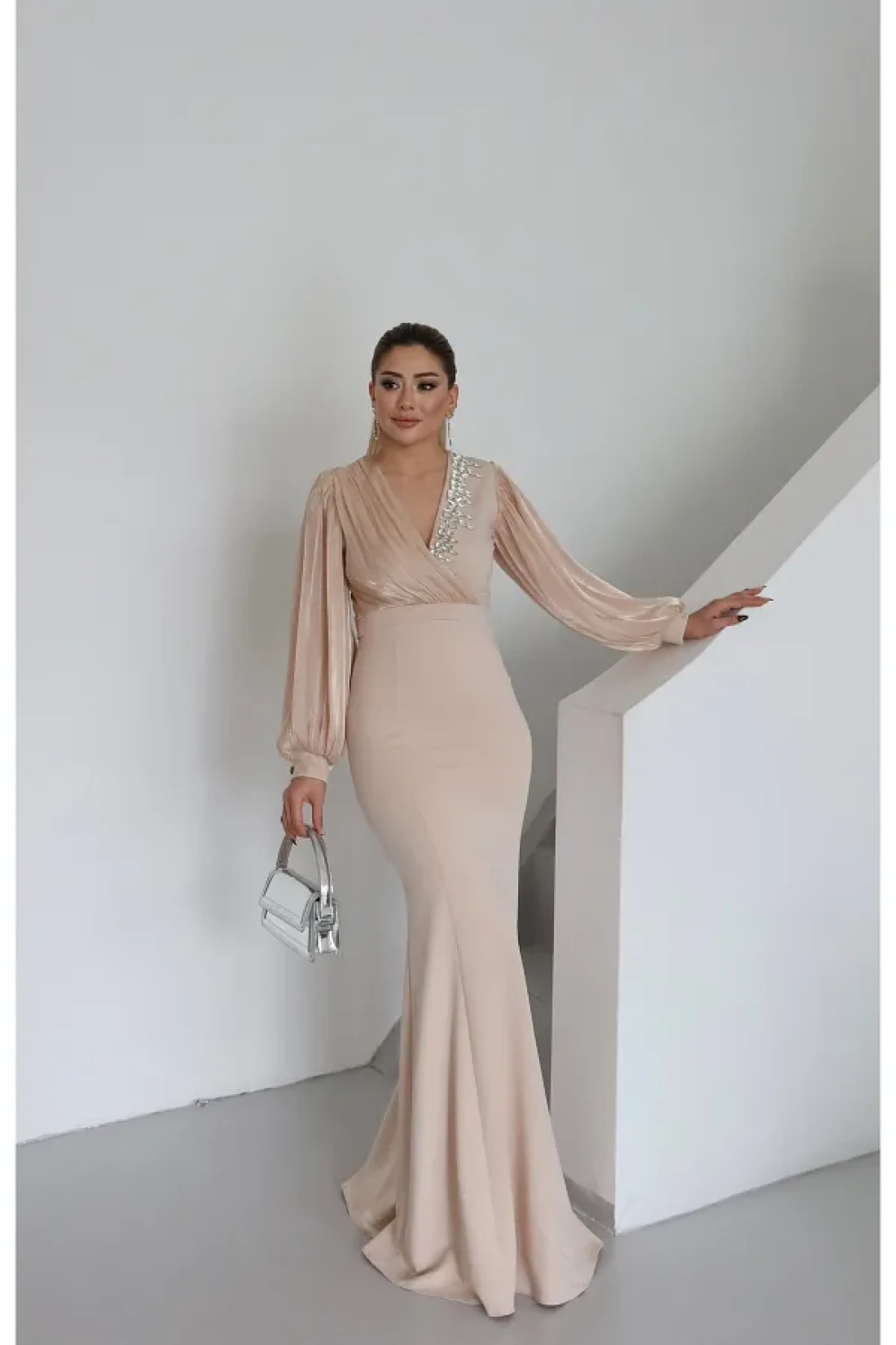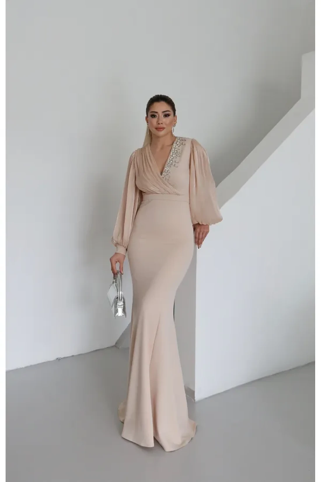 - فستان بتصميم خاص مصنوع من قماش كريب سكوبا المستورد، يوفر الأناقة والراحة معًا. تم إعطاء مظهر جذاب مع تطريز الحجر على تفاصيل الصدر والذراع. بفضل هيكلها المبطن، يمكنك استخدامها براحة؛ لا يظهر من الداخل. إنه خيار مثالي للتحولات الموسمية بفضل قماشه المتوسط السمك. - يأخذ مكانه في خزانة ملابسك كقطعة خالدة يمكنك اختيارها في كل موسم.