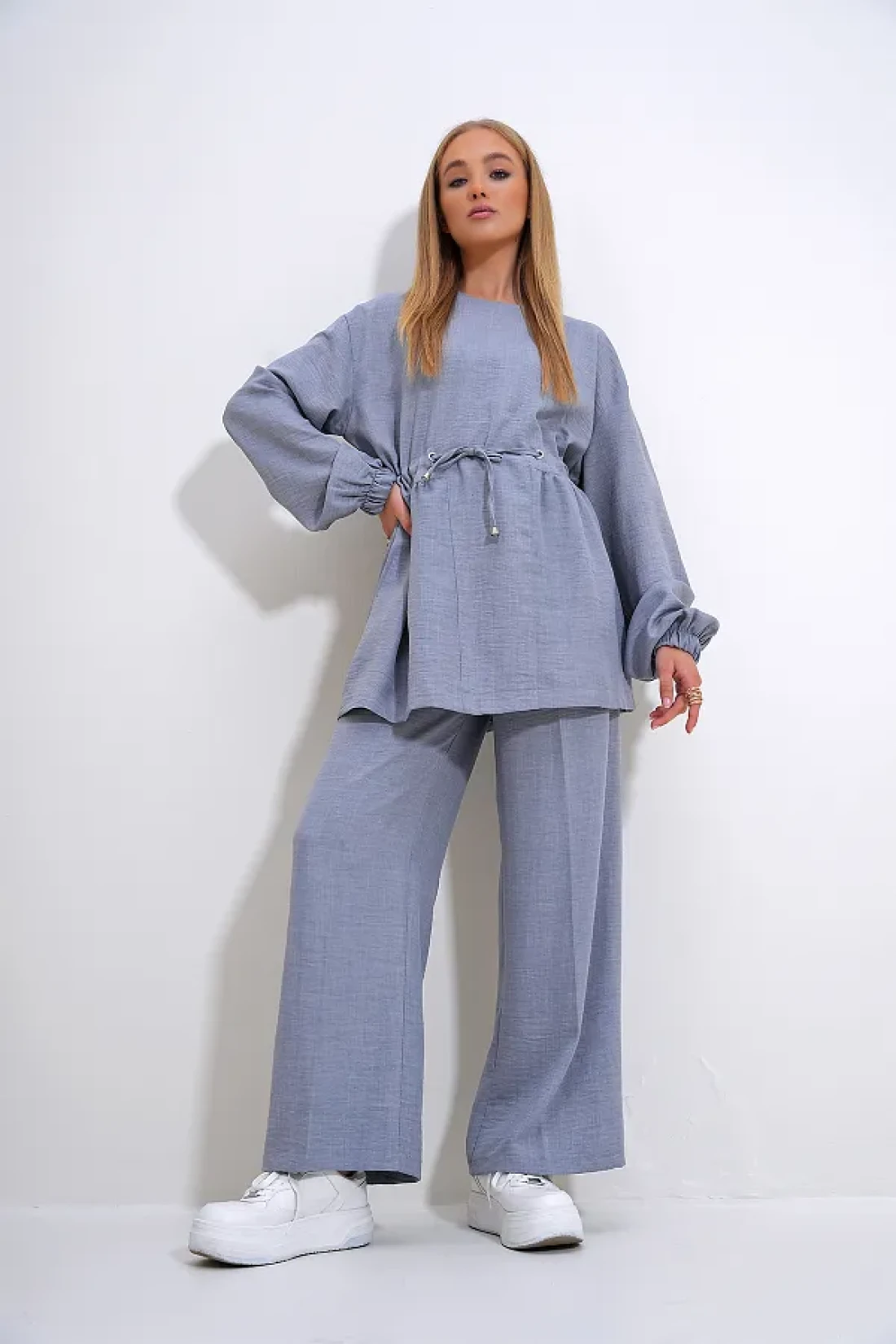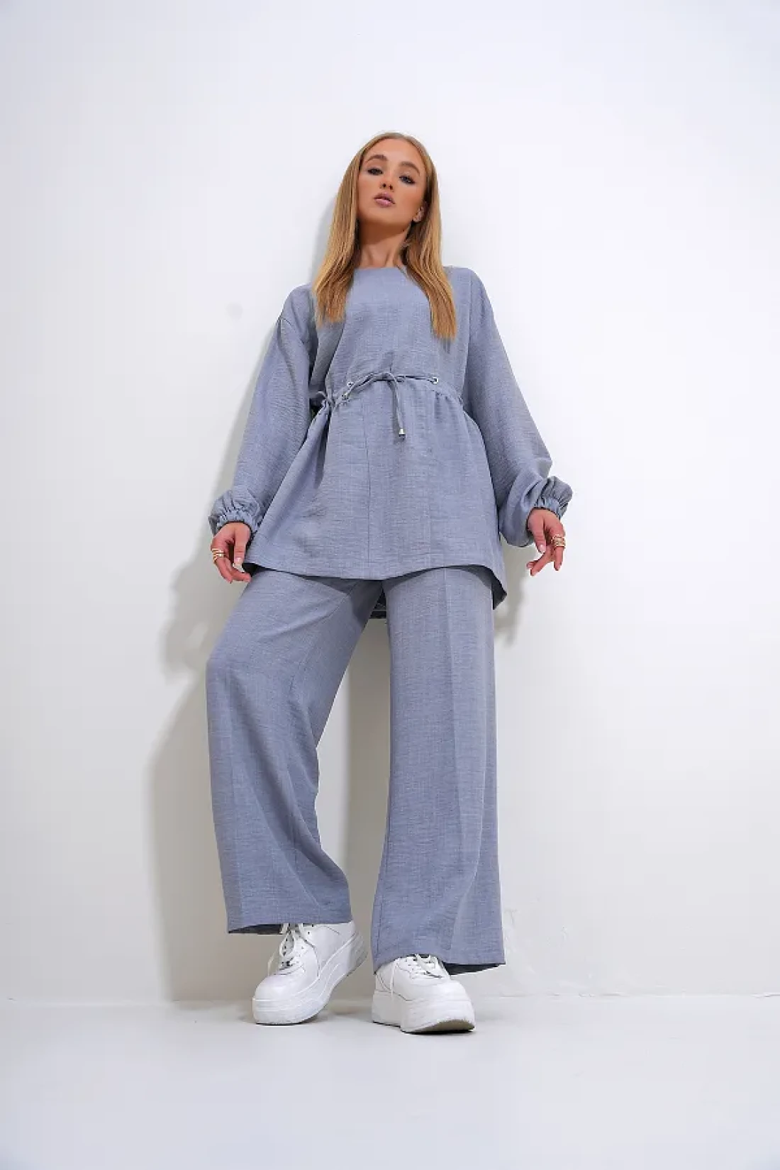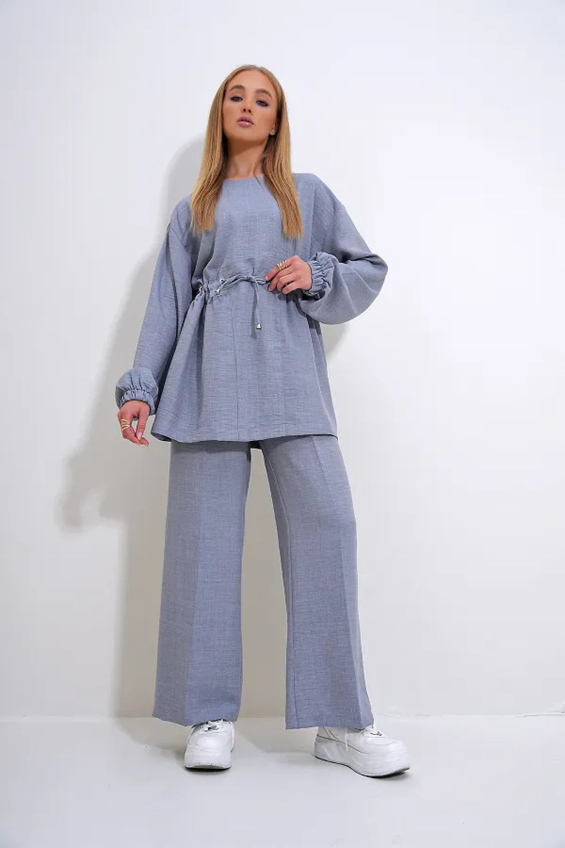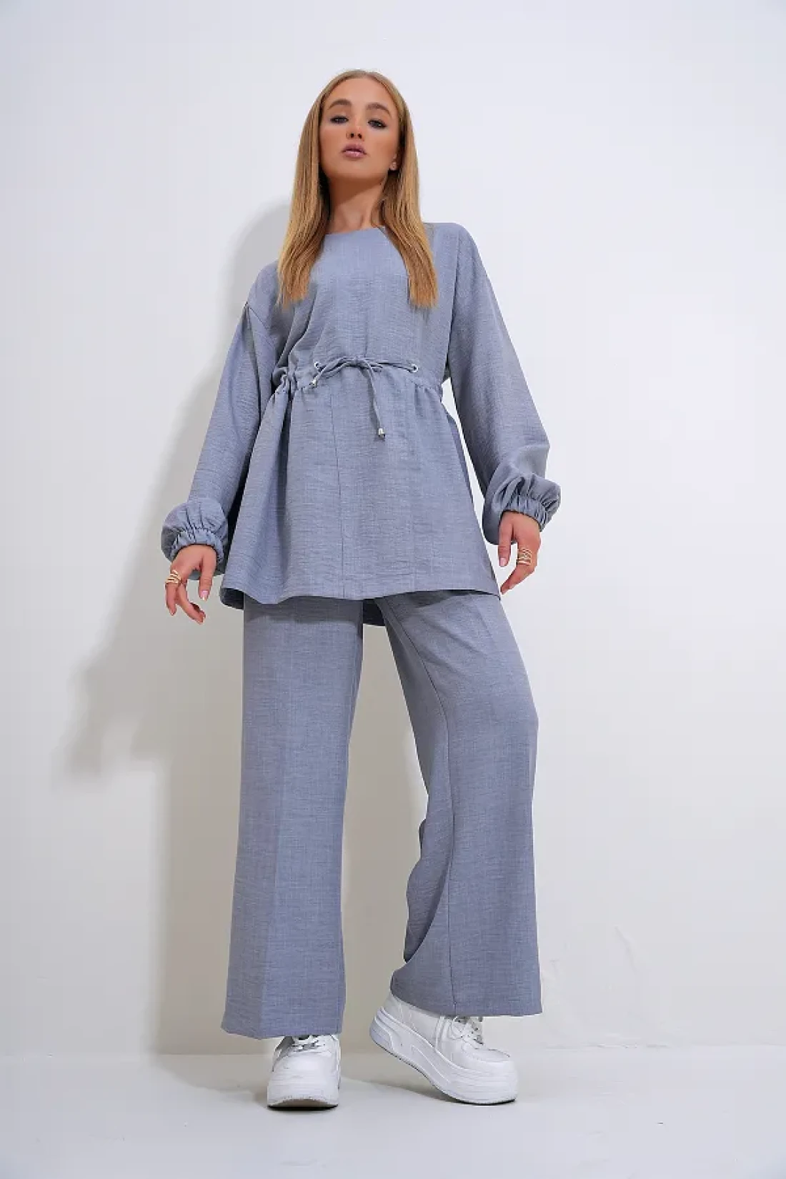 Trend Alaçatı Stili طقم بنطلون نسائي باللون الرمادي من Palazzo Tunic برقبة دائرية - ALC-X12299