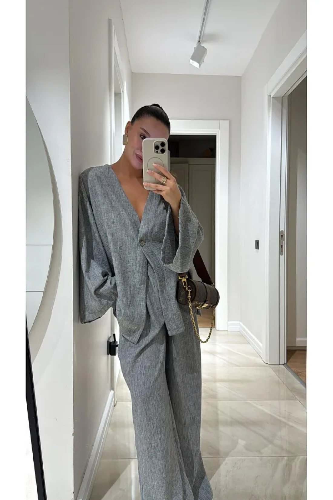 Lady Pixie طقم بنطلون بلوزر من الكتان بزر واحد