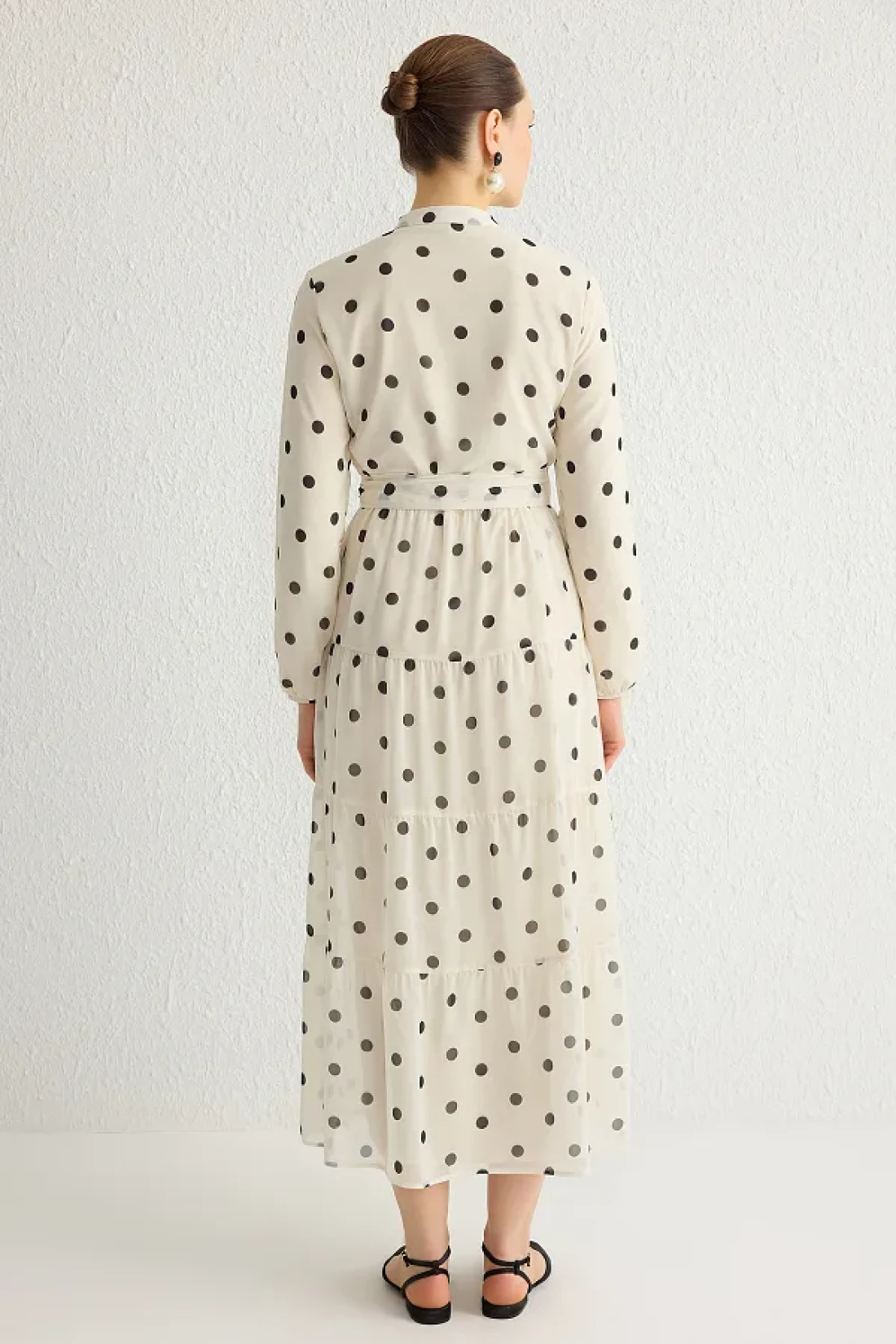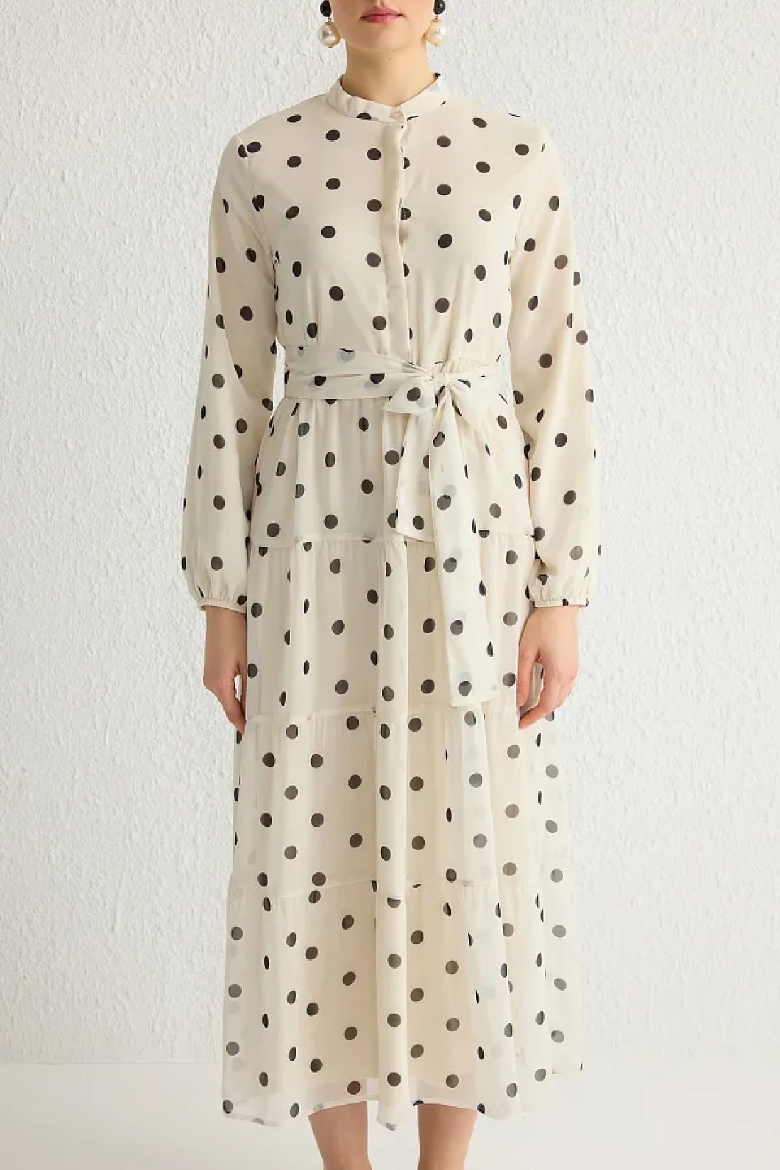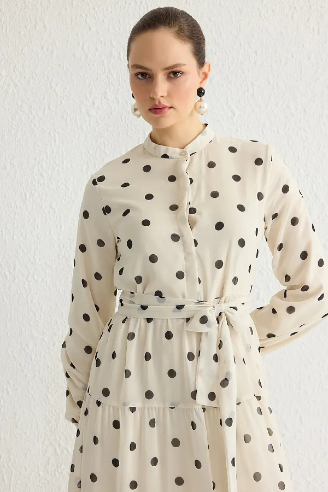 Modest فستان منسوج من الشيفون باللون البيج الفاتح مع حزام وياقة واقفة TCTSS21EL3346