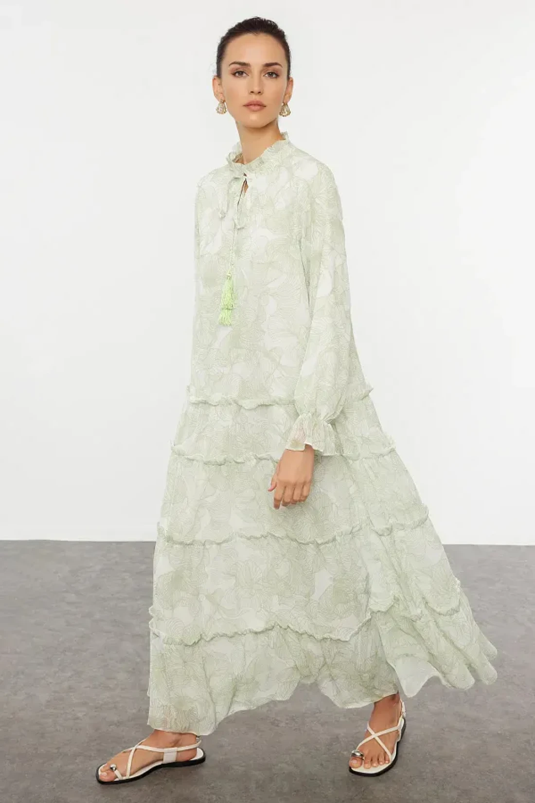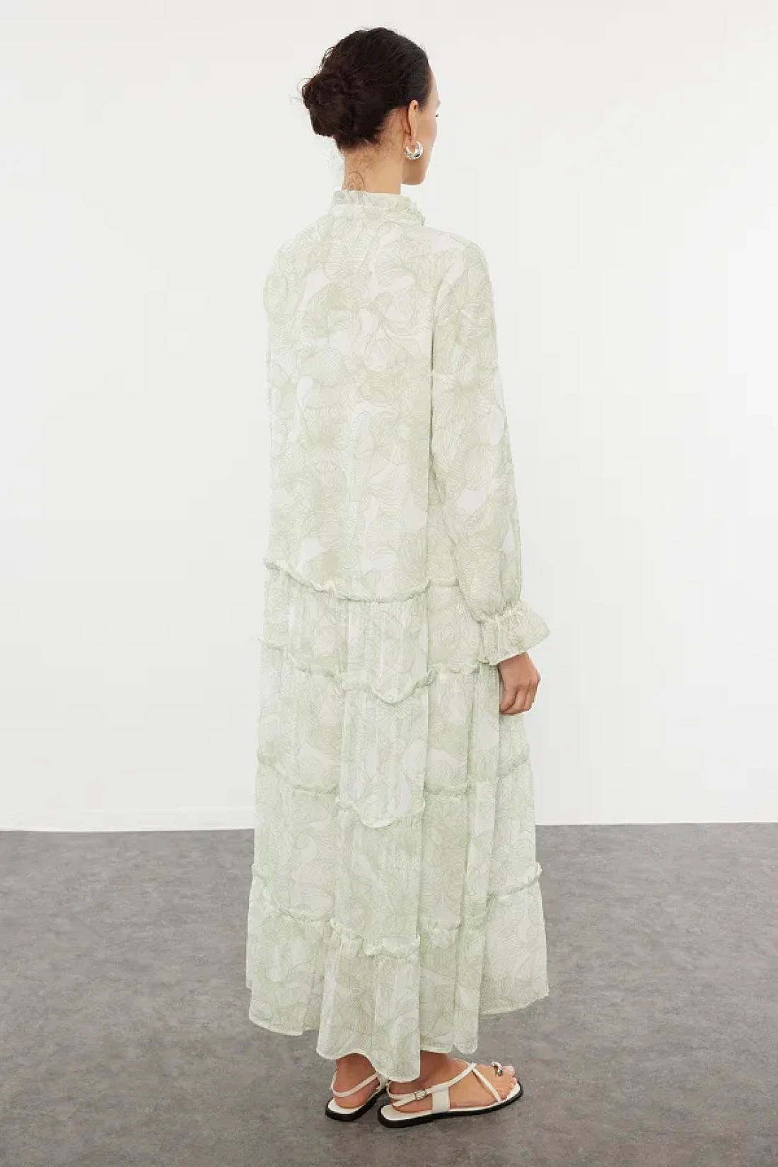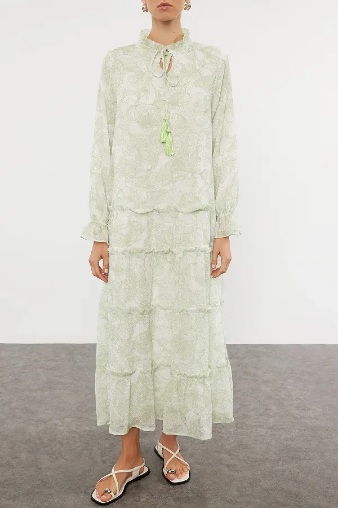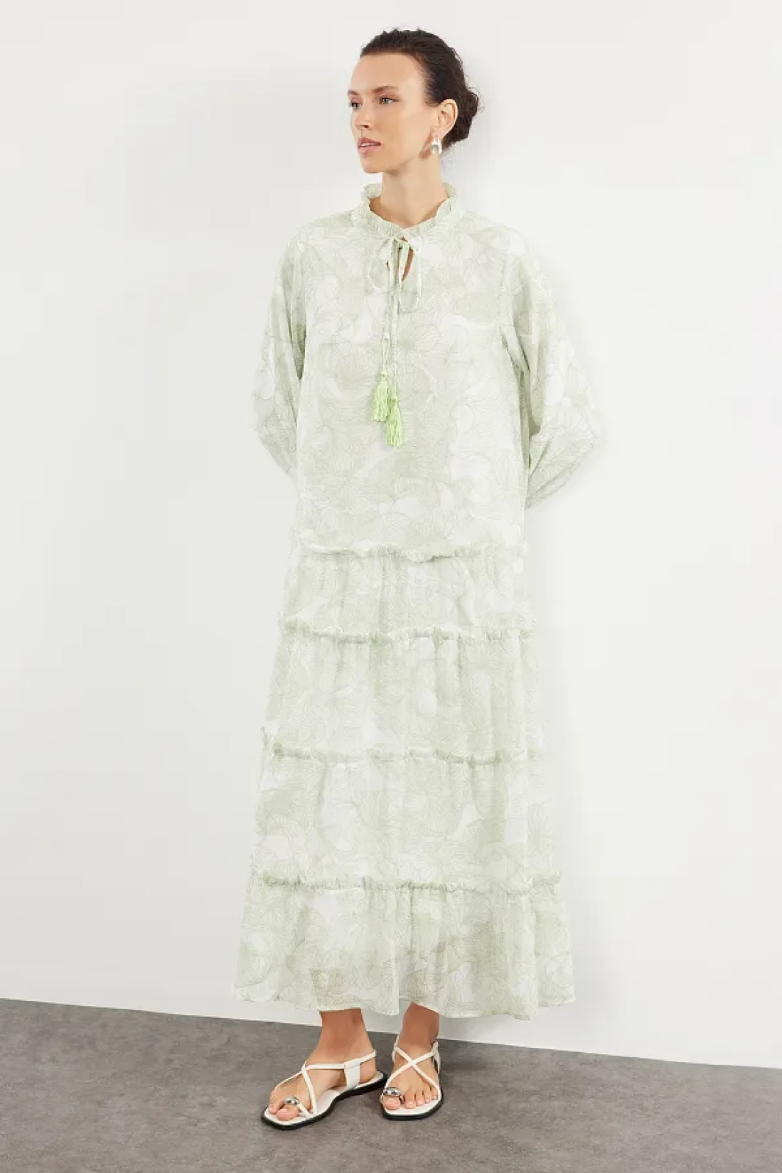 Modest فستان من الشيفون المنسوج باللون الكاكي بطباعة الزهور TCTSS24EB00281