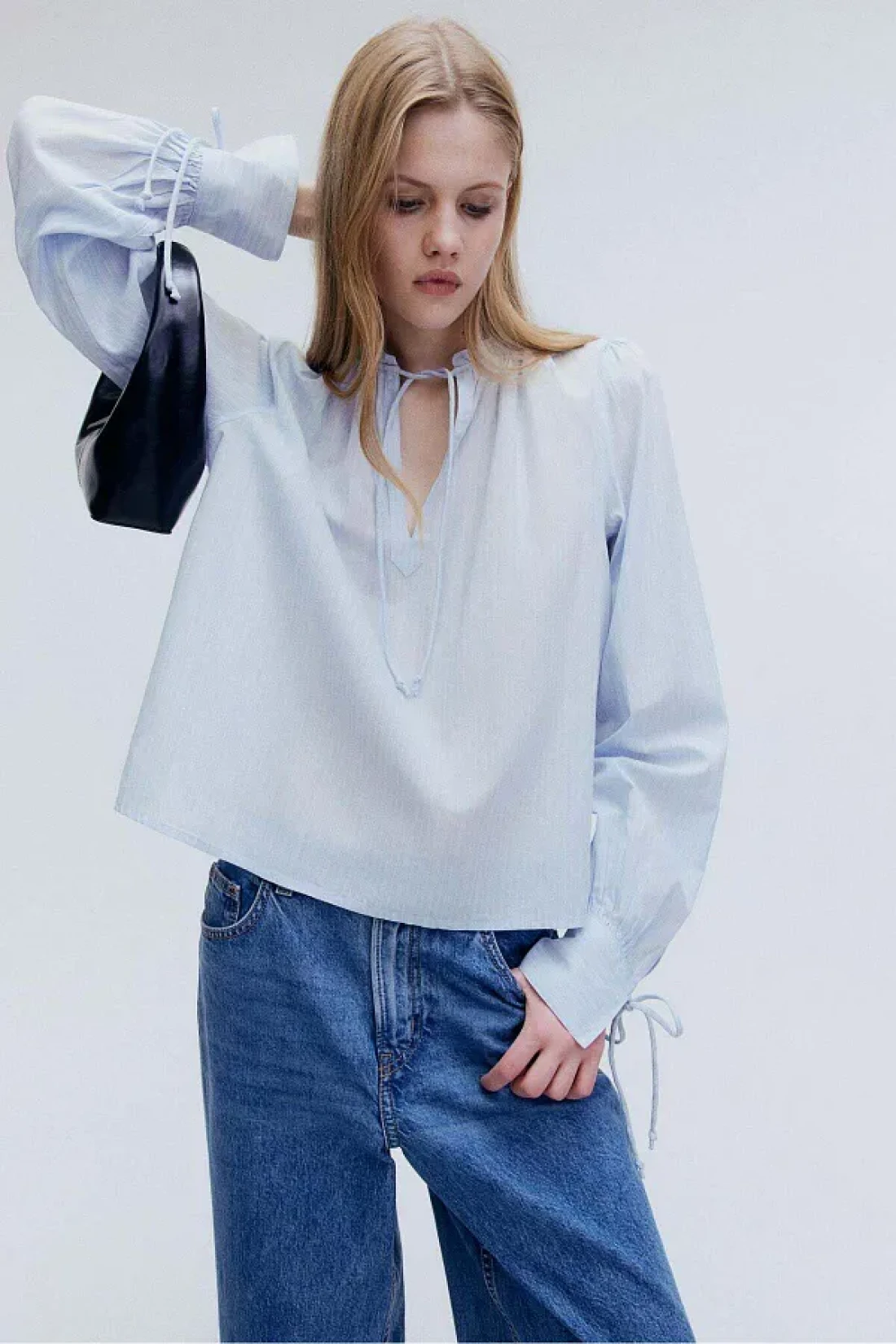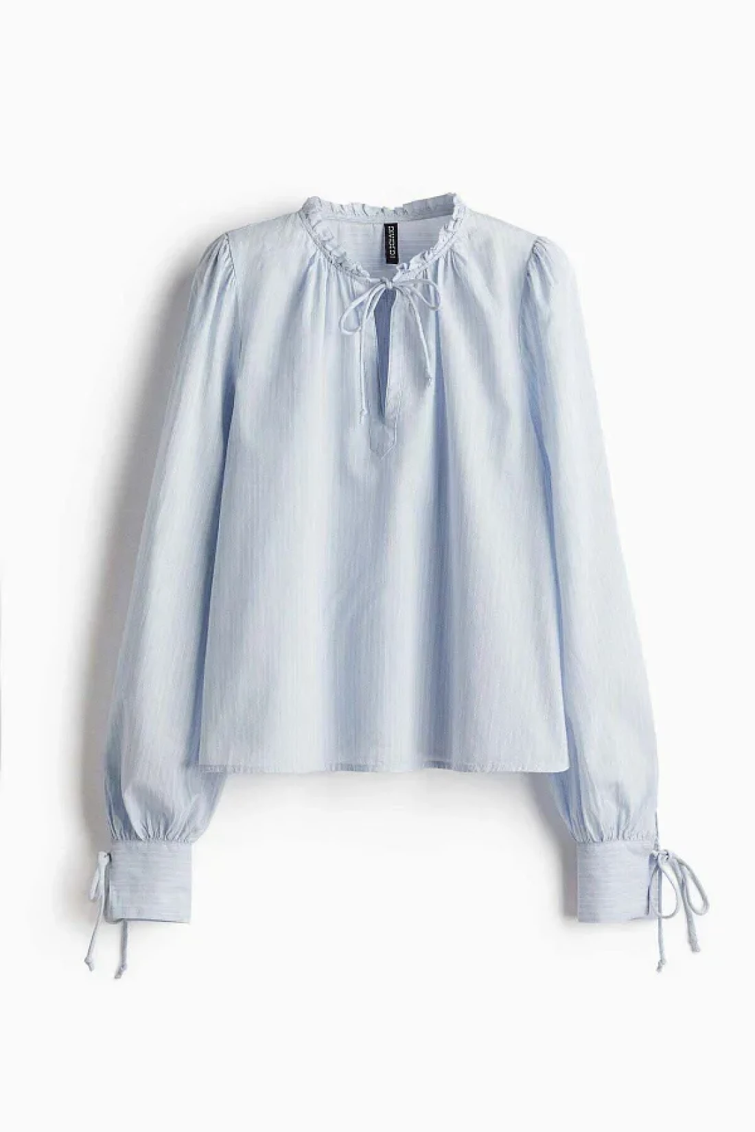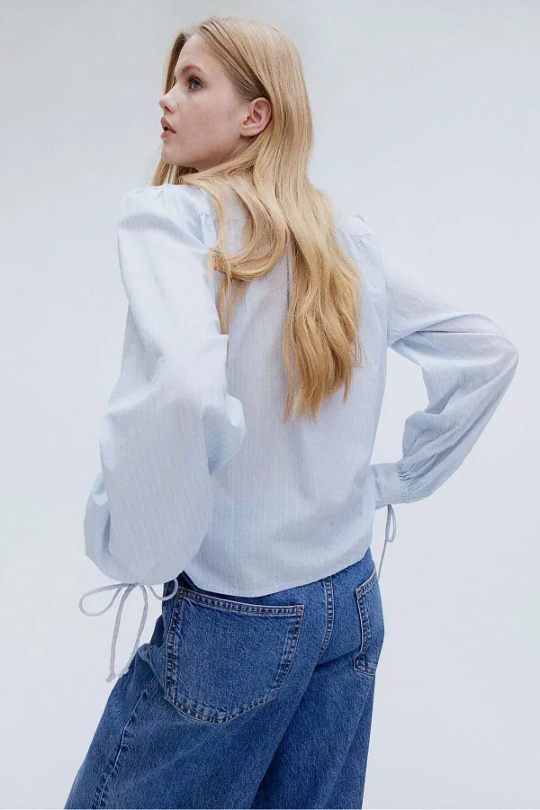 بلوزة من نسيج قطني خفيف الوزن تتميز بياقة مكشكشة ورباط وفتحة على شكل حرف V في الأمام. نير مجمع في الخلف وأكمام طويلة منفوخة ذات أساور واسعة مع سلك رباط. حاشية مستقيمة مع شق صغير على كل جانب.